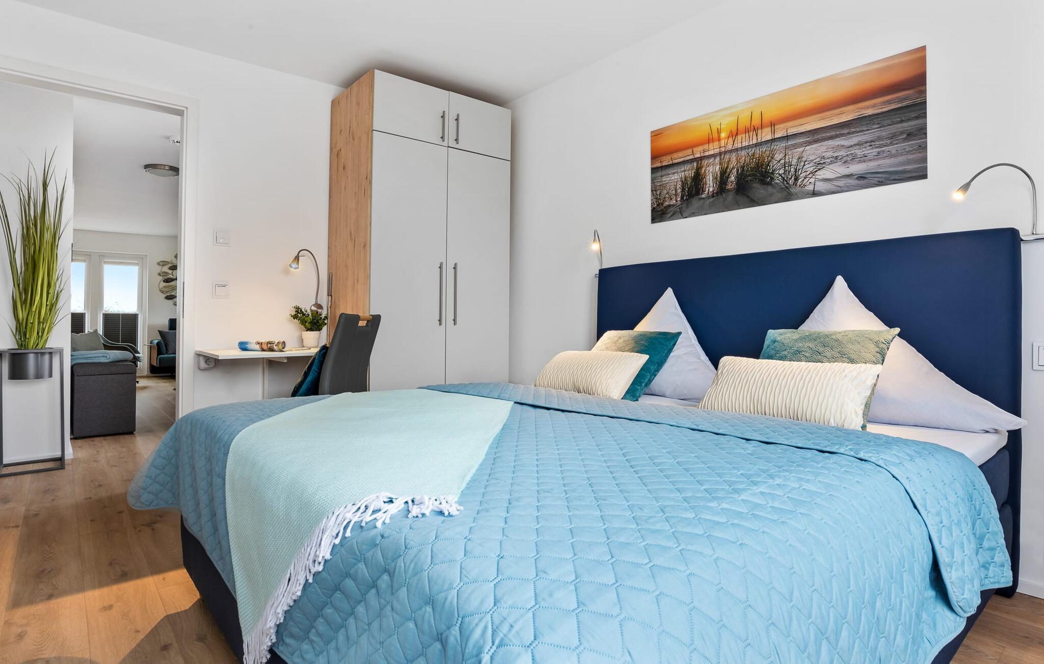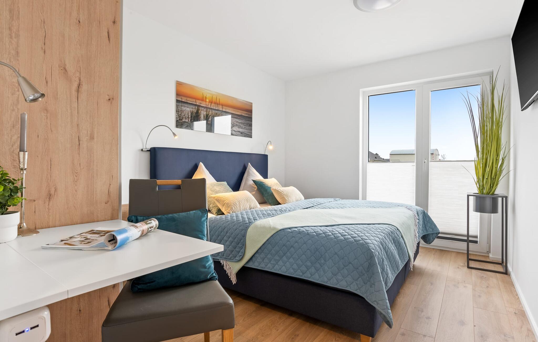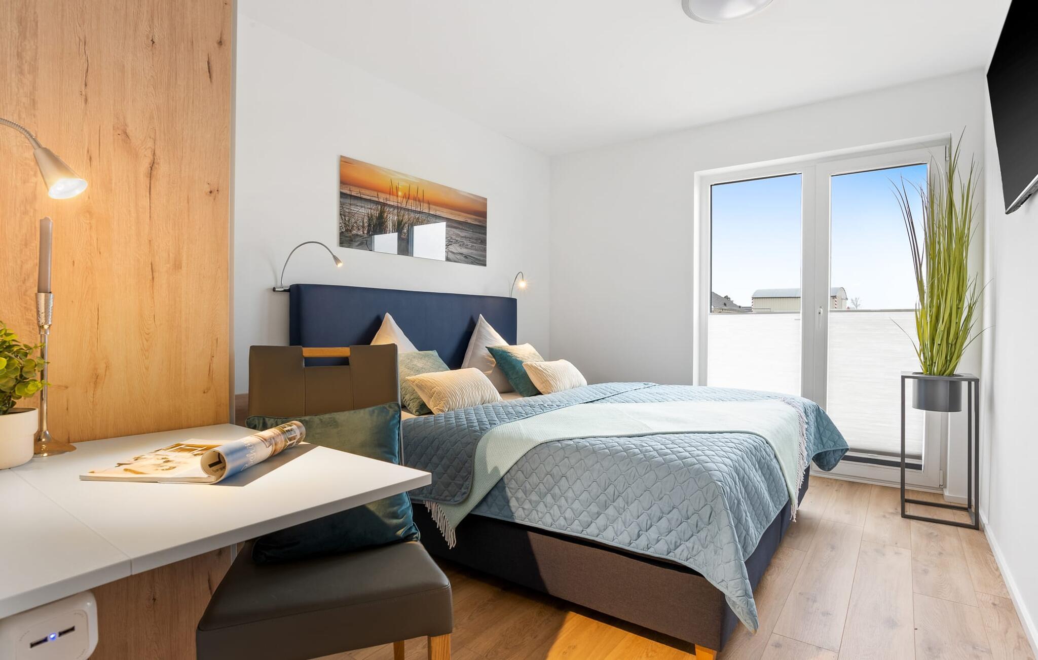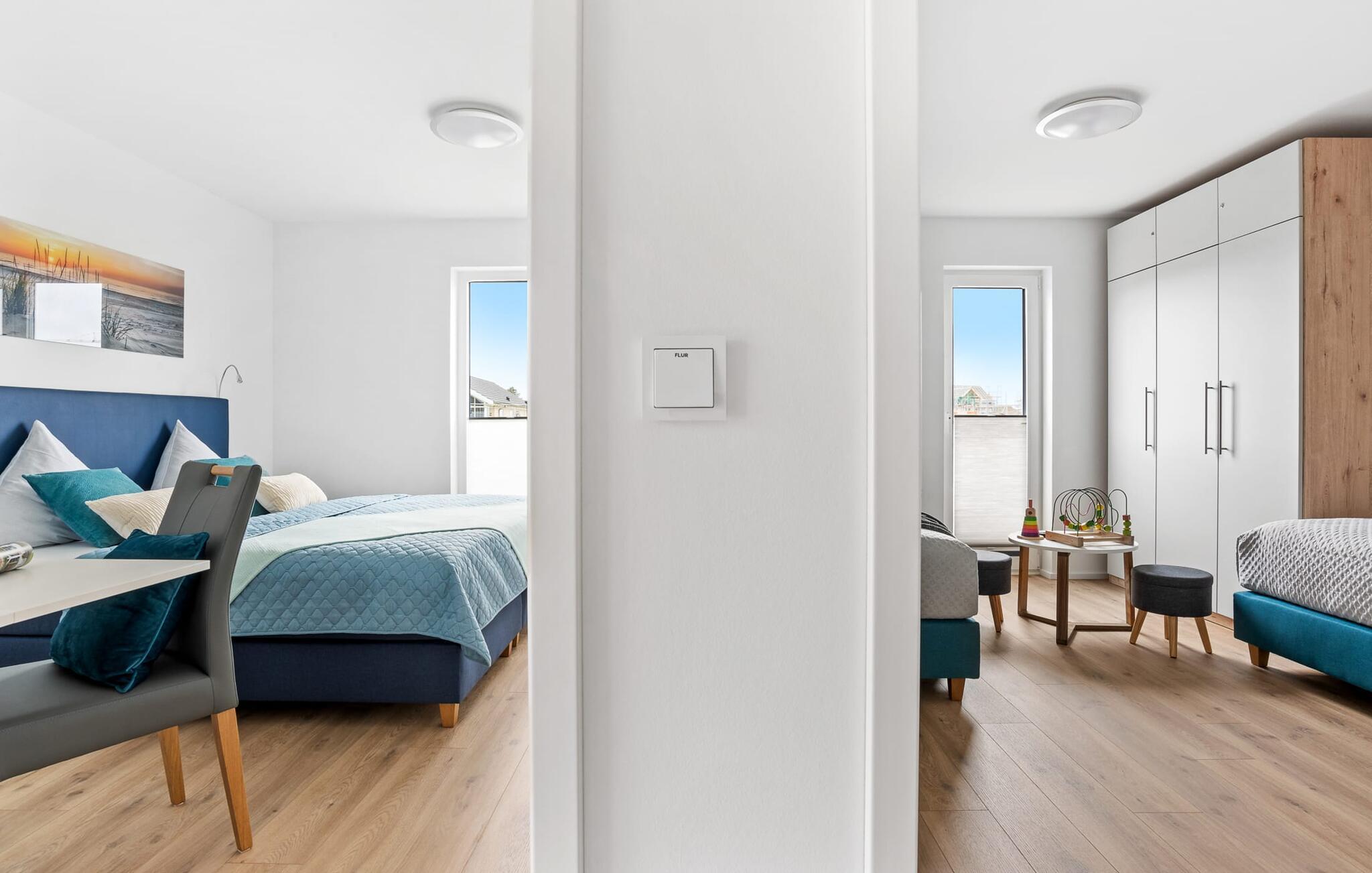 Bevidst væk fra familielivet i stuen tilbyder LÜTTES GLÜCK en arbejdsplads i soveværelset til alle, der ønsker at bo hjemmefra selv på ferie.
