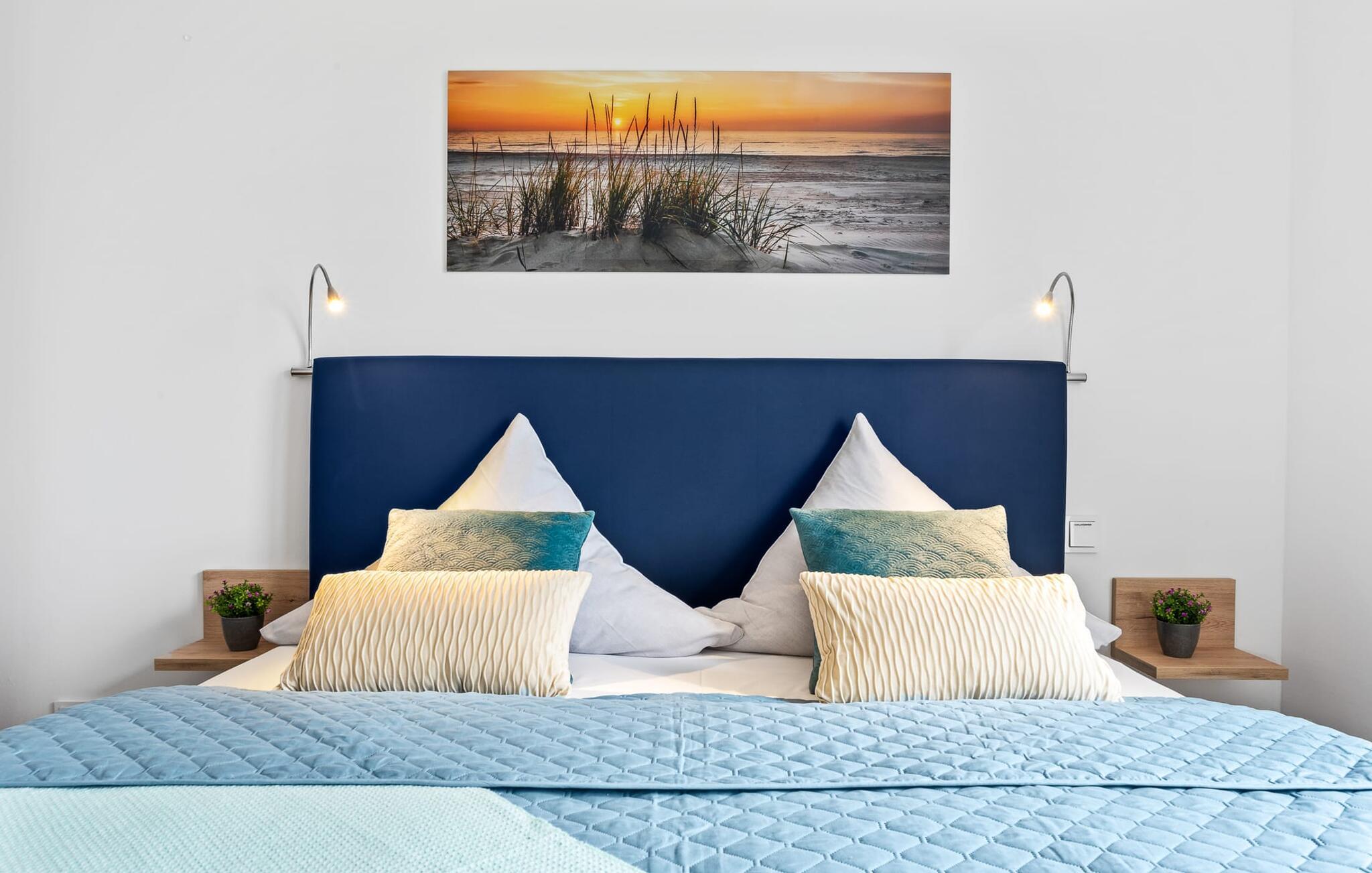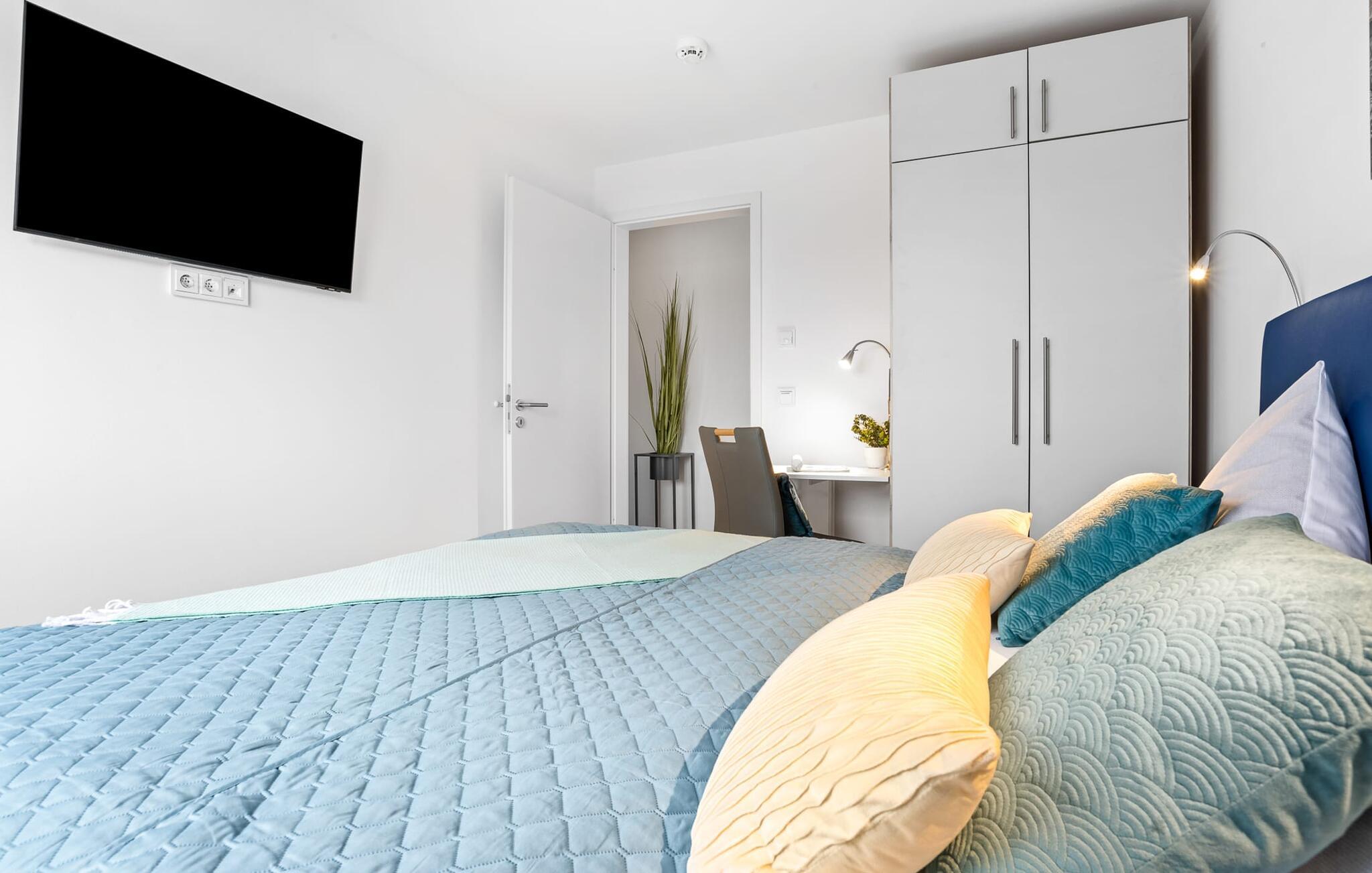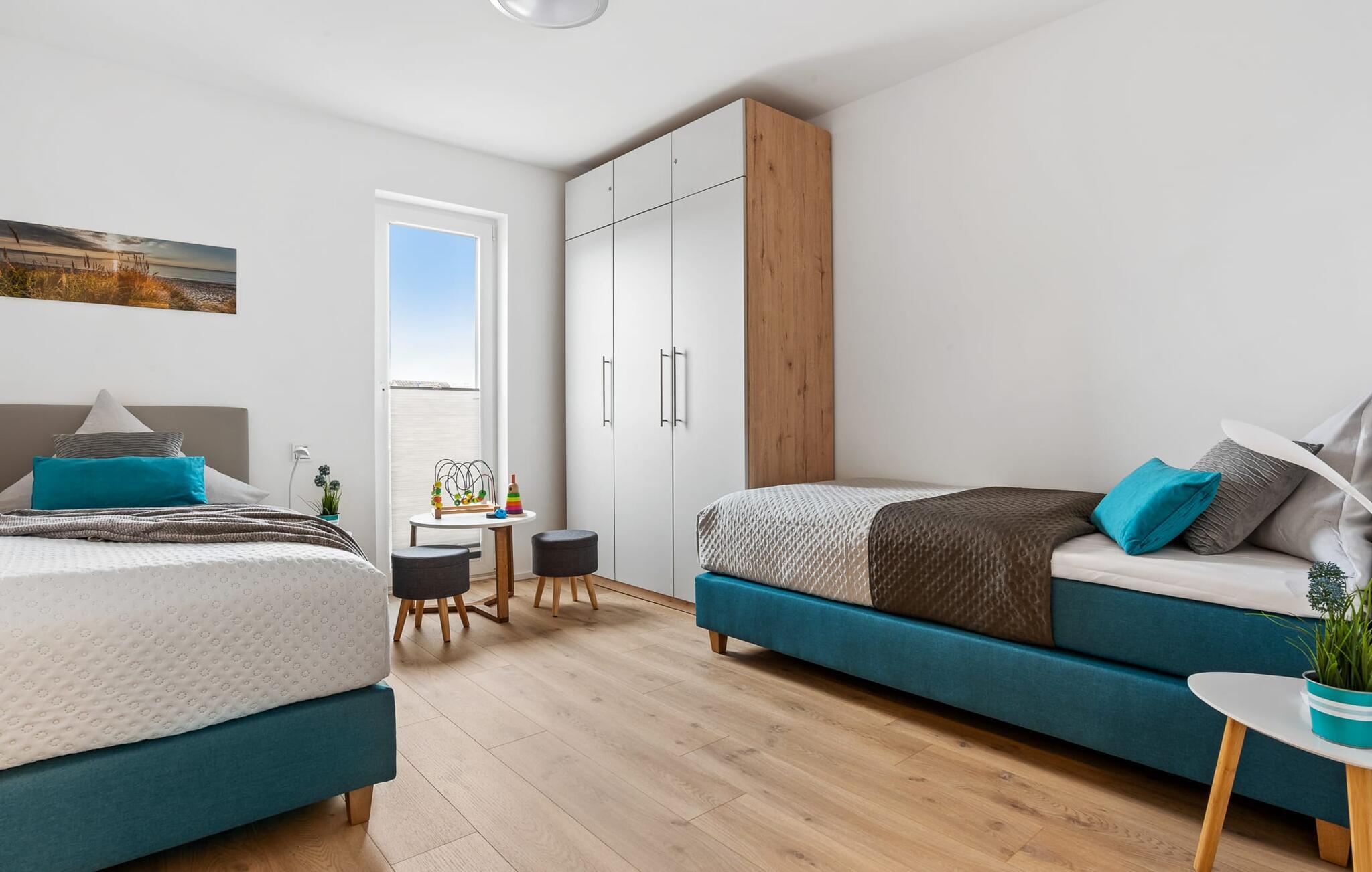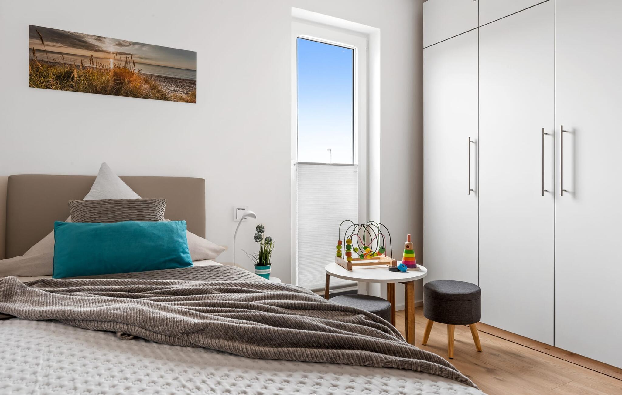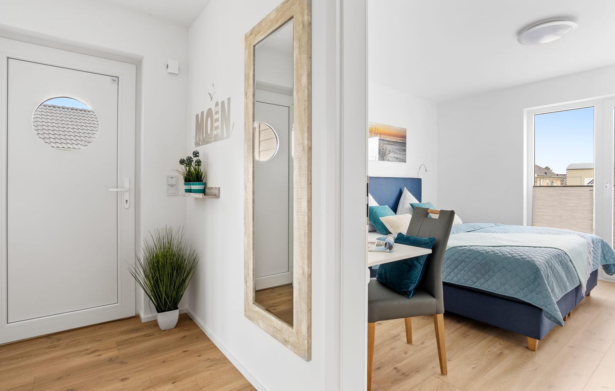 Bevidst væk fra familielivet i stuen tilbyder LÜTTES GLÜCK en arbejdsplads i soveværelset til alle, der ønsker at bo hjemmefra selv på ferie.