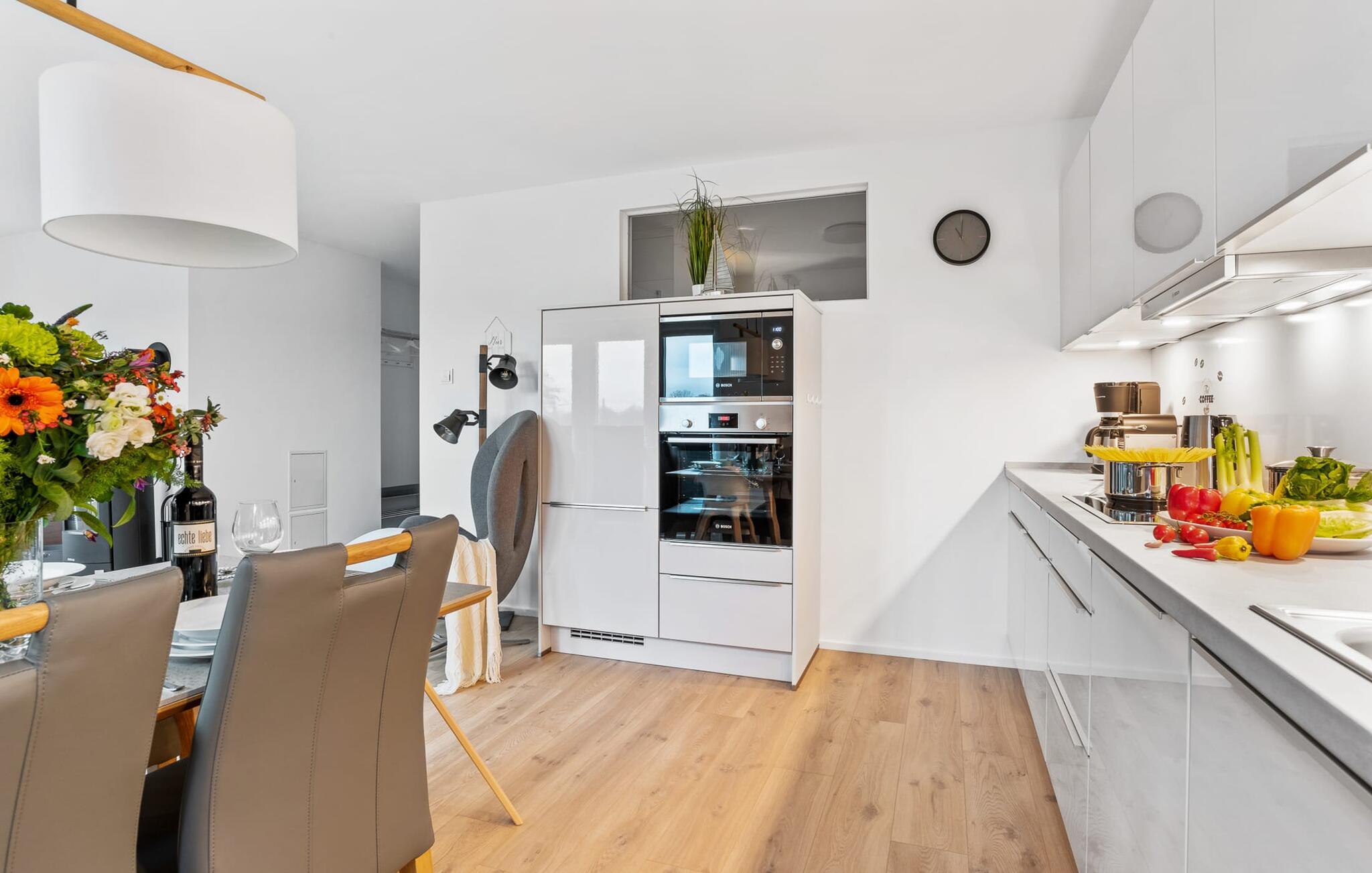 Med sin gulv til loft-vinduesfront og den store tilstødende terrasse er det åbne stue/alrum lejlighedens hjerte. At komme ind her og straks føle sig hjemme er én ting. At slappe af i den hyggelige opholdsstue, nyde naturens fred og ro ud af vinduet eller se tv er ren afslapning og afslapning! Hverdagen bliver mere og mere fjern – i sandhed en DEJLIG LYKKE til en skøn ferie.