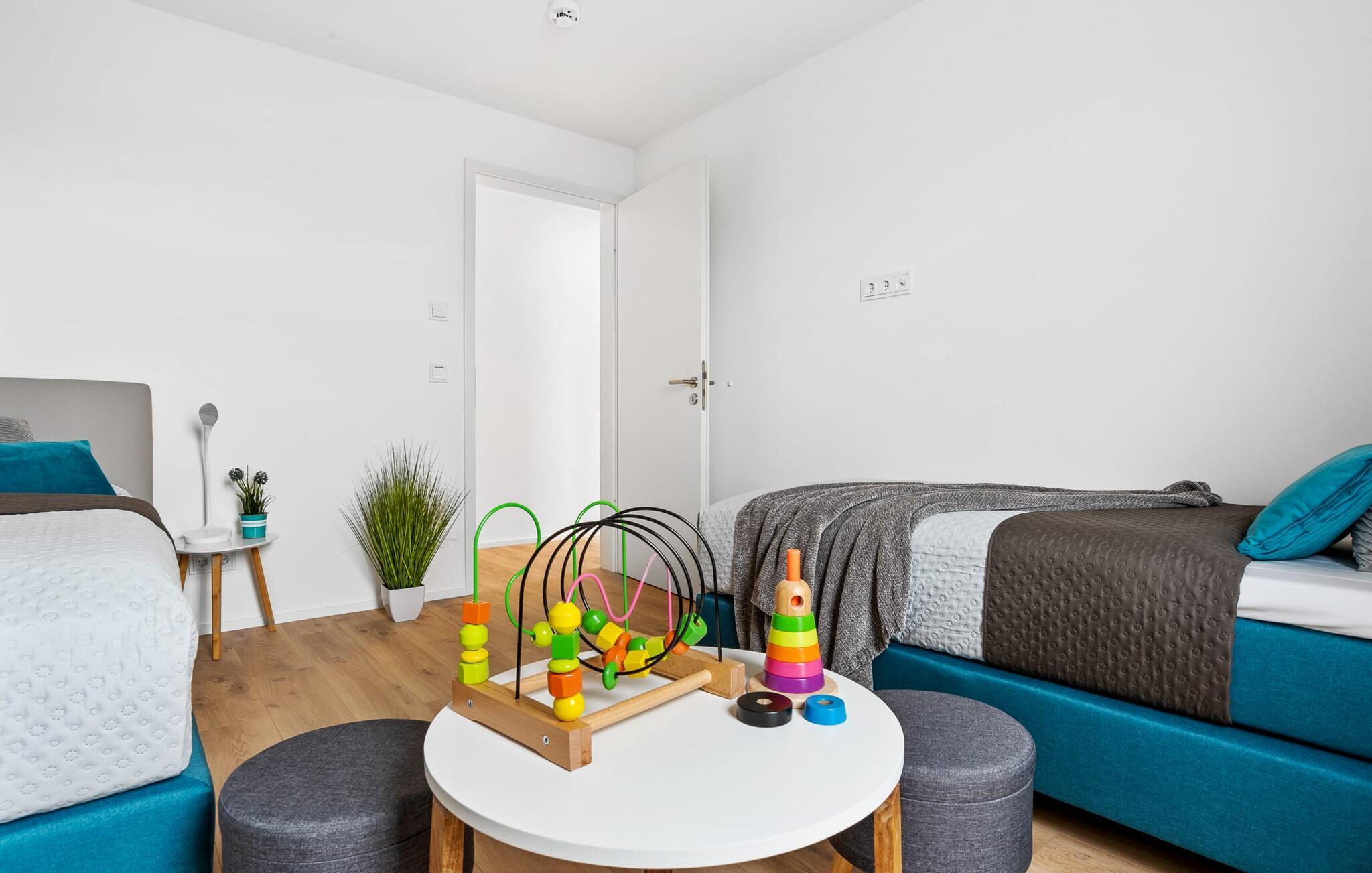 To soveværelser med komfortable boxmadrasser er tilgængelige til afslapning om natten. Det ene soveværelse er udstyret med en dobbeltseng, mens det andet soveværelse med to enkeltsenge inviterer dig til at sove godt. Med nogle få enkle trin kan sofaen i stuen forvandles til en ekstra soveplads. En baby er også velkommen.