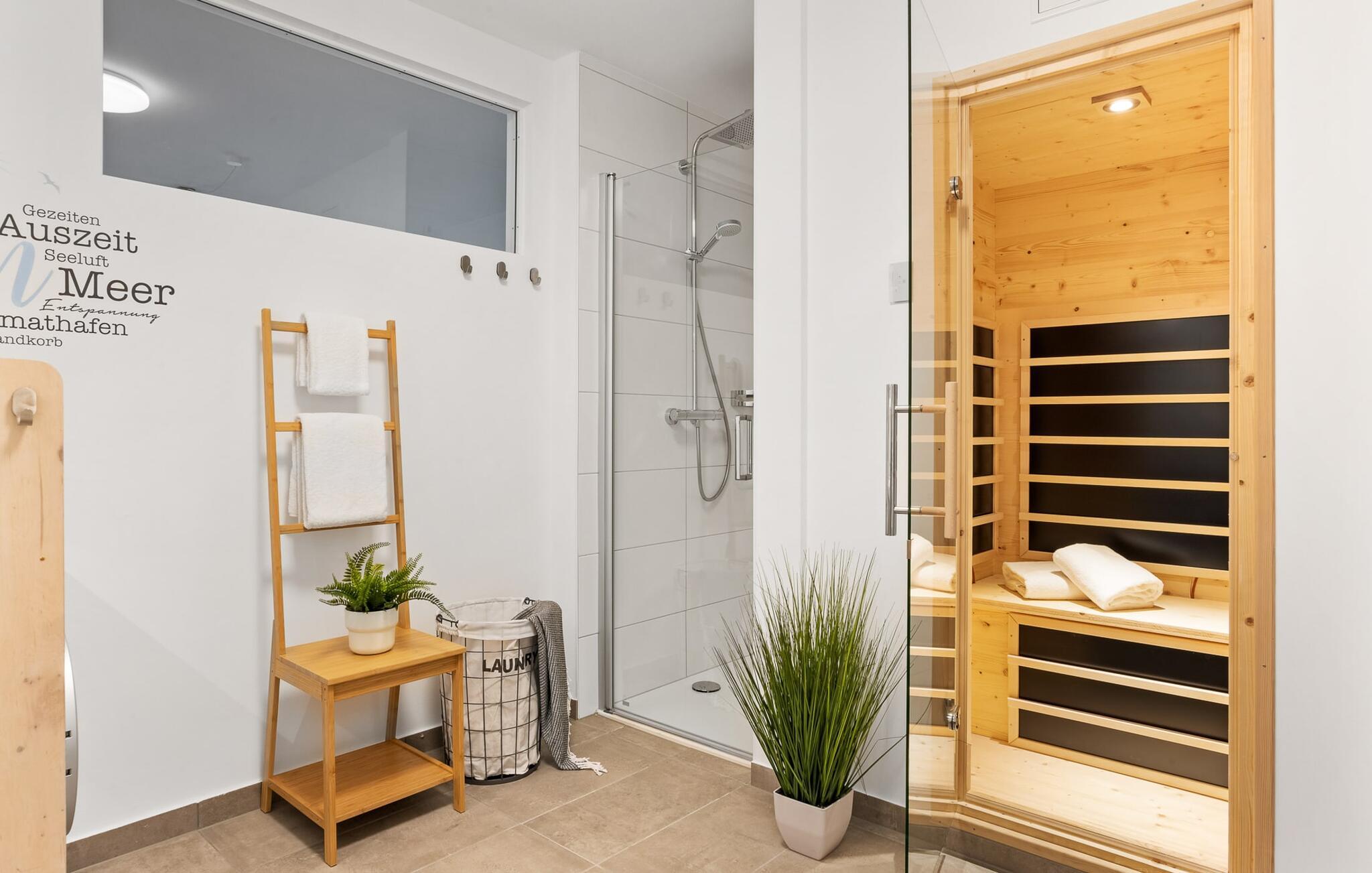 Bruserummet med brusebad i gulvniveau og infrarød sauna sikrer uforglemmelige wellness-øjeblikke, som du kan nyde i lang tid.