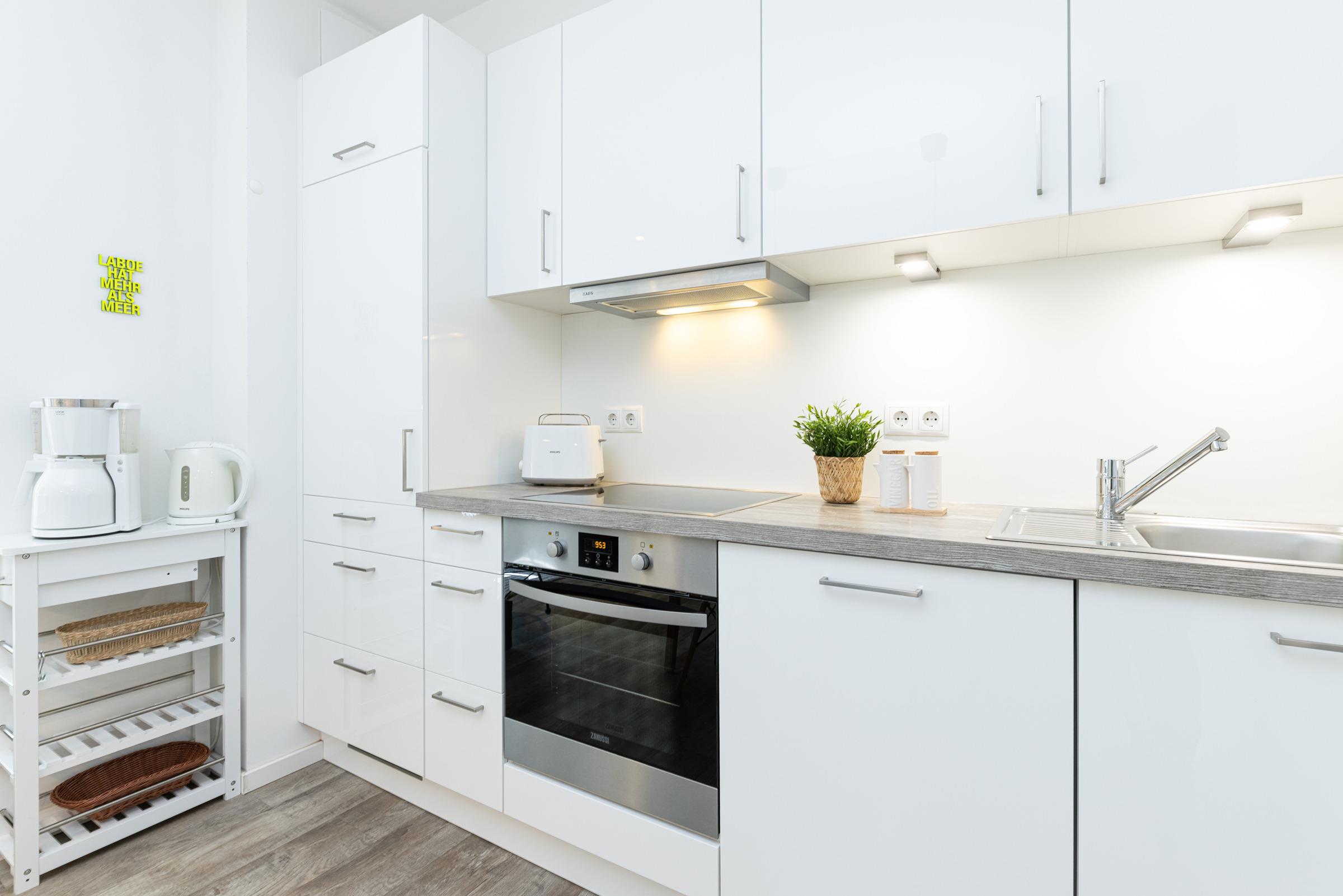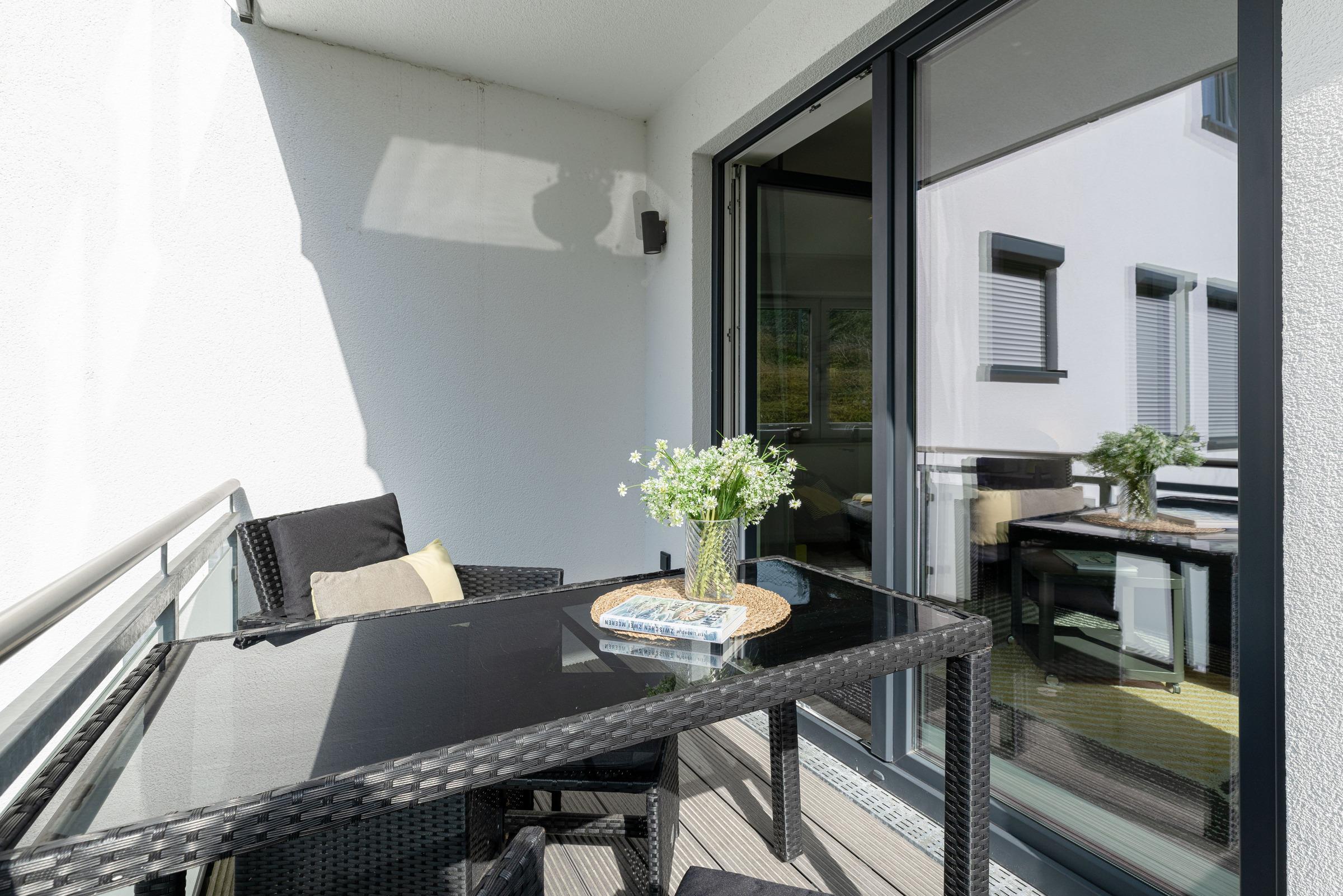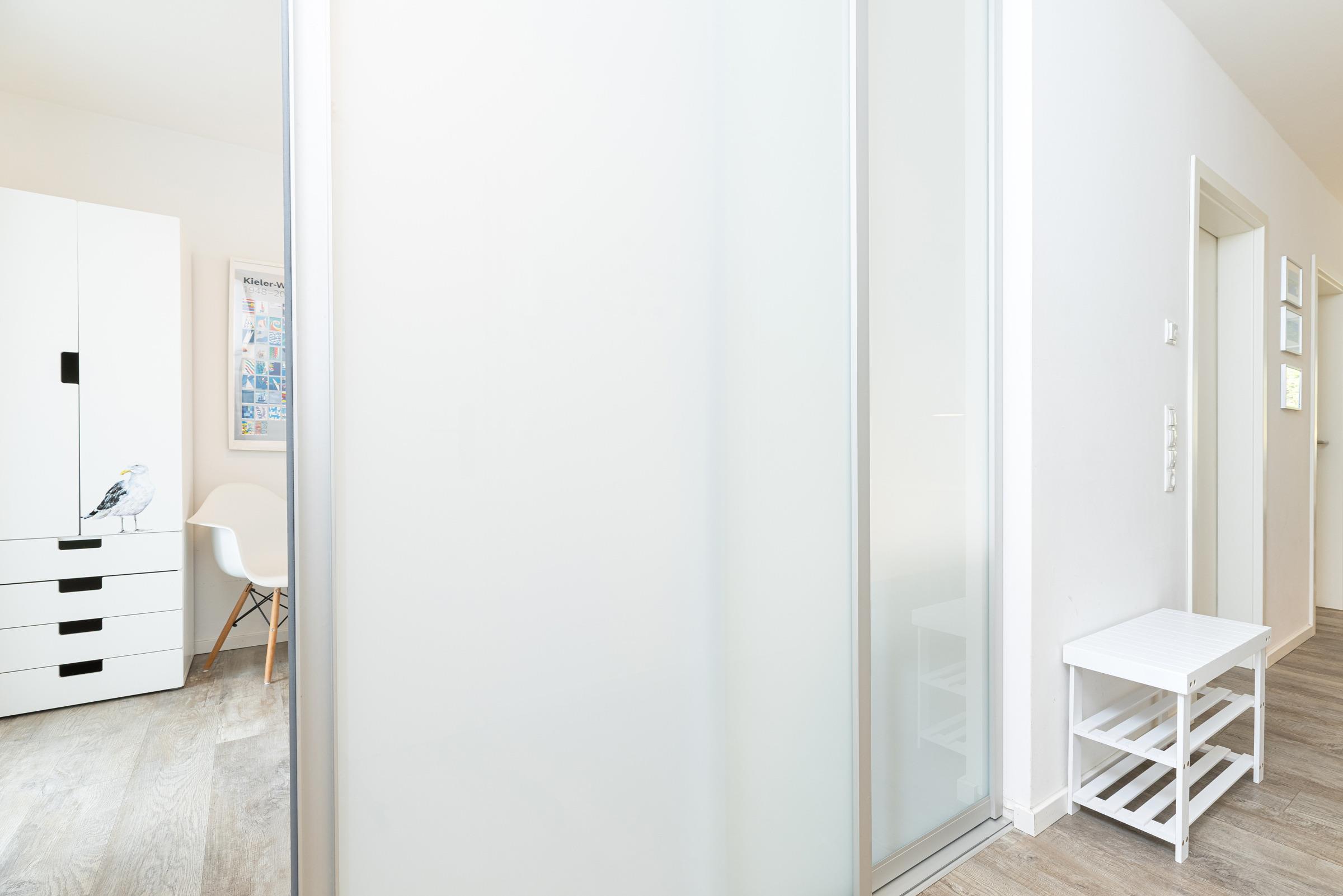 Das Zentrum des hellen Wohnbereichs bildet ein großer Tisch zum Essen, Spielen oder Klönen. Ein gemütliches Ecksofa lädt zum Lesen oder Fernsehen ein. Die Technik ist auf dem neusten Stand: Es erwartet Sie ein Smart-Fernseher, ein Blu-ray-Player mit div. DVDs für Kinder und Erwachsene, ein Beamer im Schlafzimmer mit Zugängen zu Netflix, Amazon Prime und Co. sowie ein Stereo-Digitalradio mit Bluetooth Audiostreaming. Wer ohne elektronische Medien Zeit verbringen möchte, findet in der "Spielekiste" Gesellschaftsspielen. Auch Urlaubslektüre steht Ihnen zur Verfügung. Die moderne Küchenzeile ist ausgestattet mit Geschirrspülmaschine, Ceran-Kochfeld, Backofen, Kühlschrank etc. Das separate Schlafzimmer bietet im Doppelbett (180x200 cm) erholsamen Schlaf. Im kleinen Schlafzimmer steht ein Etagenbett (je 80x200 cm). Sie möchten zu sechst in der Wohnung Urlaub machen? Dann wandeln Sie zusätzlich das Ecksofa im Wohnzimmer in eine weitere Liegefläche (140x200 cm) um. Im Badezimmer mit Dusche und Badewanne können Sie nach einem Strandtag prima entspannen. Zusätzlich gibt es ein Gäste-WC. Die Wohnung ist mit einem stilvollen Design-Fußboden sowie einer Fußbodenheizung ausgestattet. Ein Highlight sind sicher die beiden möblierten Balkone: Der Süd-West-Balkon bietet Ihnen einen geschützten Ort zum Sonnen. Der Nord-Ost-Balkon mit Blick gen Förde eignet sich hervorragend für ein sonniges Frühstück oder einen Sun-Downer in der Abendsonne.