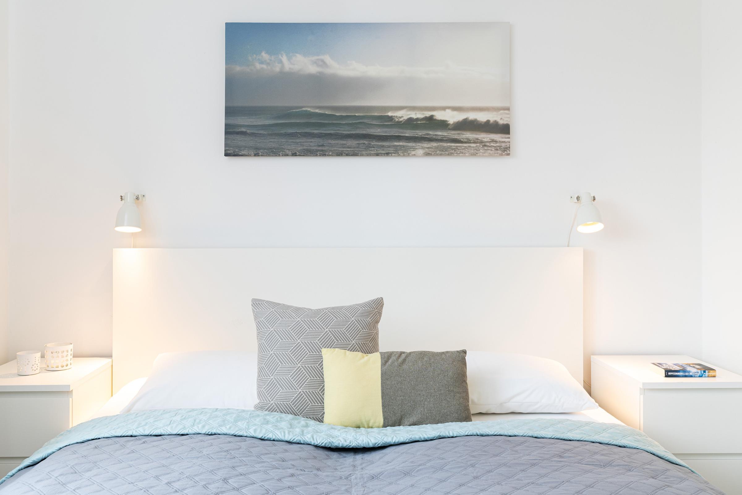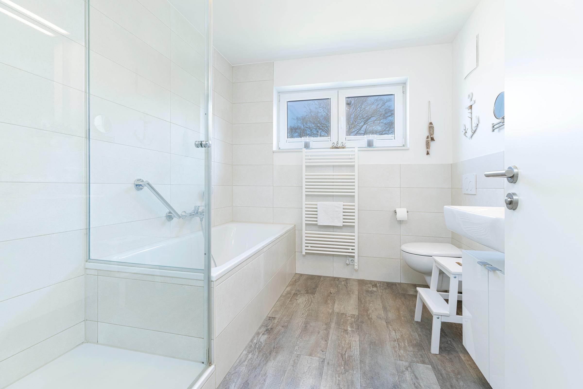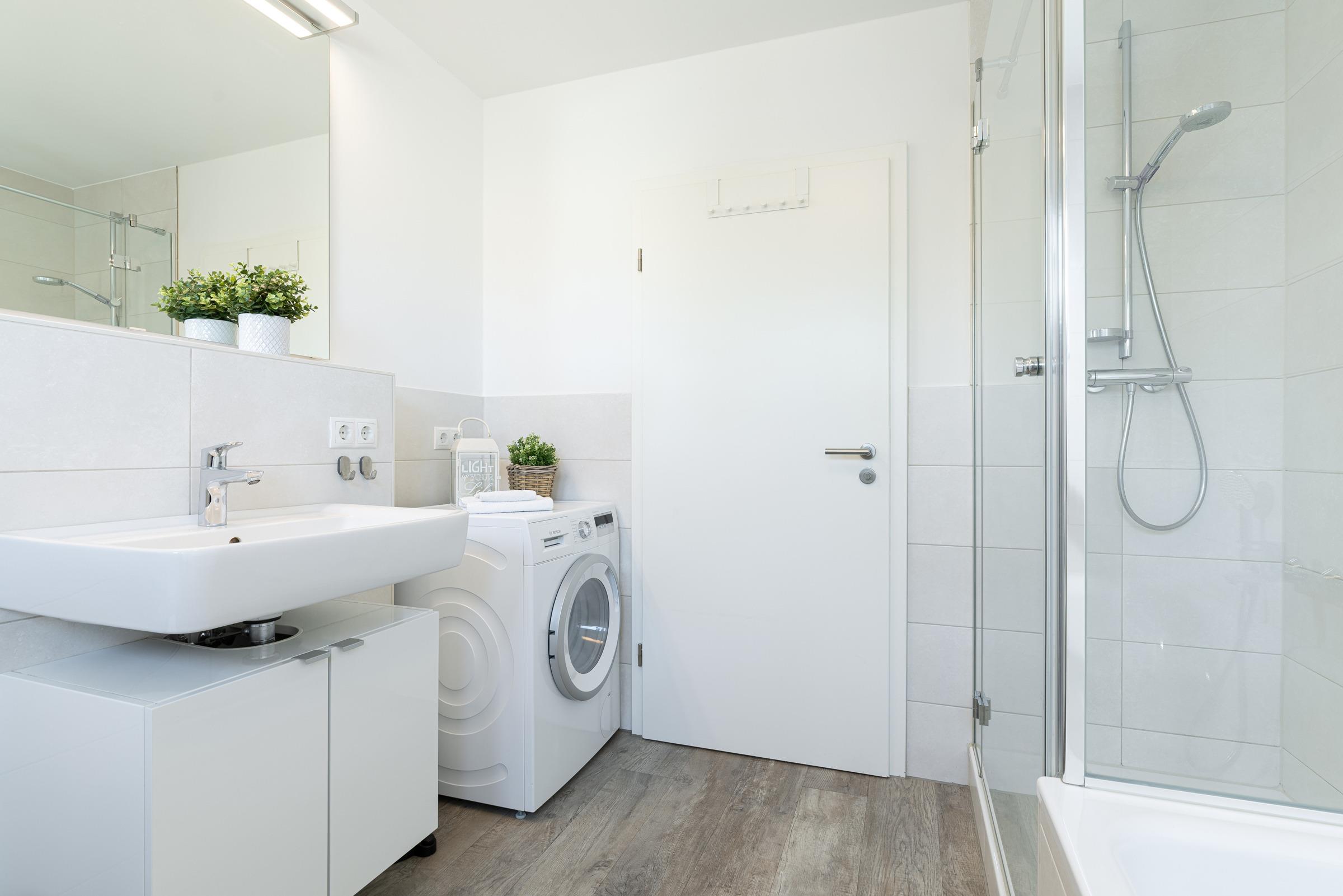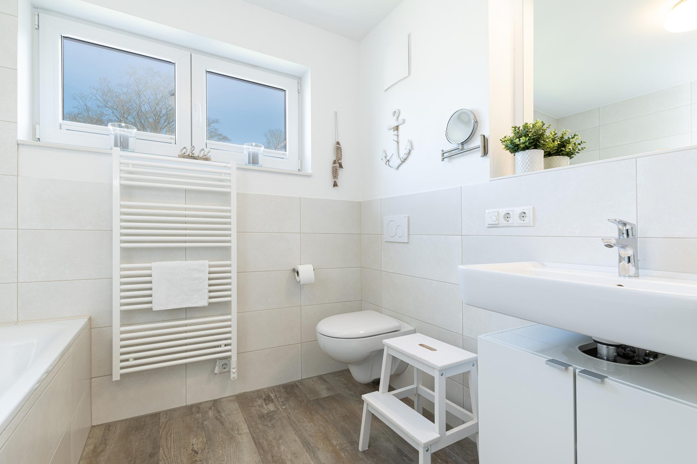 Das Zentrum des hellen Wohnbereichs bildet ein großer Tisch zum Essen, Spielen oder Klönen. Ein gemütliches Ecksofa lädt zum Lesen oder Fernsehen ein. Die Technik ist auf dem neusten Stand: Es erwartet Sie ein Smart-Fernseher, ein Blu-ray-Player mit div. DVDs für Kinder und Erwachsene, ein Beamer im Schlafzimmer mit Zugängen zu Netflix, Amazon Prime und Co. sowie ein Stereo-Digitalradio mit Bluetooth Audiostreaming. Wer ohne elektronische Medien Zeit verbringen möchte, findet in der "Spielekiste" Gesellschaftsspielen. Auch Urlaubslektüre steht Ihnen zur Verfügung. Die moderne Küchenzeile ist ausgestattet mit Geschirrspülmaschine, Ceran-Kochfeld, Backofen, Kühlschrank etc. Das separate Schlafzimmer bietet im Doppelbett (180x200 cm) erholsamen Schlaf. Im kleinen Schlafzimmer steht ein Etagenbett (je 80x200 cm). Sie möchten zu sechst in der Wohnung Urlaub machen? Dann wandeln Sie zusätzlich das Ecksofa im Wohnzimmer in eine weitere Liegefläche (140x200 cm) um. Im Badezimmer mit Dusche und Badewanne können Sie nach einem Strandtag prima entspannen. Zusätzlich gibt es ein Gäste-WC. Die Wohnung ist mit einem stilvollen Design-Fußboden sowie einer Fußbodenheizung ausgestattet. Ein Highlight sind sicher die beiden möblierten Balkone: Der Süd-West-Balkon bietet Ihnen einen geschützten Ort zum Sonnen. Der Nord-Ost-Balkon mit Blick gen Förde eignet sich hervorragend für ein sonniges Frühstück oder einen Sun-Downer in der Abendsonne.