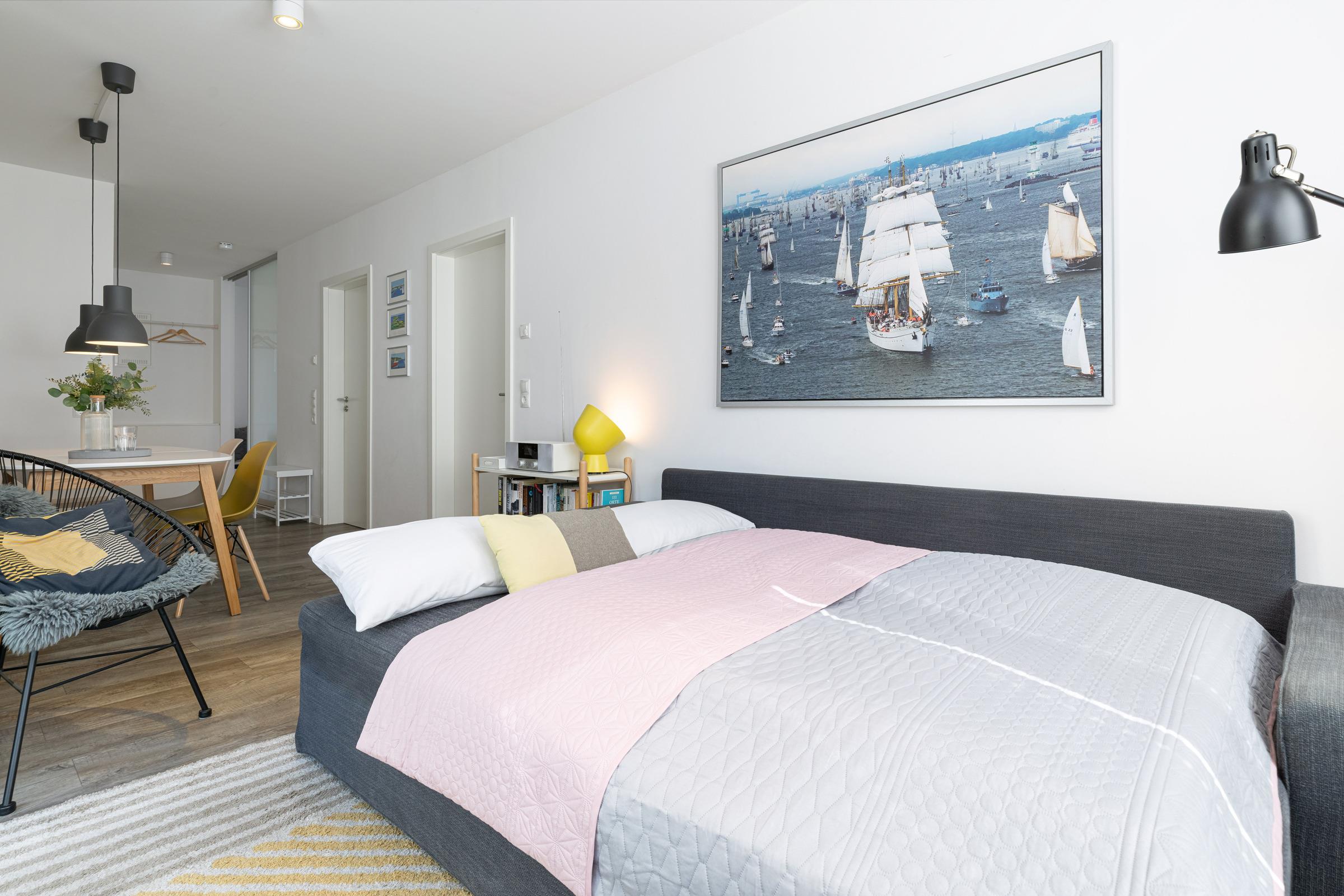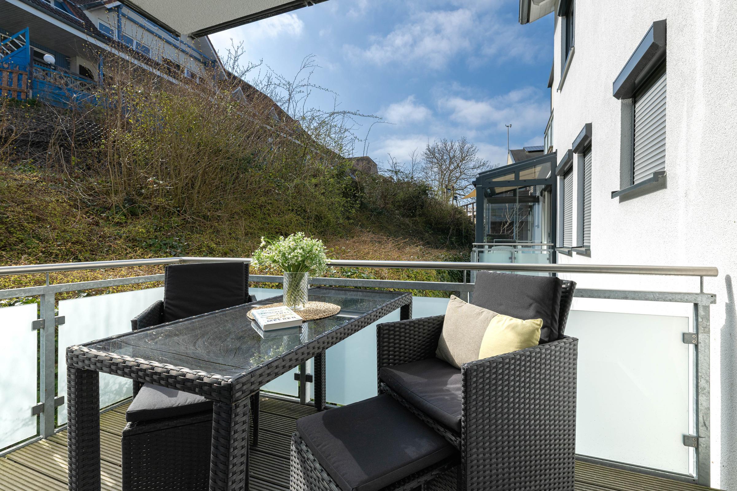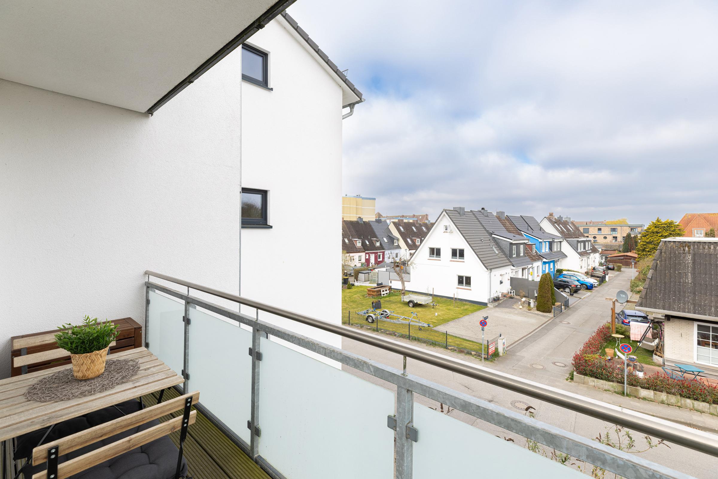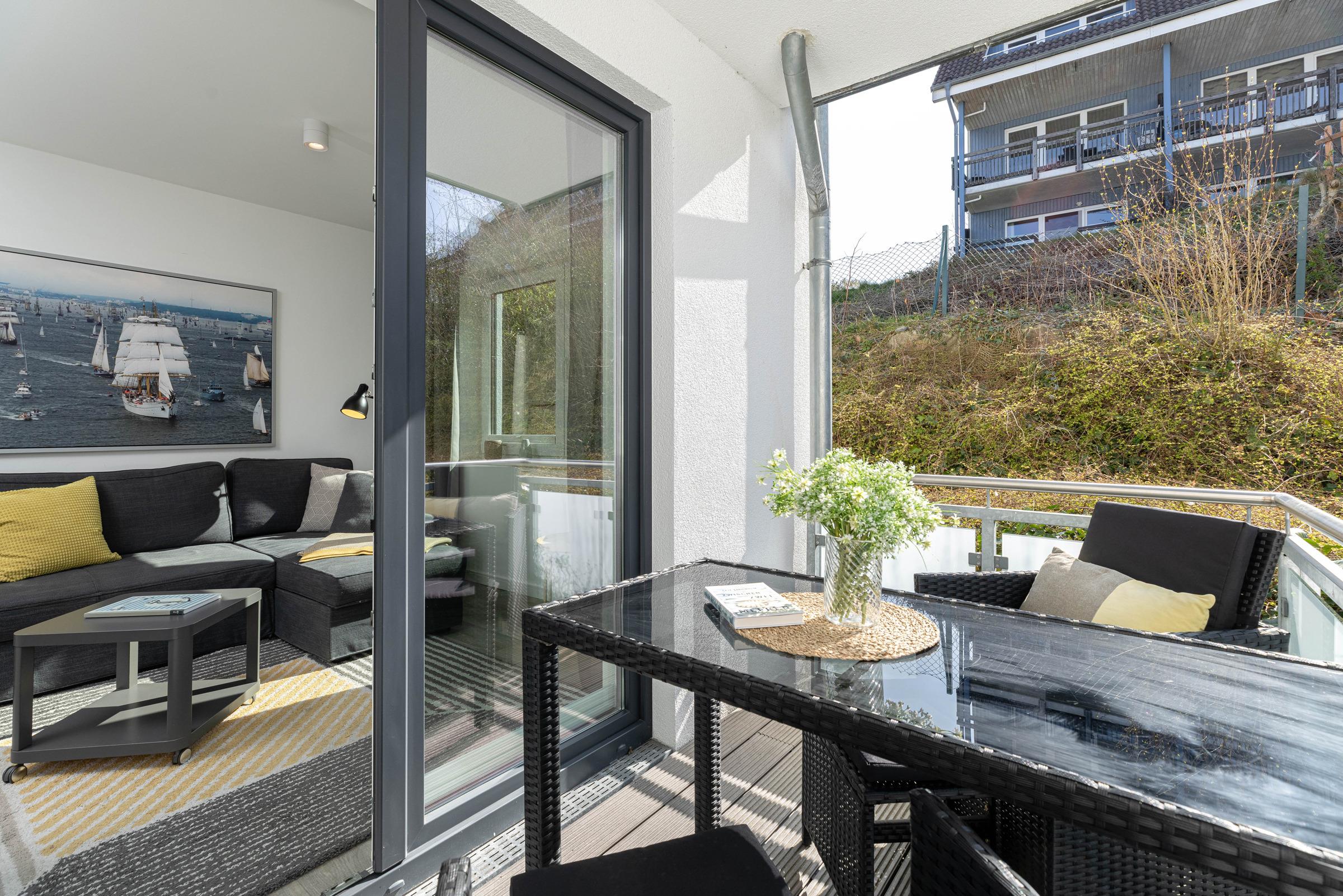 Die hochwertige, ca. 68 m² große Ferienwohnung Ahoi befindet sich im 2. Stock mit 2 Balkonen in einer gepflegten Appartementanlage in Laboe und bietet Platz für bis zu 4 Erwachsene und 2 Kinder.