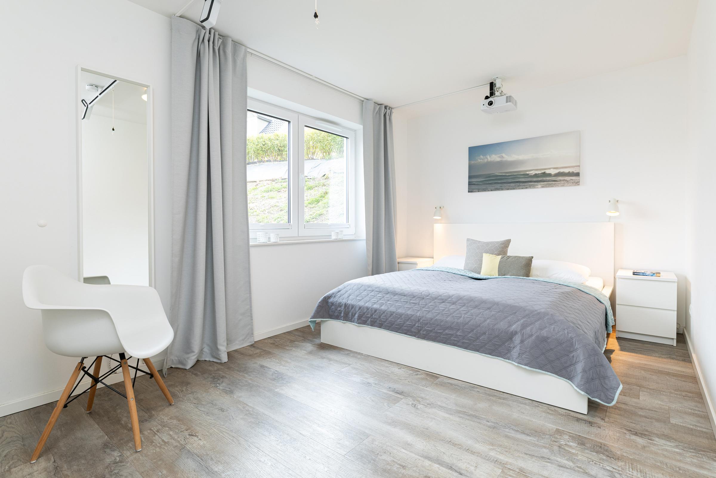 Schlafzimmer 1: 1 Doppelbett (2x 90x200 cm), TV, Kleiderschrank, Verdunkelung: Gardinen