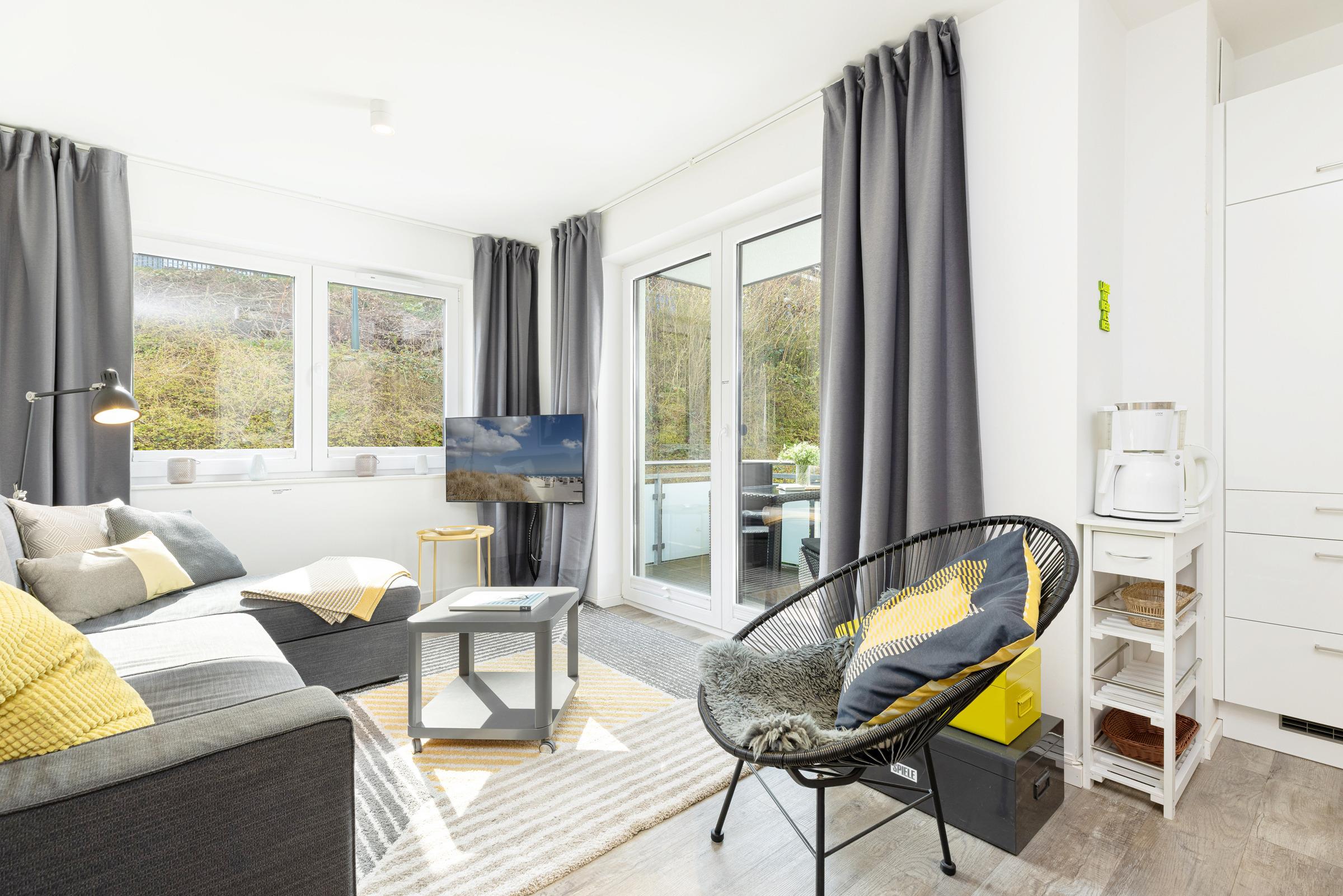 Wohnzimmer: 1 Schlafsofa (140x200cm), TV, Verdunkelung: Gardinen