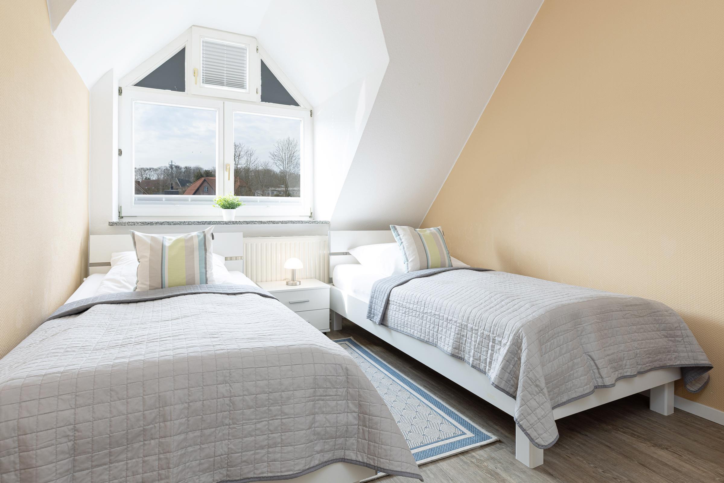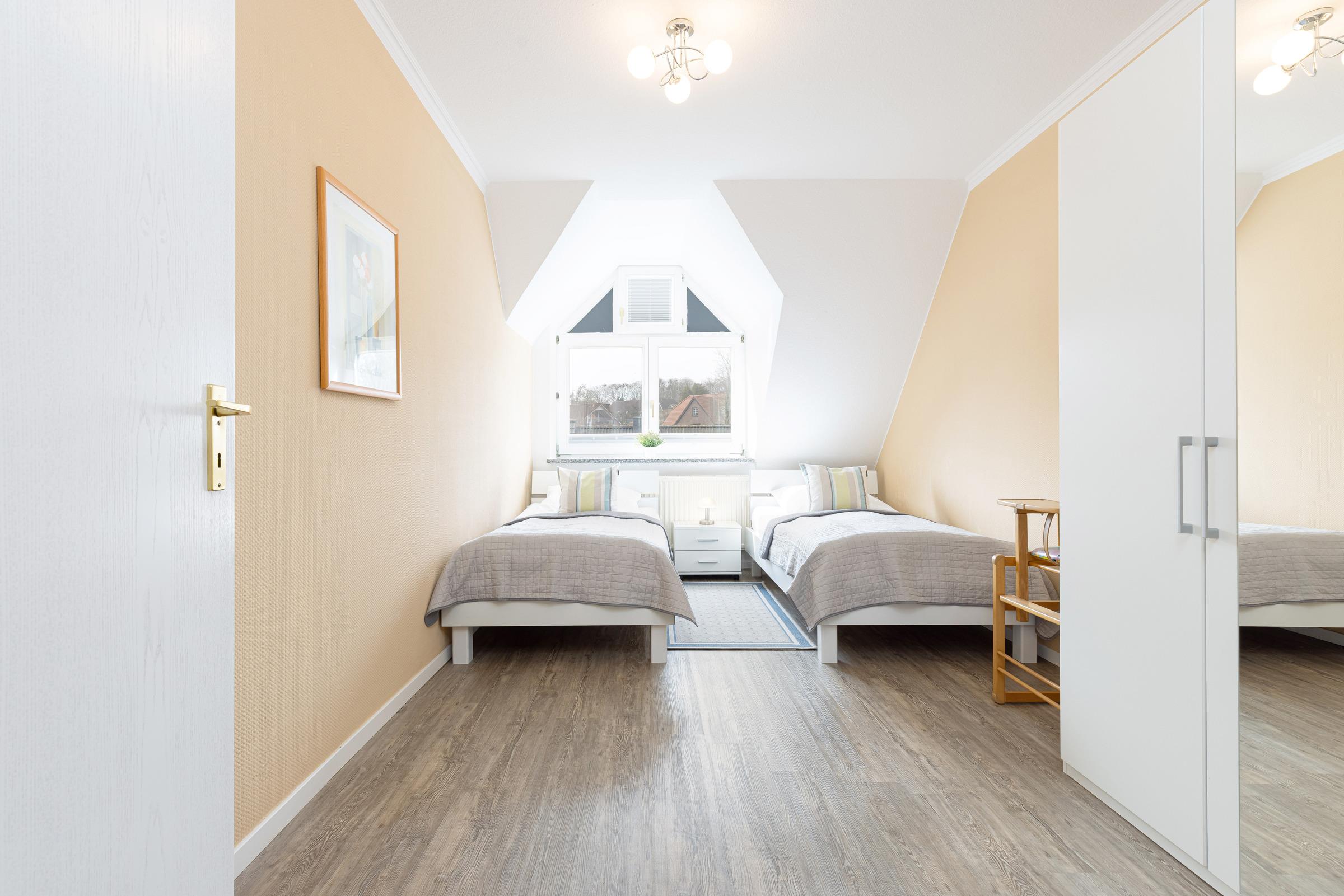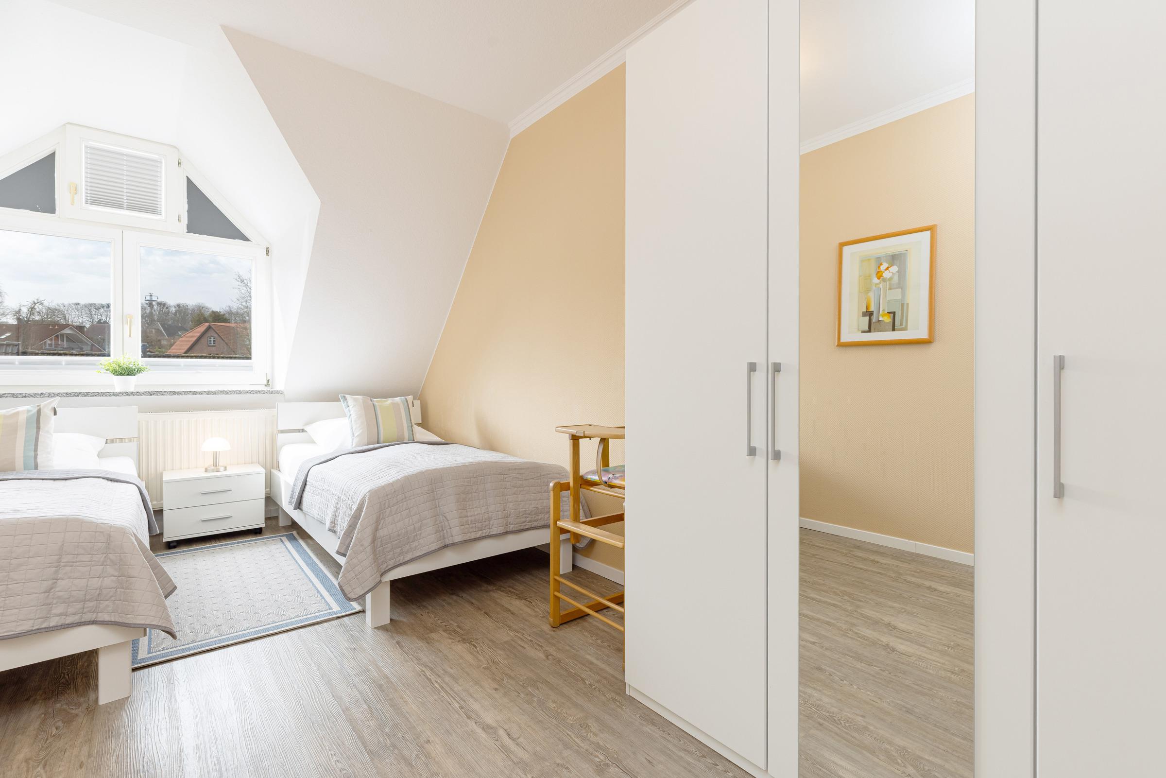 Schlafzimmer 2: 2 Einzelbetten (je 100x200 cm), Kleiderschrank, Verdunkelung: Plissees