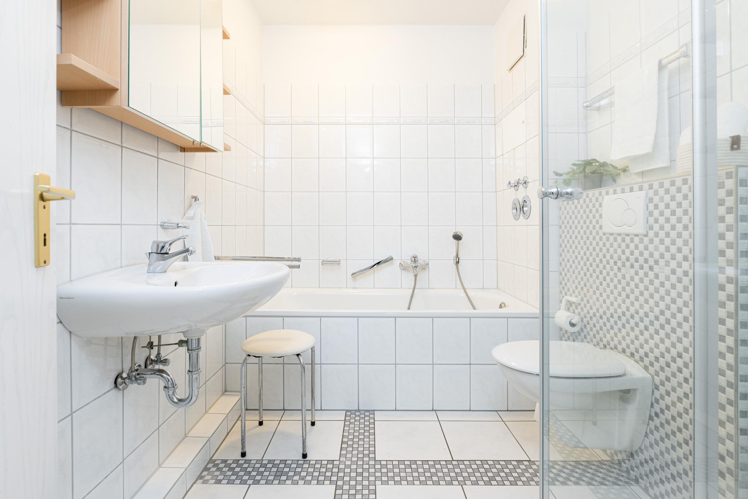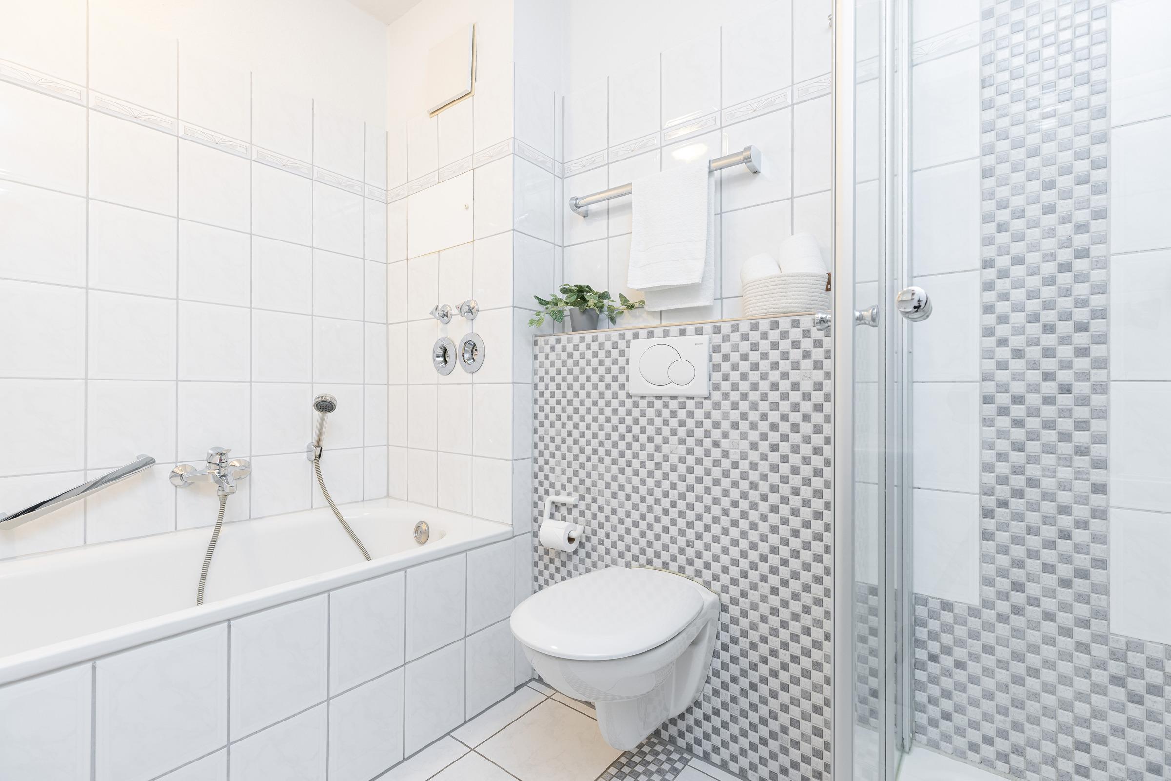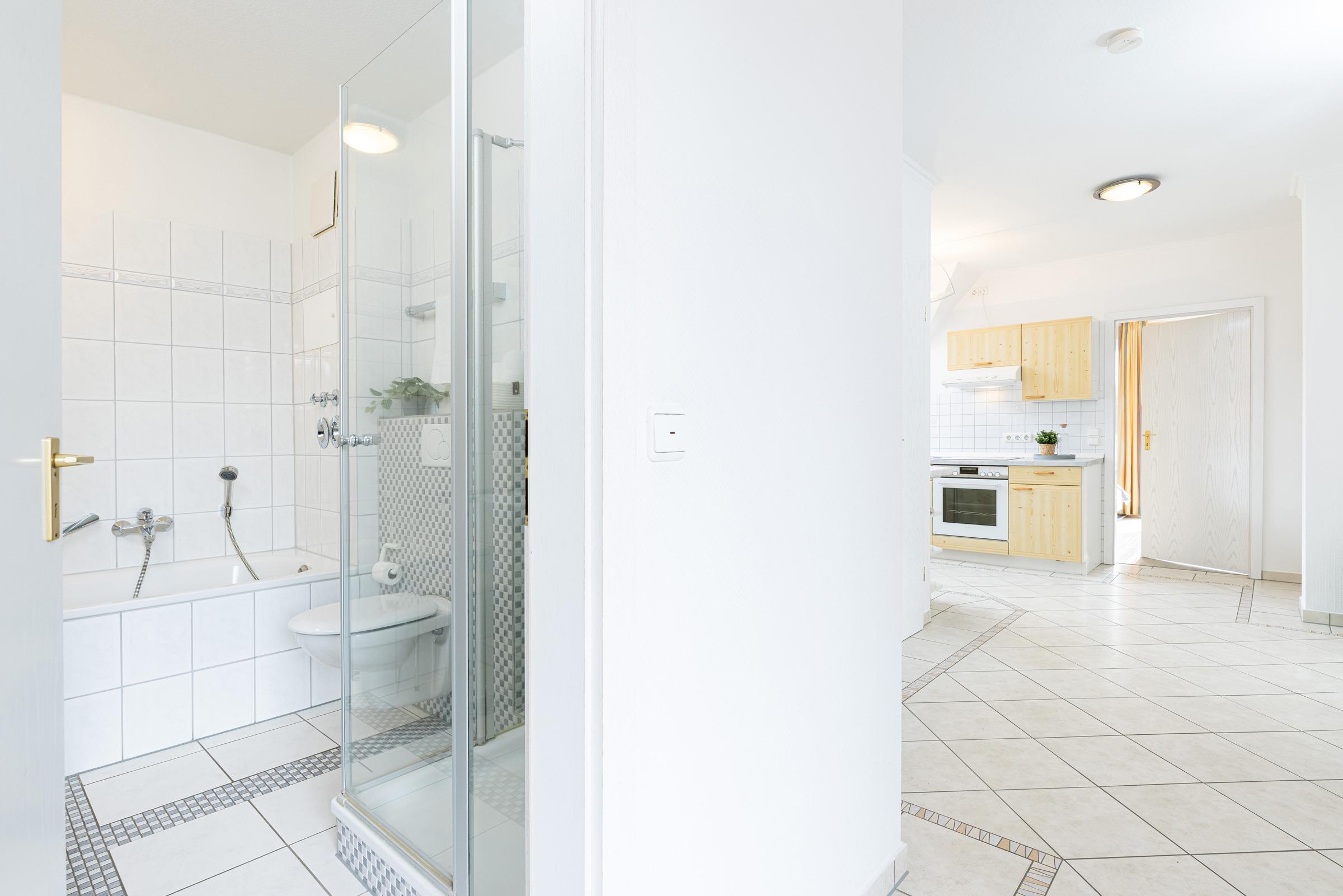 Dieses traumhafte Feriendomizil bietet Ihnen ein großzügiges Wohn-Esszimmer mit einer gemütlichen Couchgarnitur und einem Sessel zum Entspannen. Für Unterhaltung sorgen ein Flachbildschirm, eine HiFi-Anlage mit CD und USB-Anschluss. Für gemütliche Spieleabende gibt es einen großen Esstisch. Die zentrale Küche ist mit allem ausgestattet, was man für gemeinsame Kochabende braucht. Zwei separate Schlafzimmer, eins mit Doppelbett (180x200 cm) und eins mit 2 Einzelbetten (je 100x200 cm), bringen Sie ins Land der Träume. Das geräumige Badezimmer wartet mit Dusche und einer Badewanne auf. Zusätzlich gibt es ein Gäste-WC. Der möblierte Balkon lädt ebenfalls zum Verweilen ein.