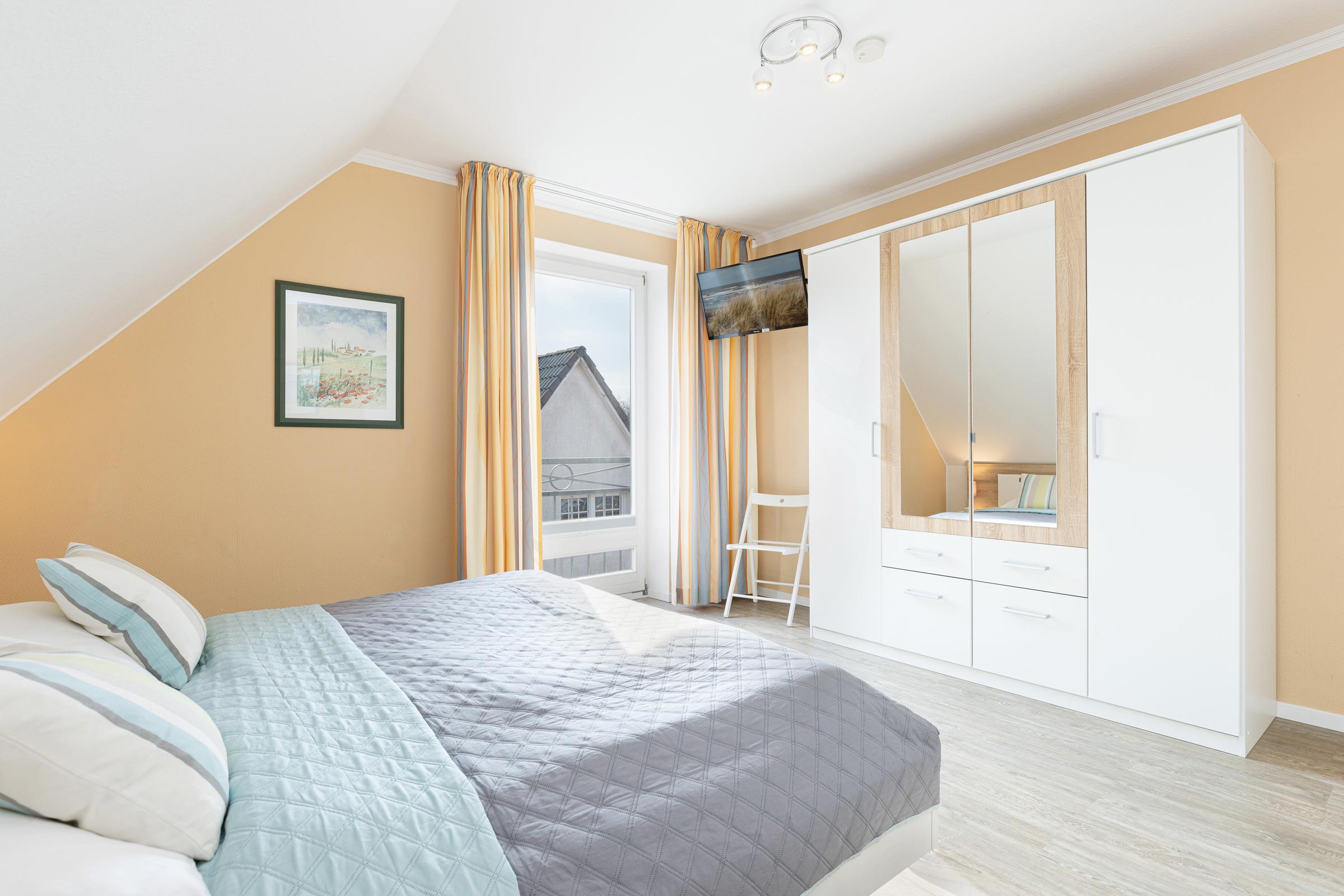 Schlafzimmer 1: 1 Doppelbett (2x 90x200 cm), Kleiderschrank, TV, Verdunkelung: Plissees