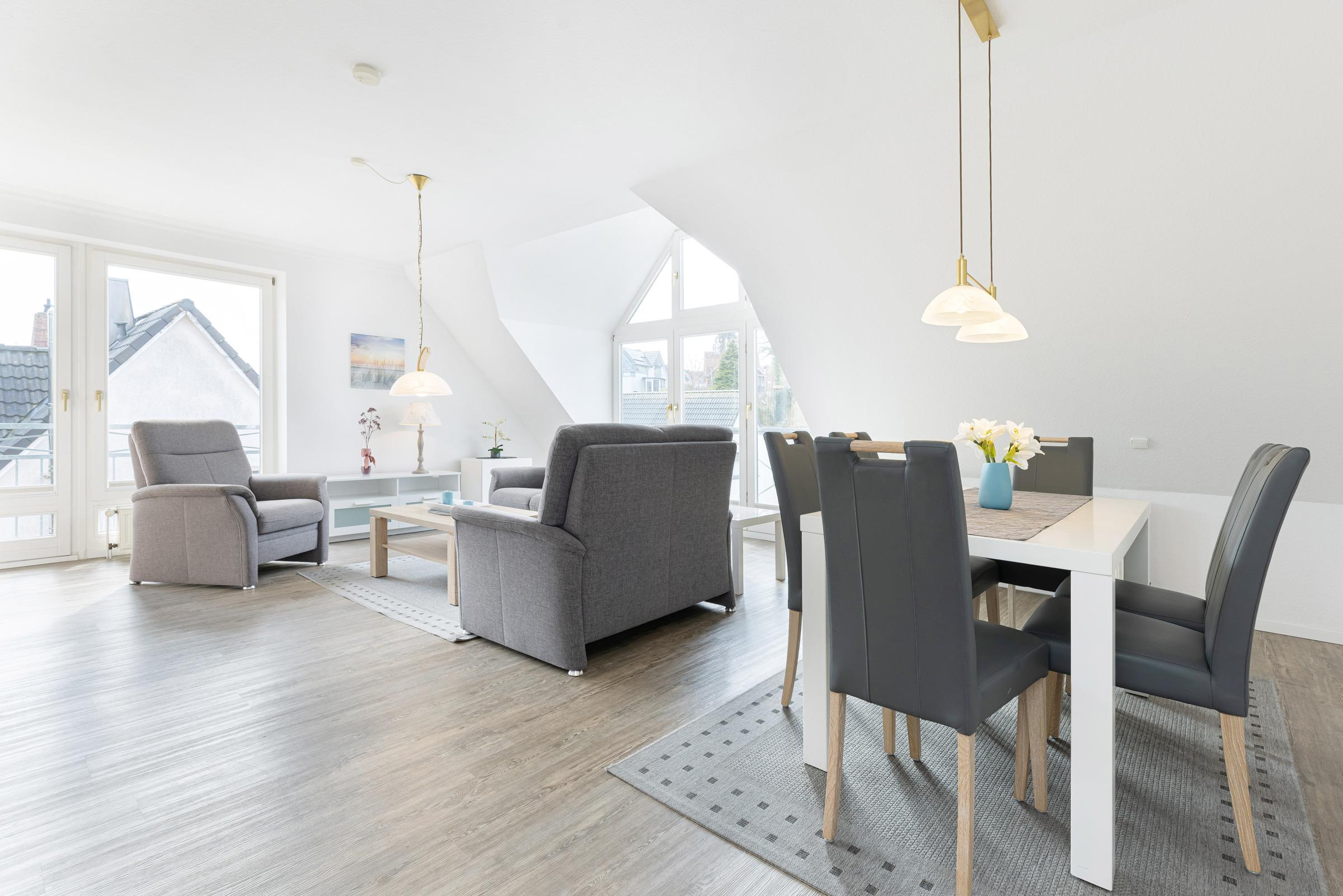 Helle, ca. 85 m² große 3-Zimmer-Ferienwohnung für bis zu 4 Personen im 2. Stock mit Balkon in ruhiger Lage und Nähe zum Laboer Hafen.