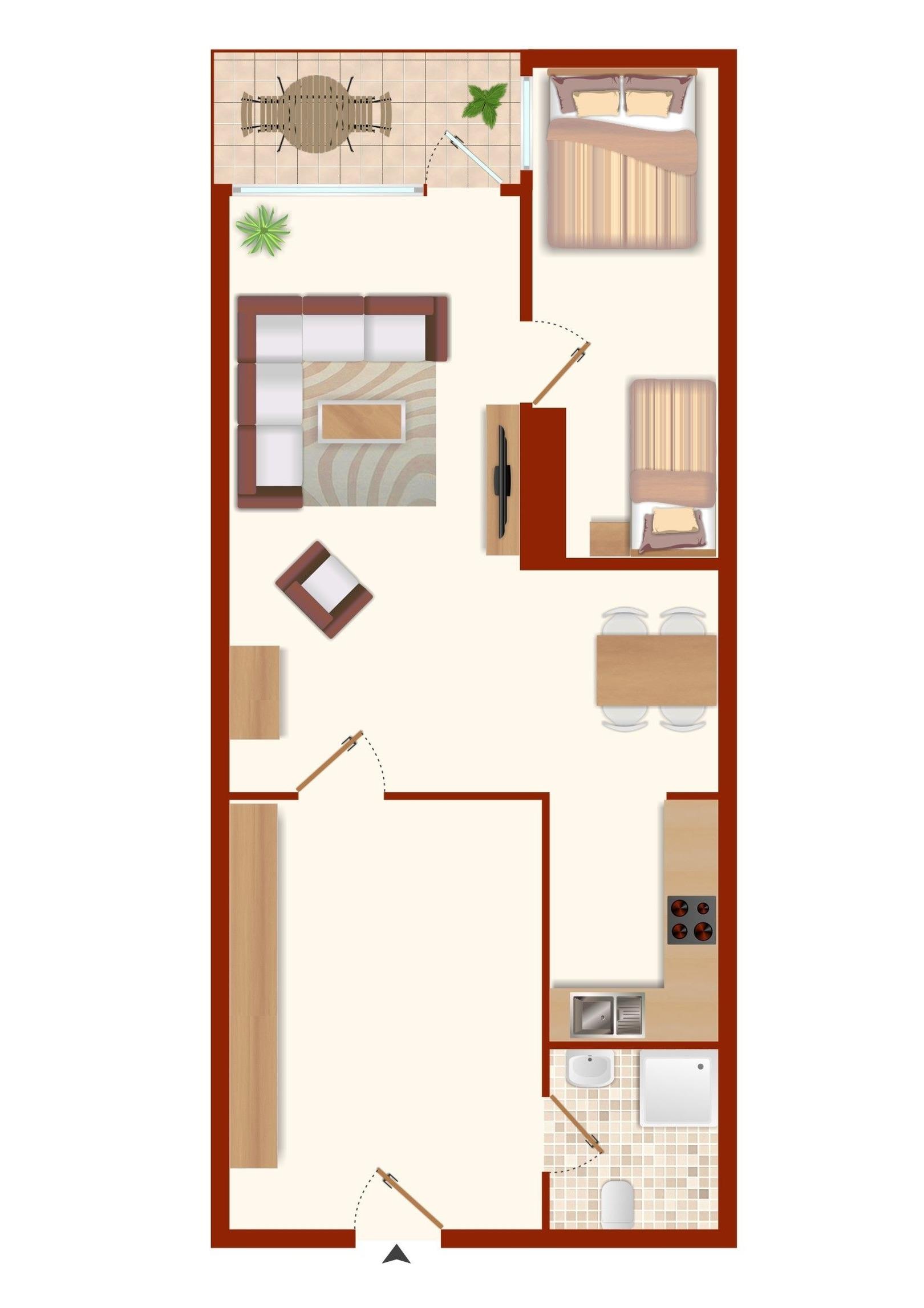 Das Appartement ist aufgeteilt in einen kombinierten Wohn- Essbereich, ein Schlafzimmer, eine separaten Küche und ein Duschbad. Es bietet Platz für die ganze Familie und lädt ein, sich wohl zu fühlen, zu spielen und die Seele baumeln zu lassen. Das Schlafzimmer hat ein 160x200 cm großes Doppelbett und ein Etagenbett für 2 Kinder. Im Wohnzimmer befindet sich ein gemütliches Sofa. Ein CD-Player und ein großer Flachbildschirm-TV sorgen am Abend für gemütliche Stunden. Die Küche ist mit allen nötigen Geräten ausgestattet. Für unsere Angler halten wir einen Gefrierschrank mit separaten Fächern im Haus bereit.