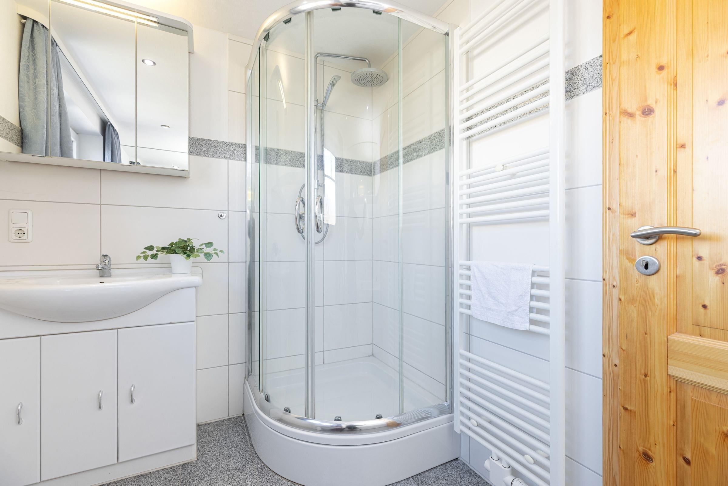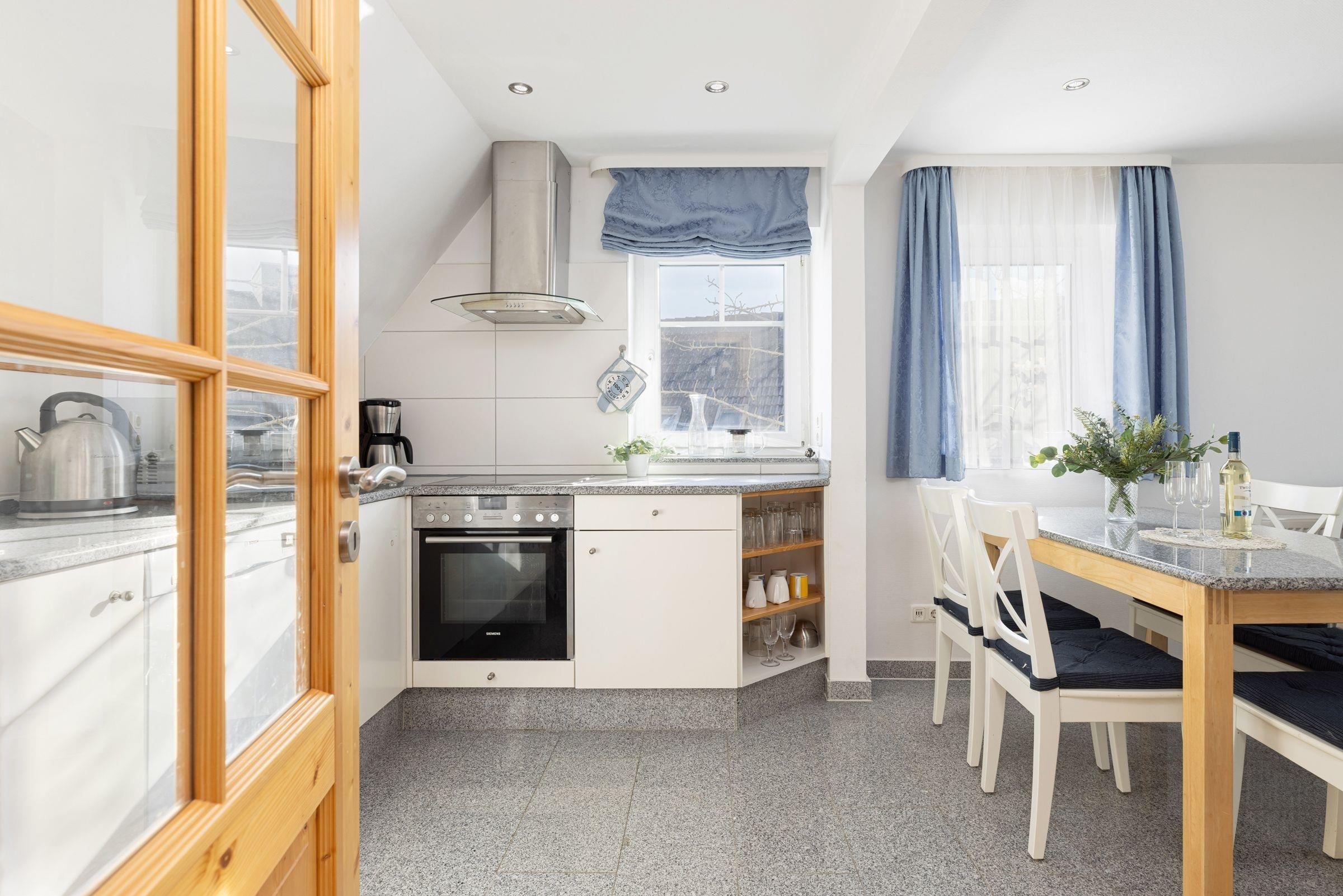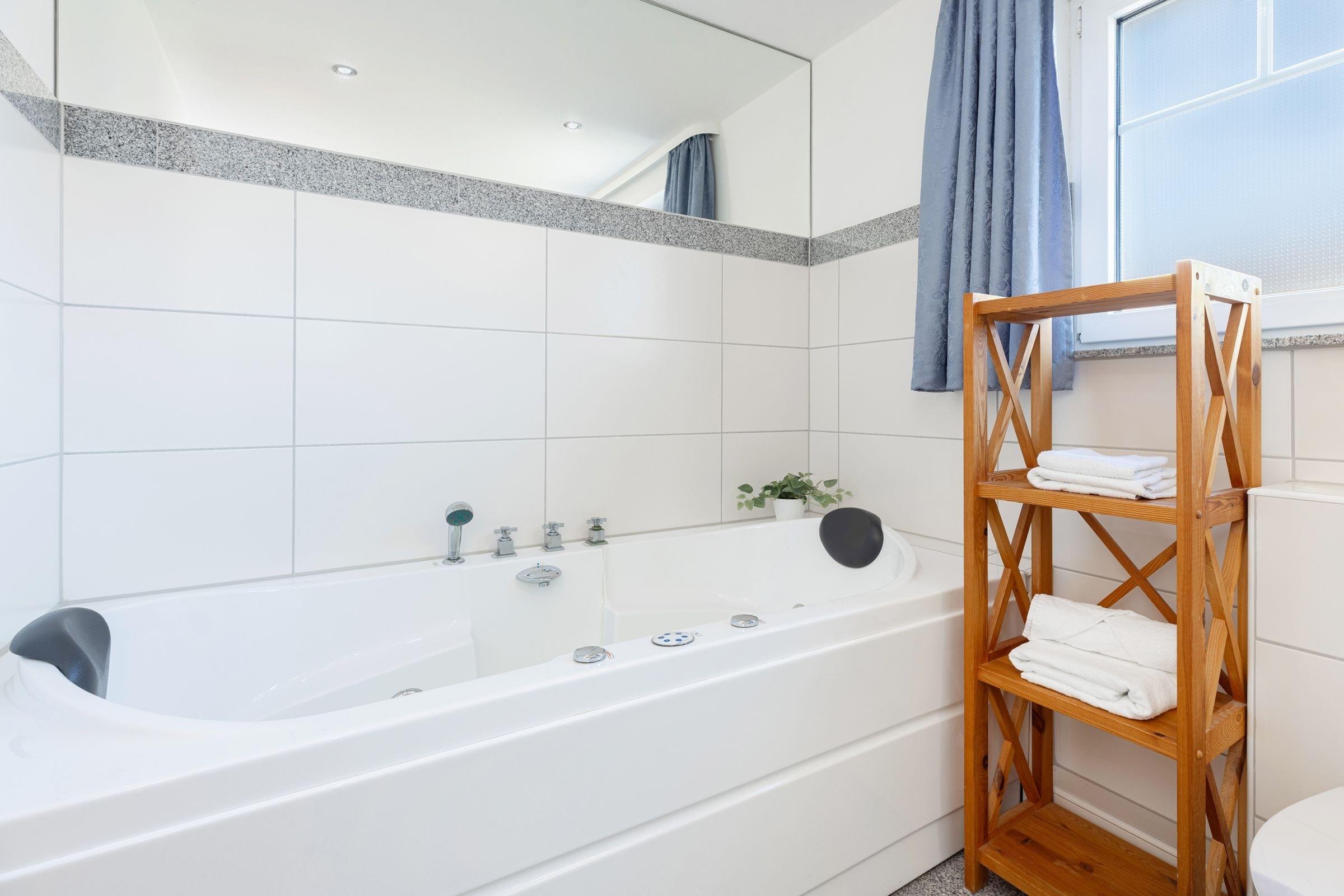 Hereinspaziert! Über den großzügigen Flur mit Garderobe gelangen Sie in den offenen Wohnbereich mit Couchgarnitur und großem Smart-TV. Hier können Sie prima nach langen Strandspaziergängen entspannen. Die offene Küche ist gut ausgestattet und bietet Annehmlichkeiten wie Geschirrspüler, Kühlschrank, Ceran-Kochfeld, Umluft-Backofen, Wasserkocher, Kaffeemaschine und Toaster. Auf dieser Ebene befindet sich auch ein Schlafzimmer mit Doppelbett (2x 90x200 cm), die Bettdecken haben jeweils das gemütliche Maß von 155x220cm. Zudem gibt es hier genügend Platz für Ihre Urlaubsgarderobe. Im Wellnessbad mit Whirlpool-Badewanne lässt sich der Tag bei Kerzenschein gemütlich ausklingen.