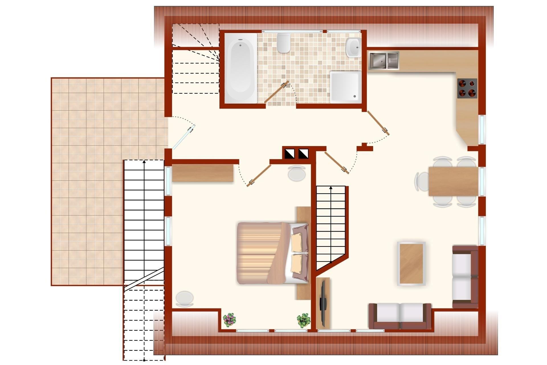 Schönes 3-Zimmer-Galerie-Appartement im 1. Stock mit einer Wohnfläche von ca. 56 m², die sich über 2 Ebenen erstrecken, für bis zu 5 Personen.