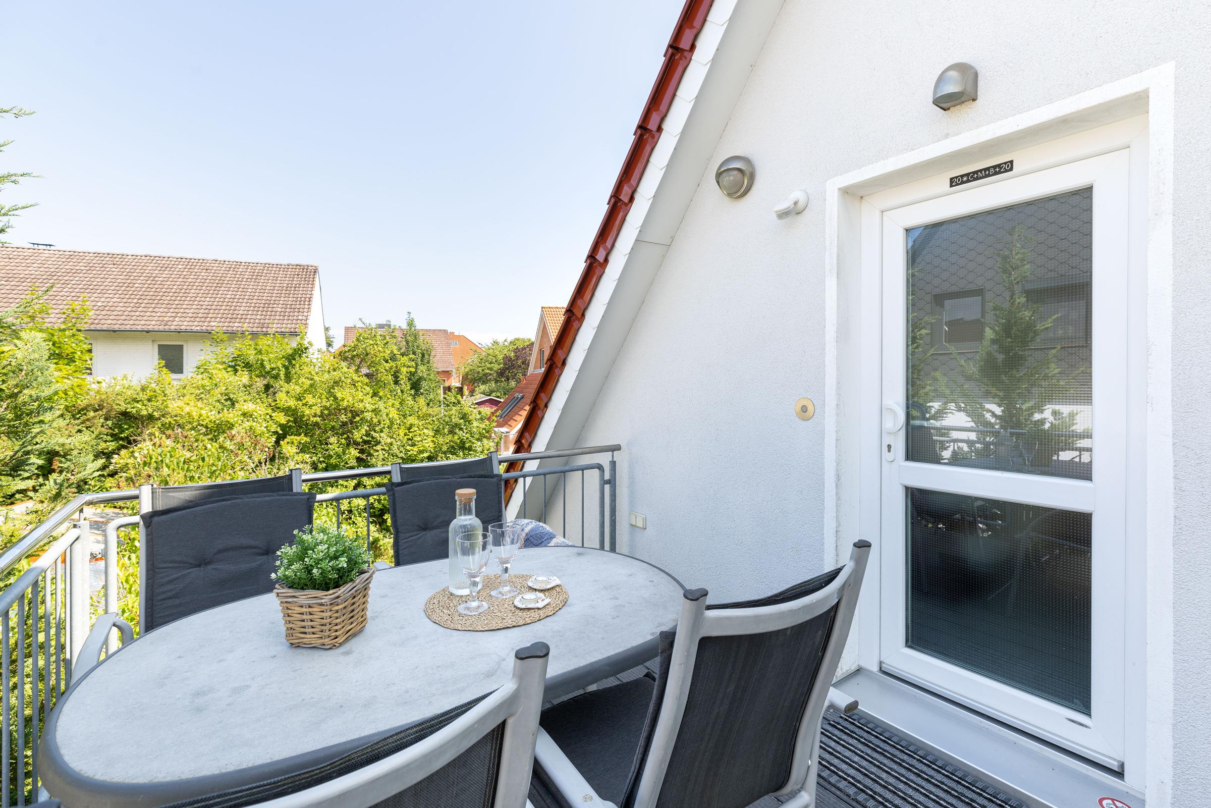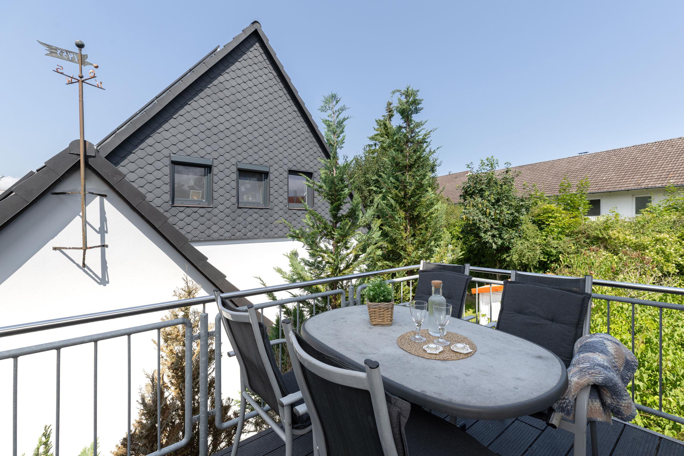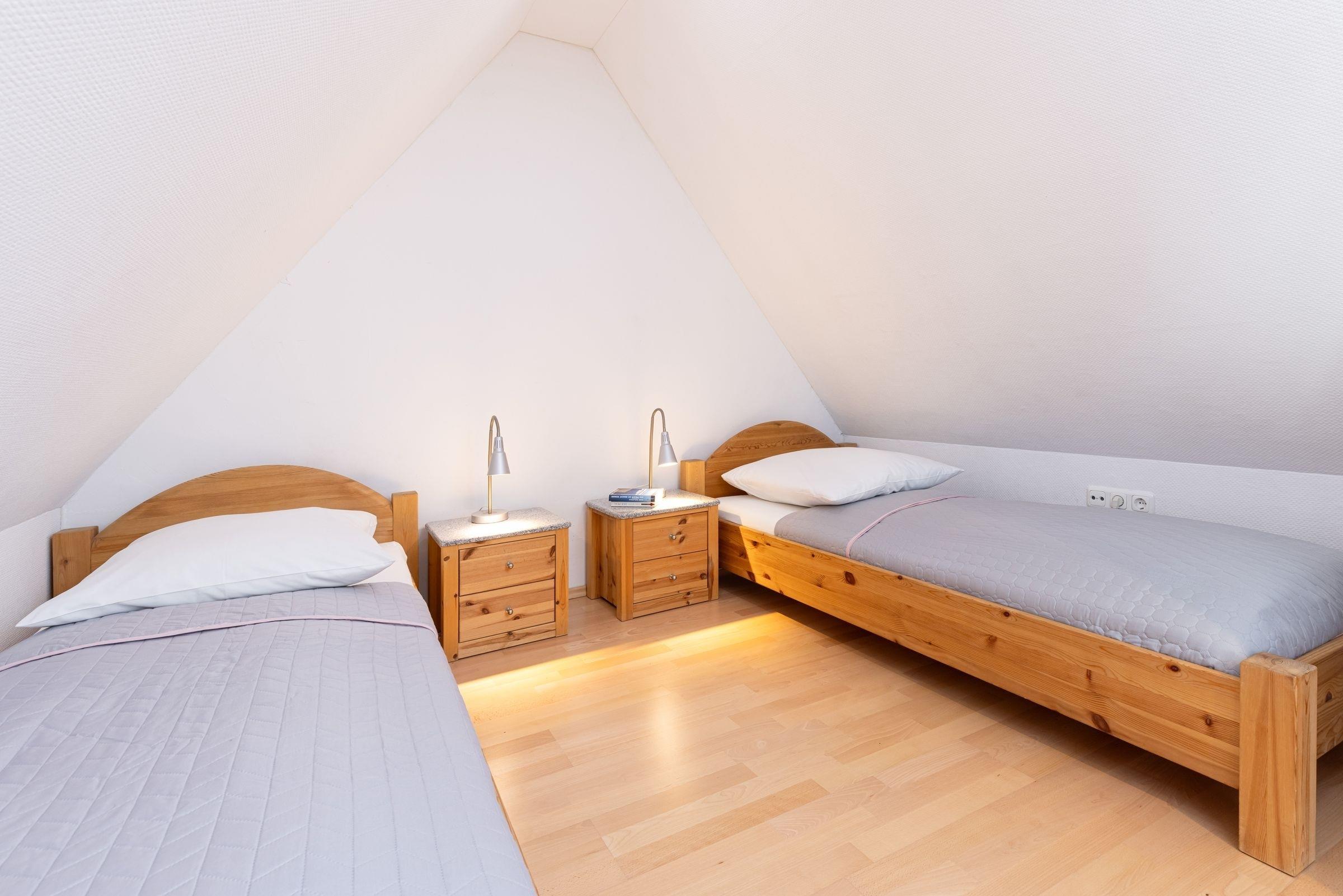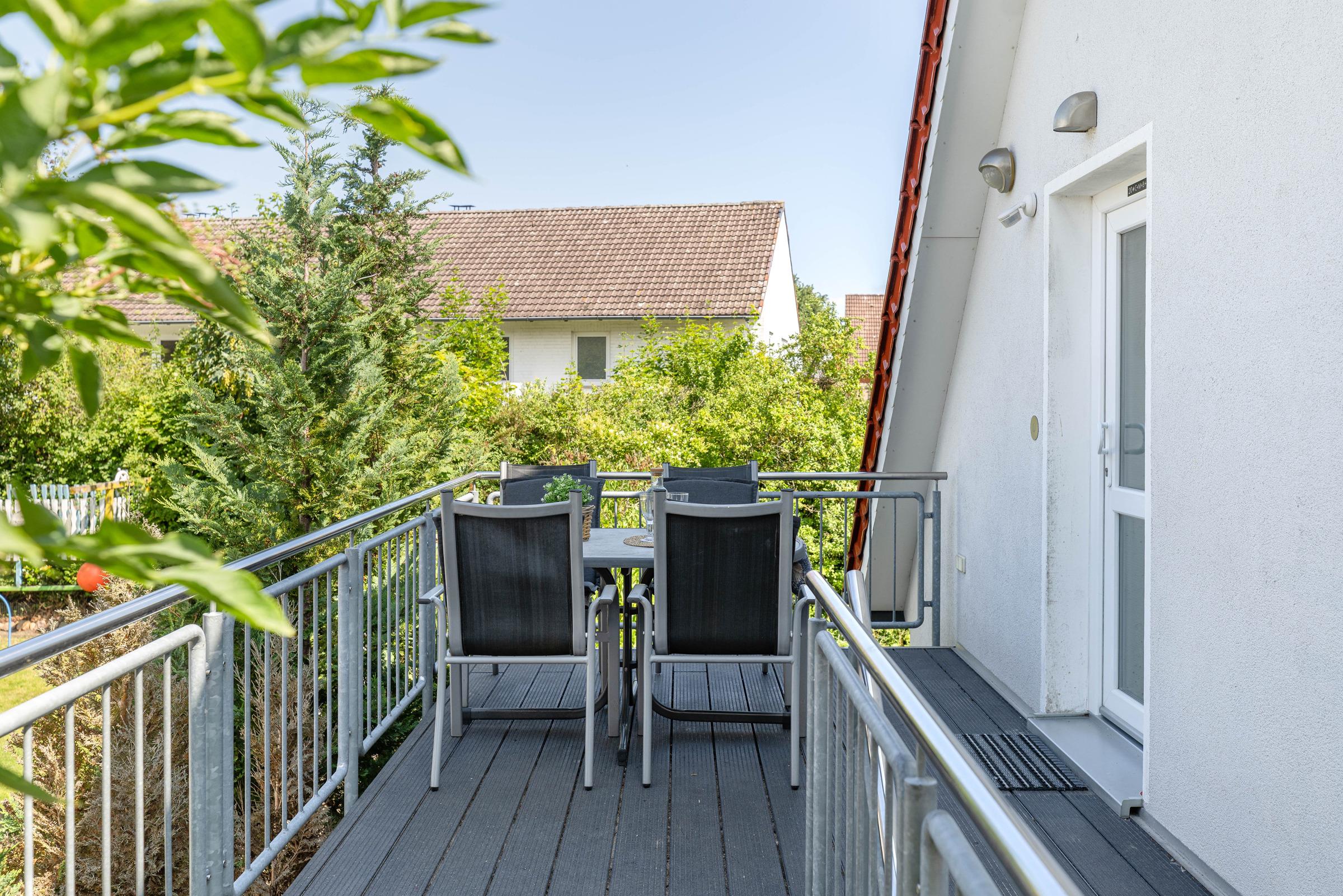 Über die Treppe nach oben erreichen Sie ein Galerie-Schlafzimmer mit drei Einzelbetten (je 90x200 cm). Zur Ferienwohnung gehört eine möblierte Dachterrasse, auch der Garten darf z.B. zum Grillen, Boule, Schach- und Tischtennisspielen und weiteren Freizeitaktivitäten genutzt werden.