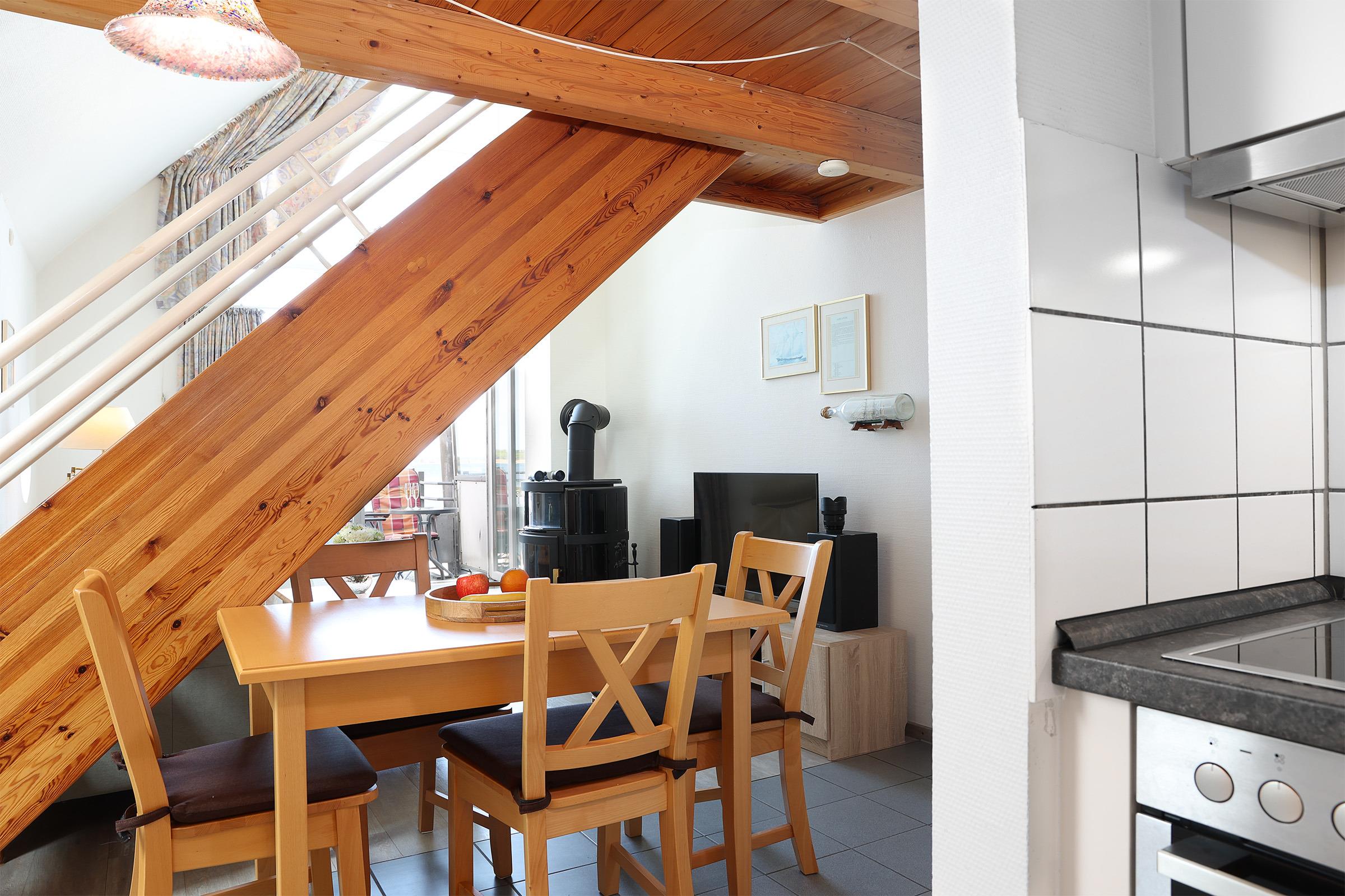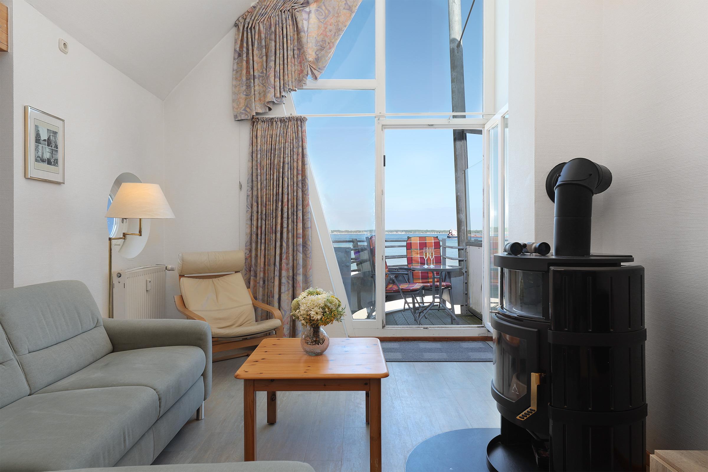 Die schöne 51 m² große Galeriewohnung besteht aus einem großzügigen Wohnbereich mit Schlafcouch, Essecke und Pantry-Küche, Badezimmer. Auf der offenen Galerie befindet sich das Schlafzimmer. Auch von dort haben Sie einen Blick auf die Kieler Förde. Vom Balkon genießen Sie ebenfalls einen unvergleichbaren Förde-Panoramablick. In den kühleren Monaten sorgt ein dänischer Kaminofen für eine zusätzliche Gemütlichkeit.