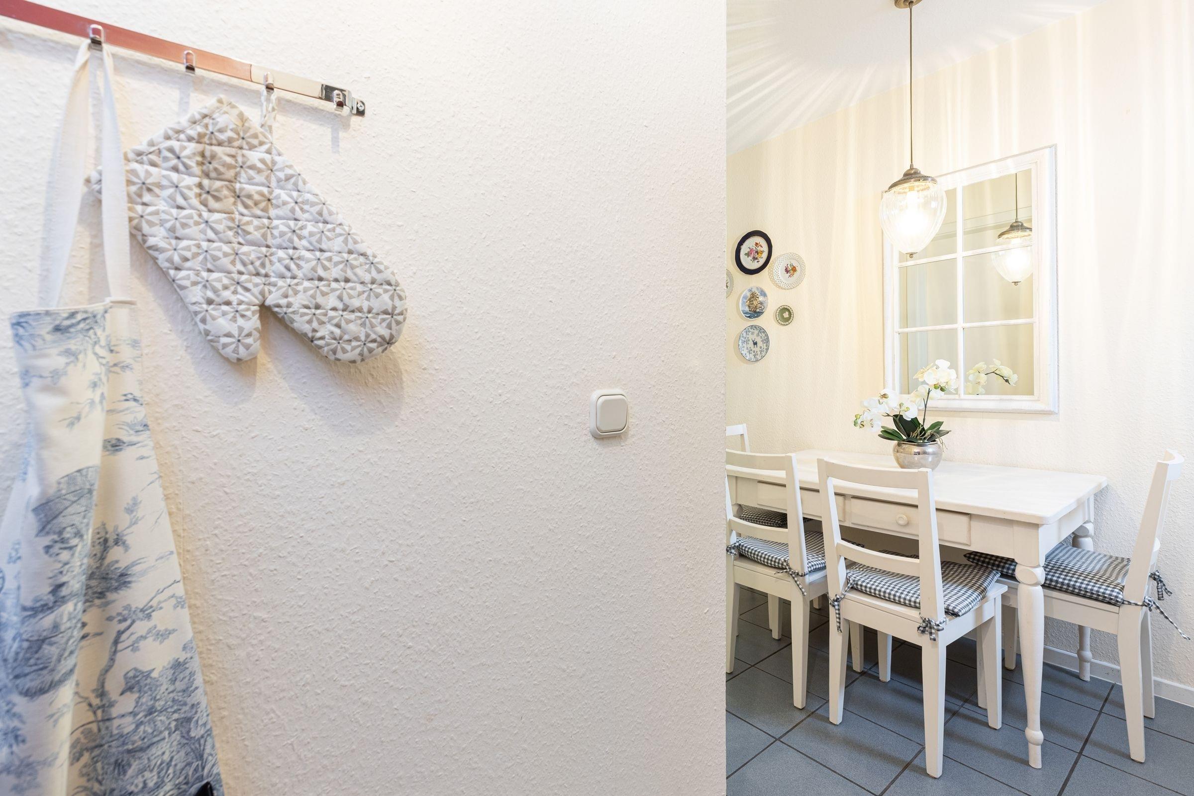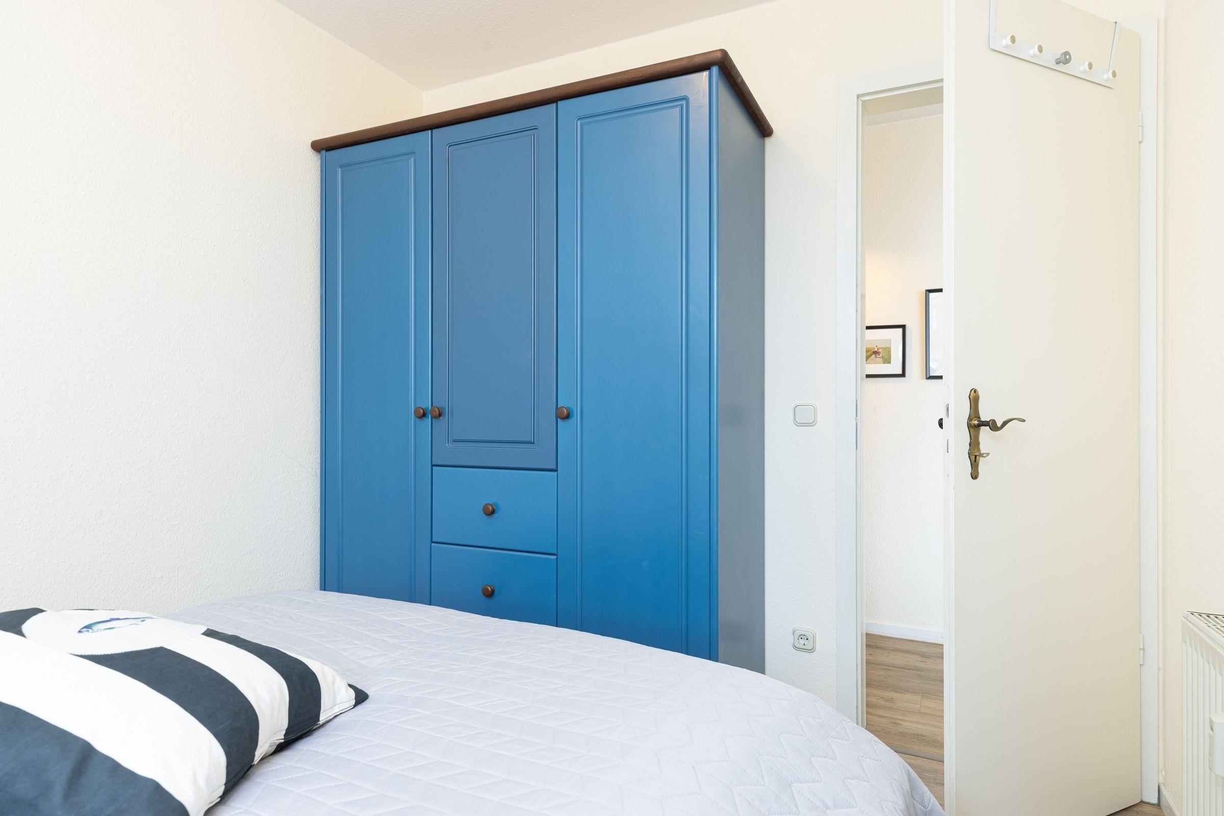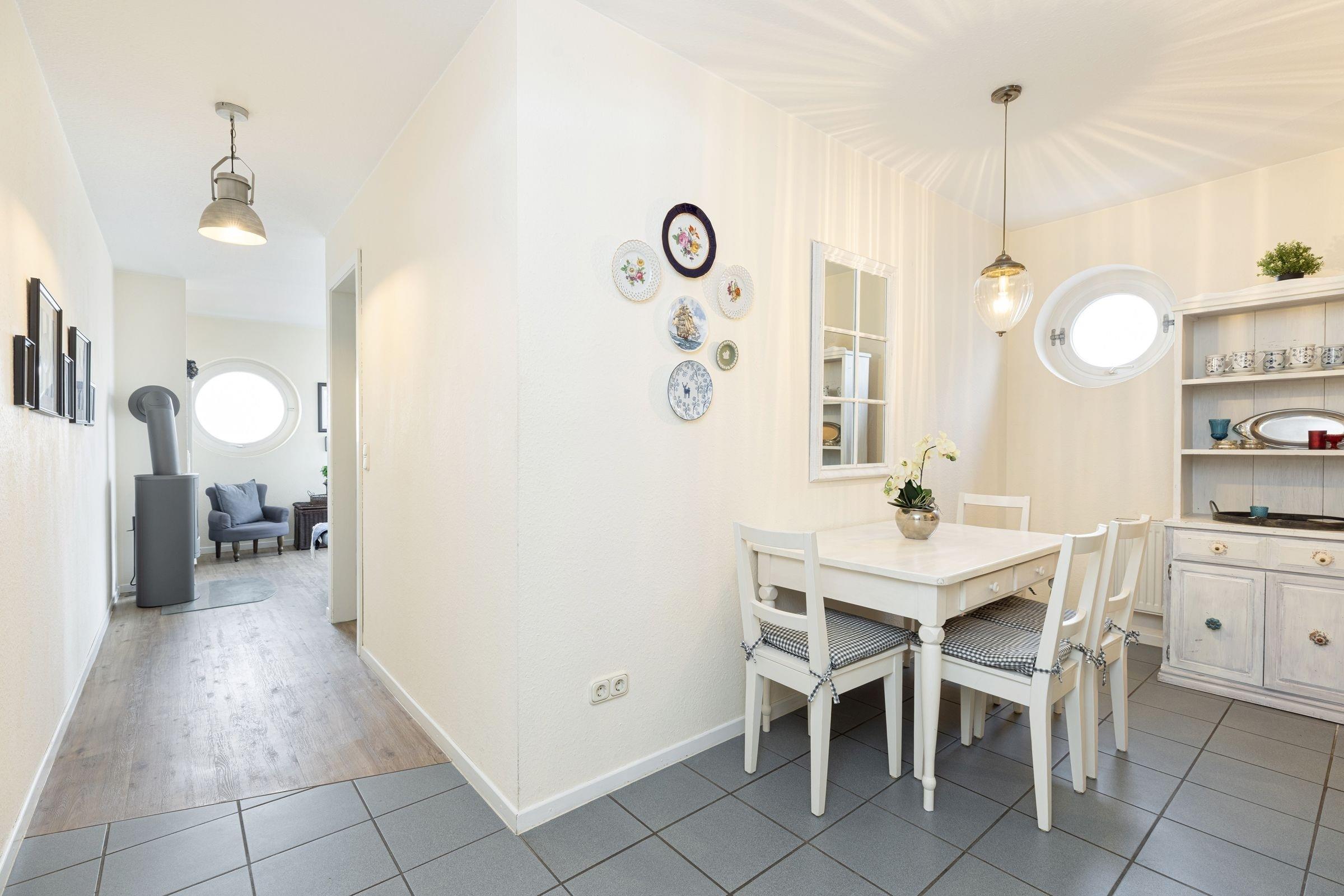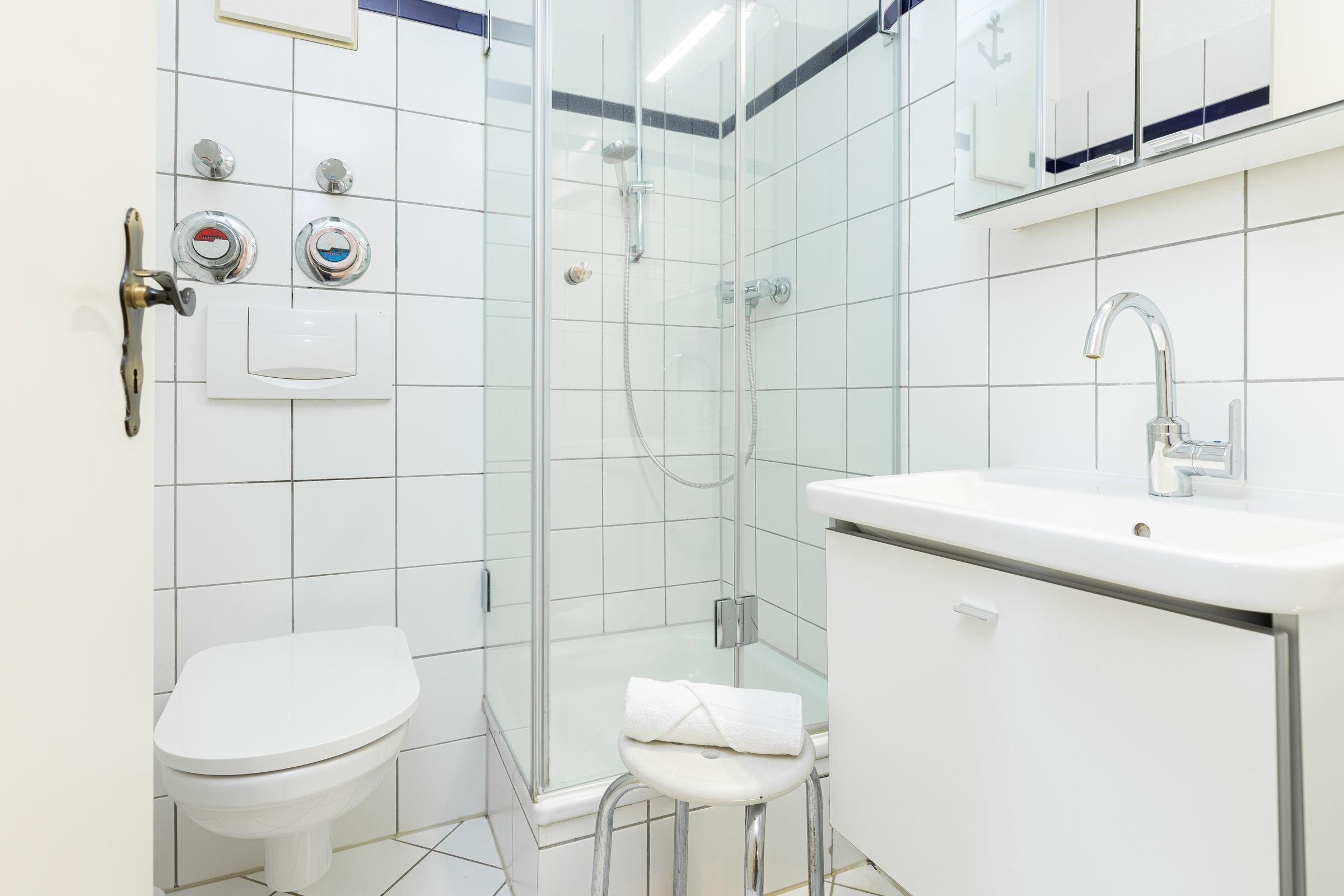 Das maritim eingerichtete Wohnzimmer empfängt Sie mit seinem fantastischen Blick und freie Sicht auf wilde Wellen und weiße Gischt. Ein Kaminofen sorgt für wohlige Wärme und gute Atmosphäre. Gemütliche Sitzgelegenheiten laden nach langen Strandspaziergängen zum Relaxen ein. Das Sofa bietet am Abend für zwei Personen Platz zum Schlafen (140x200 cm). Ein Flat-TV, ein DVD- und CD-Player sorgen hier für Unterhaltung. Von hier aus gelangen Sie auf den Balkon. Der erste Kaffee am Morgen, Ihre Tageszeitung zur Hand und Salz in der Luft. Die separate Küche erlaubt mit Ihrem 4-Platten-Ceranfeld, einer Mikrowelle und einem großen Kühlschrank auch das Zubereiten von größeren Speisen. Das süße Schlafzimmer ist mit einem 160x200 cm großen Doppelbett (1 Matratze) und einem Kleiderschrank für Ihre Urlaubsgarderobe ausgestattet. Das Duschbad ist hell, freundlich-frisch.