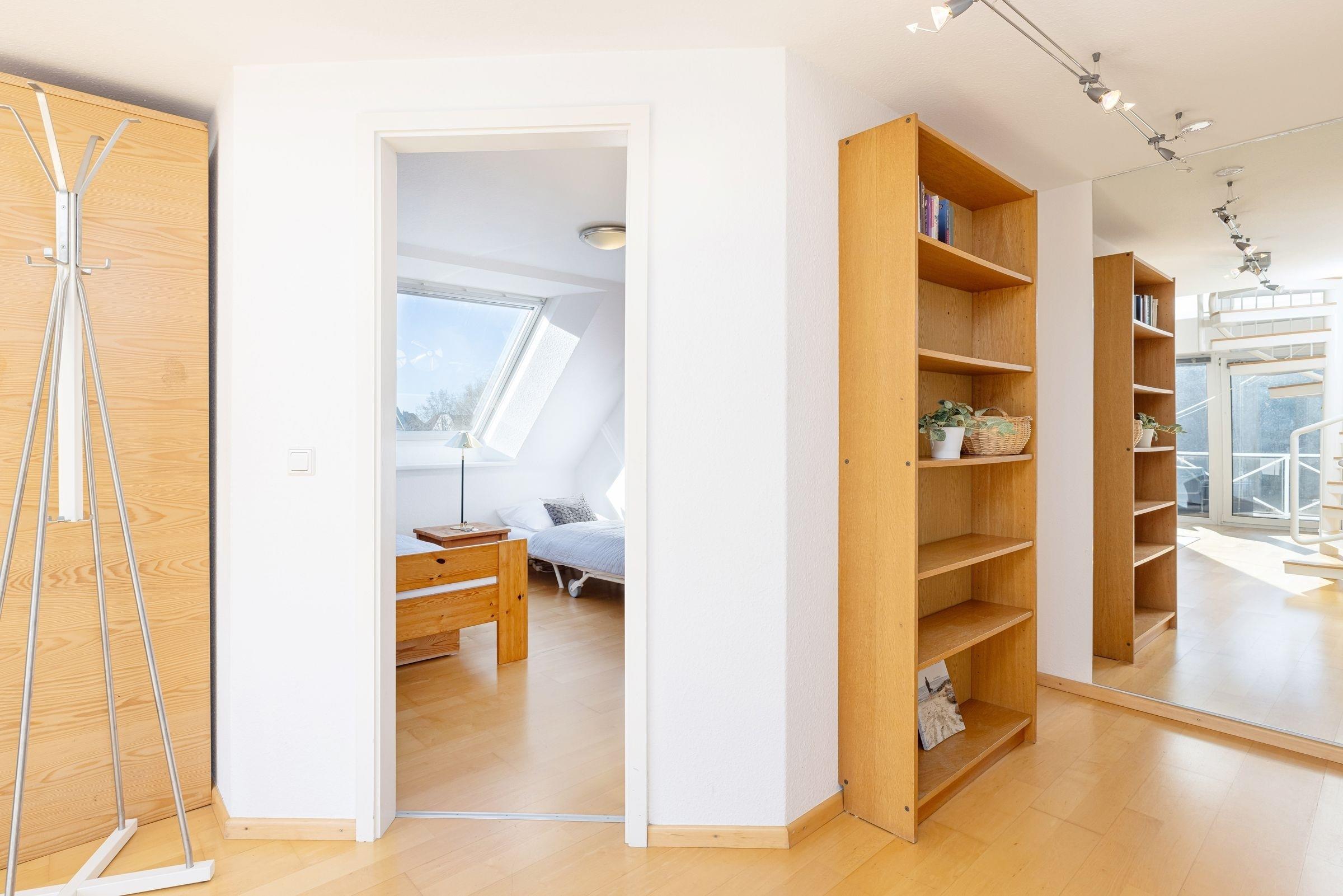 Wohnzimmer/DG: Doppelbett, Verdunkelung (Rollo), dieser Schlafbereich ist über eine Wendeltreppe erreichbar und zum Wohnbereich hin offen