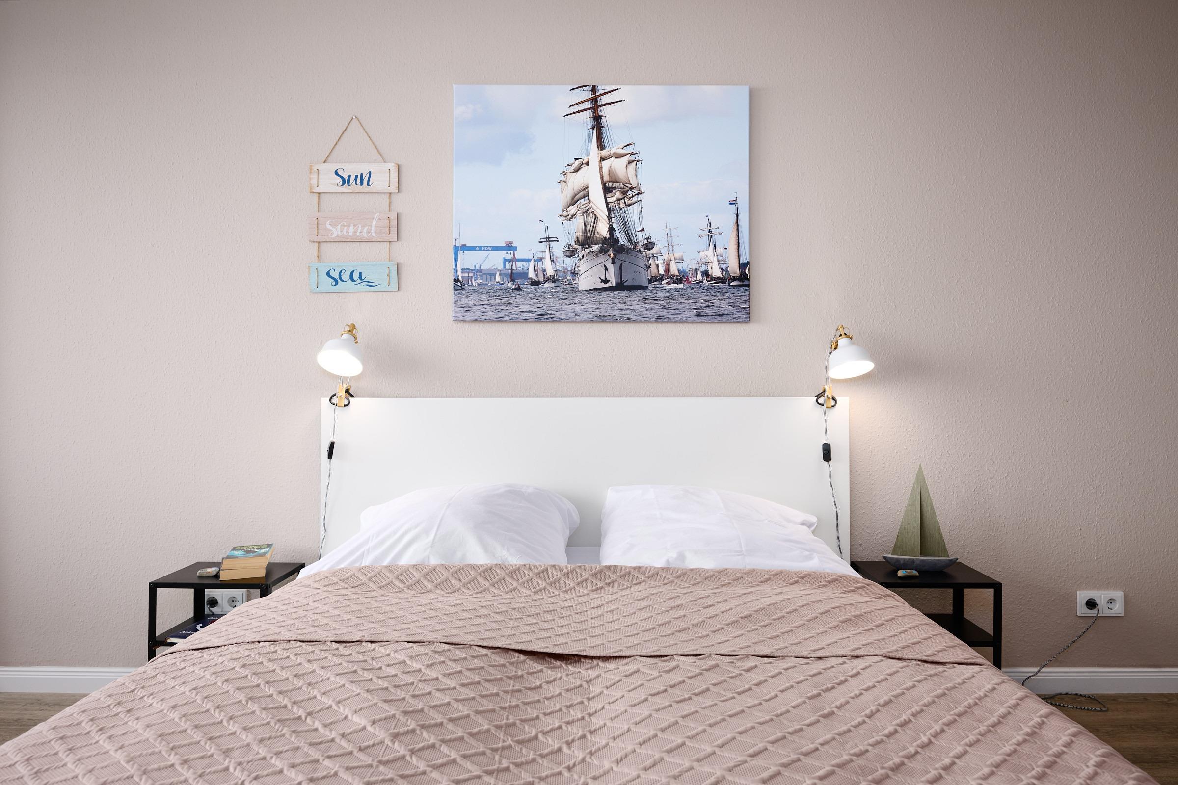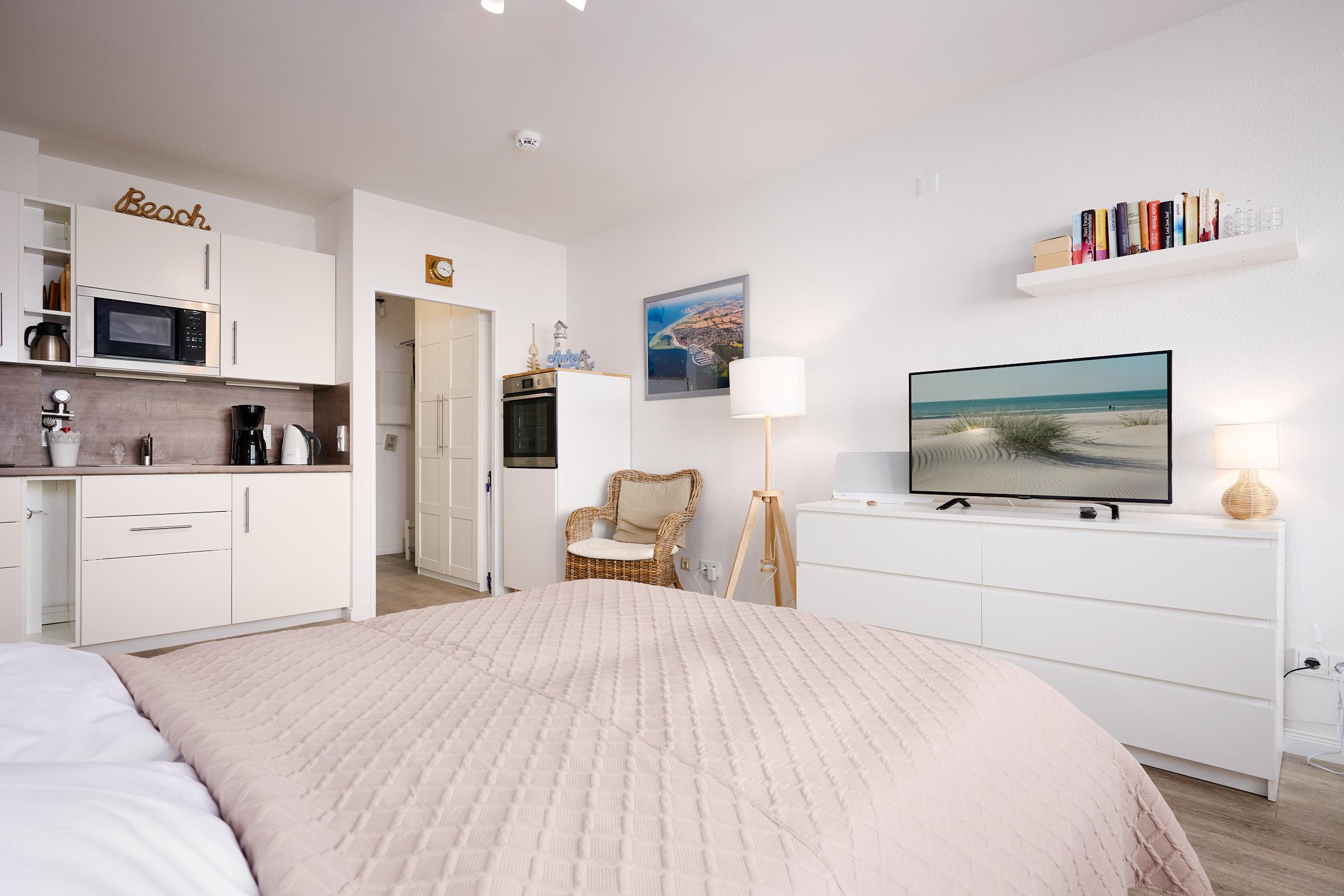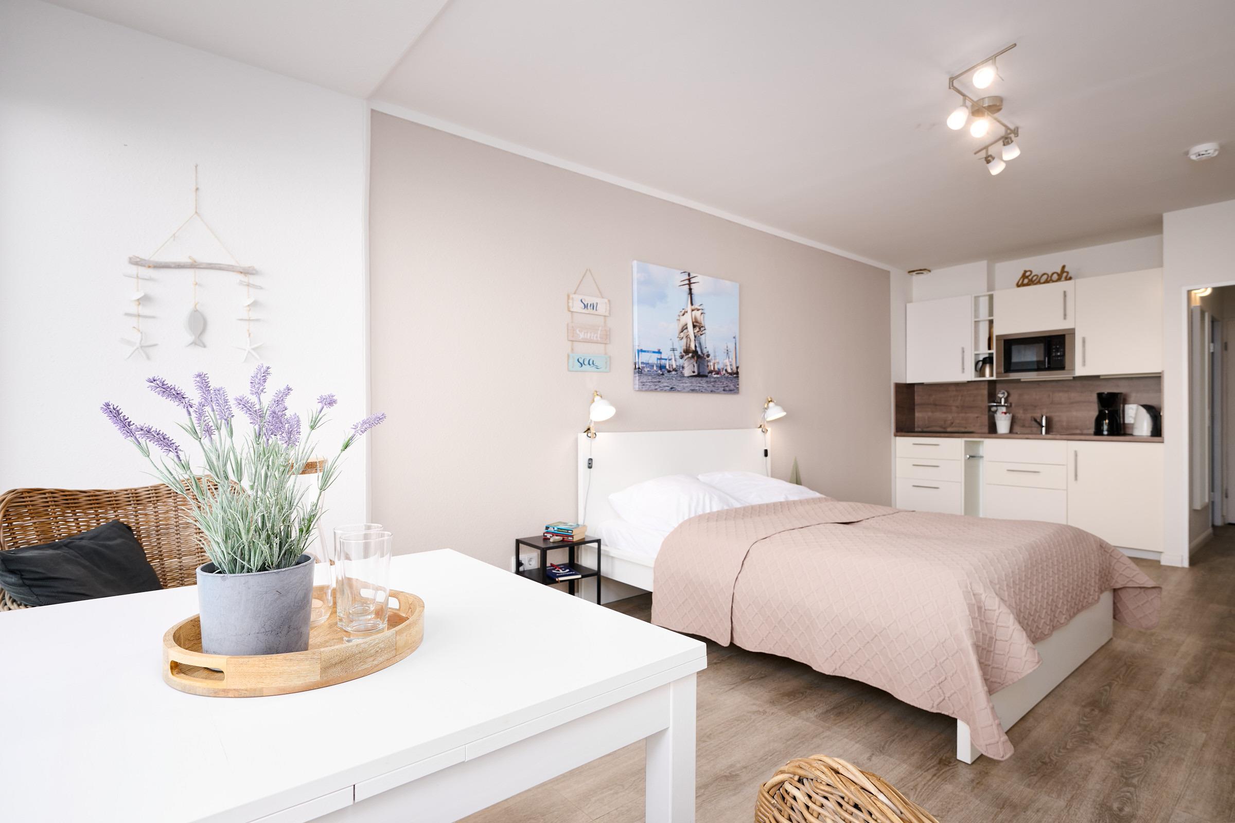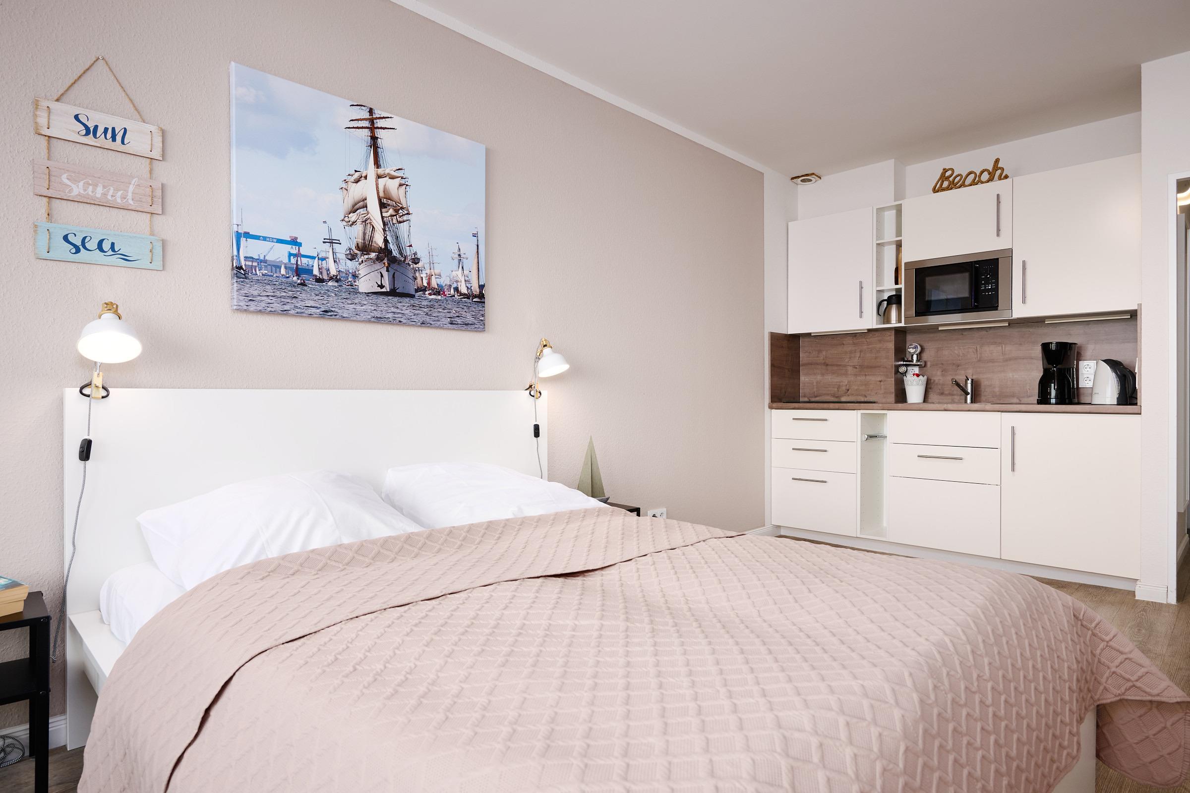 Klein und fein - mit viel Liebe ist der Wohn/Schlafbereich dieser zauberhaften Wohnung eingerichtet. Am Fenster befindet sich ein gemütlicher Essplatz, von dem Sie einen traumhaften Blick über den Hafen von Laboe und die Kieler Förde haben. Die moderne Küchenzeile ist mit einem Induktionsherd, einem Backofen, einer Mikrowelle und einem Kühlschrank mit Gefrierfach ausgestattet. Herrlich träumen werden Sie in dem bequemen Doppelbett (160x200cm). Auch von dort aus haben Sie das Wasser gut im Blick. Im Flur steht Ihnen ein Kleiderschrank, eine Kommode und eine Garderobe zur Verfügung. Das innenliegende Duschbad ist hell gefliest.
