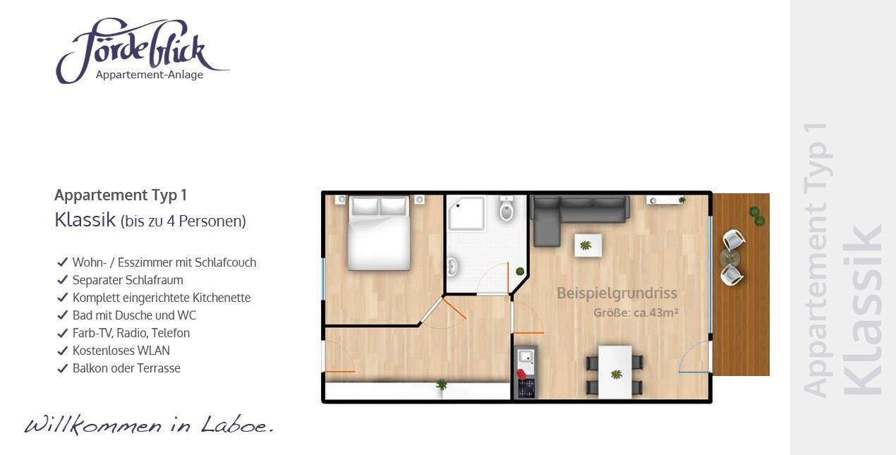 Das ca. 43 qm , für maximal 4 Personen liegt im Obergeschoß von Haus C.