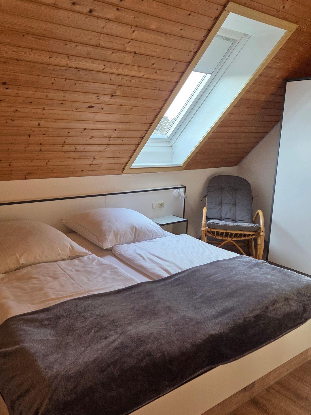 Das ca. 50 qm große Appartement ist für bis zu 4 Personen vorgesehen. Dieses Galerie Appartement ist im Maisonetten-Stil über 2 Etagen gehalten. Es ist mit einem Wohn-, Esszimmer mit Schlafcouch für 2 Personen und einem Doppelbett auf der offenen Galerie ausgestattet. Es verfügt über eine komplett ausgestattete Kitchenette, Mikrowelle, Bad mit Dusche und WC sowie Kabel- TV Flat-Screen), Radio und einen Dachbalkon. Tiere nur auf Anfrage. Kostenfreies WLAN, Parkplatzt vor dem Haus.