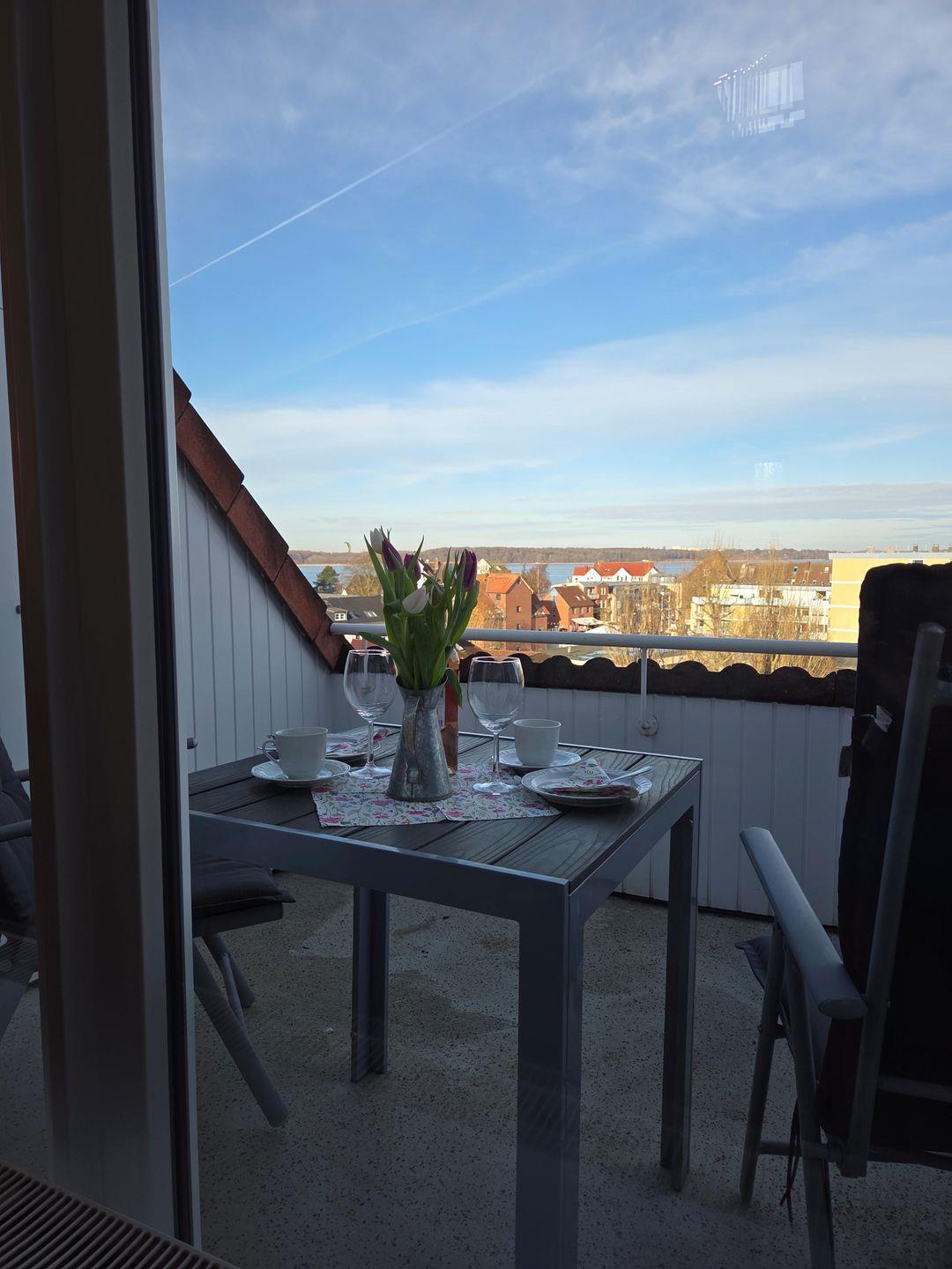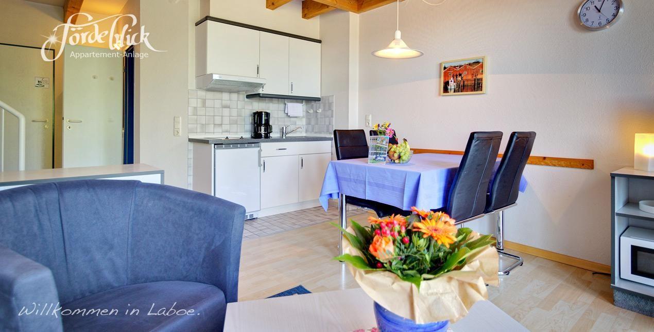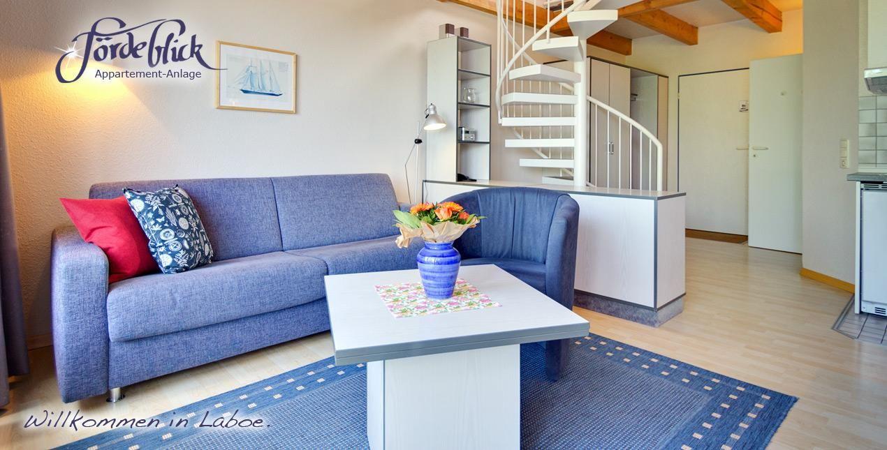 Dieses Galerie-Appartement ist ca. 50qm groß und im Maisonetten-Stil erbaut . Vom Wohn- Essraum erreicht man über eine Wendeltreppe den Schlafbereich auf der offenen Galerie. Ein Doppelbett je 90cm breit, unter dem holzverkleideten Dach bietet ein sehr gemütliches Ambiente. Im Wohn- Essraum bietet eine bequeme Schlafcouch Platz für zwei weitere Personen. Die gut eingerichtete Küchenzeile mit einem Ceranfeld und Kühlschrank sowie Kaffeemaschine und Wasserkocher gehört mit dazu. Eine große 3m breite und raumhohe Fensterfront lässt die Wohnung hell und freundlich erscheinen. Schon von dieser Fensterfront aus können Sie auf die Kieler Förde schauen. Vom gemütlichen Dachbalkon genießen Sie eine herrliche Aussicht auf die See mit den vorbeifahrenden roßen "Pötten" Hier werden Sie Ihren Urlaub in Laboe sehr genießen. Weitere Ausstattungsmerkmale sind: Kabel-TV, Radio und Mikrowelle. Ein kleines Bad mit Dusche und WC neben der geräumigen Diele steht zu Ihrer Verfügung, ebenso ein kostenfreies leistungsfähiges WLAN mit sehr einfachem Zugang.