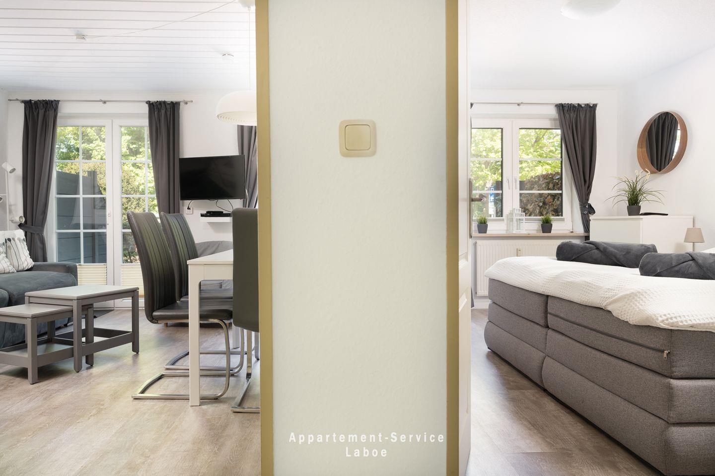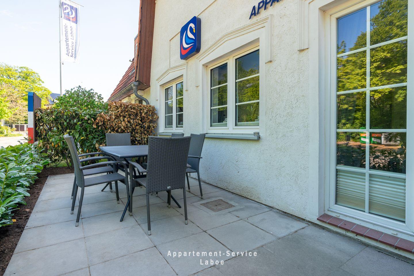 FeWo Parkpension W03: 2-Zimmer-Wohnung, ca. 50 m², im Erdgeschoss, für bis zu 4 Personen. Wohnbereich mit Schlafcouch, TV, WLAN, Esstisch und offener Küchenzeile mit Ceranfeld, Backofen, Kühlschrank mit Gefrierfach, Geschirrspüler und Kaffeemaschine. Schlafzimmer mit Doppelbett. Badezimmer mit Dusche, WC, Haartrockner und Kosmetikspiegel. Möblierte Terrasse. Gemeinschaftsdachterrasse mit Grill, Wellnessgarten mit Fass-Sauna, Hot-Tub und saisonalem Pool (Mai–September). Waschraum, Fahrradstellplatz, abschließbarer Schuppen. Pkw-Stellplatz und Wallbox vorhanden. Haustiere erlaubt. Ca. 150?m zum Strand, zentrale Lage in Laboe.