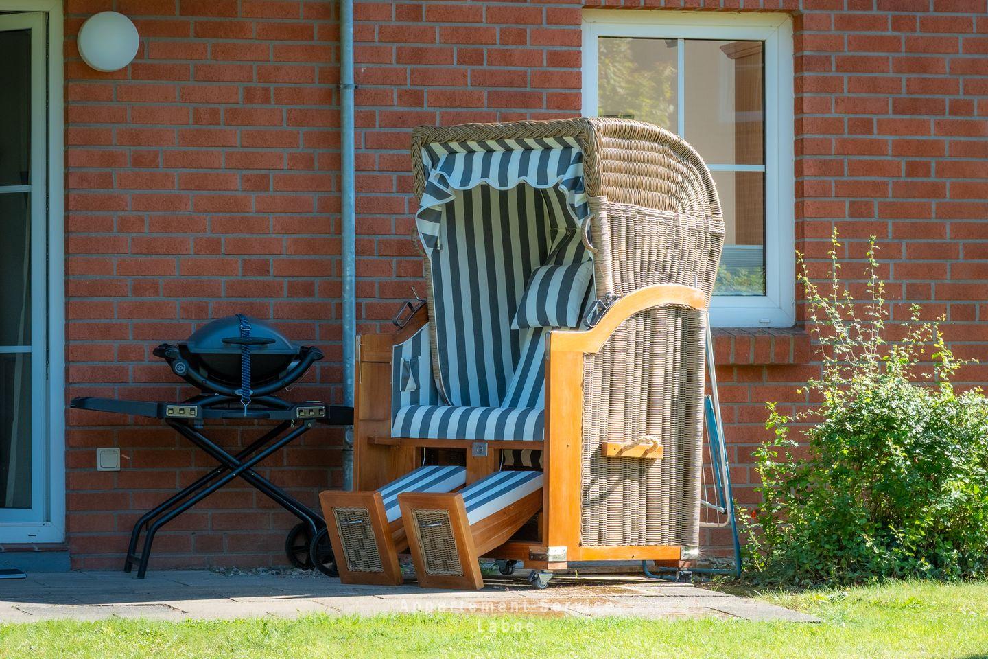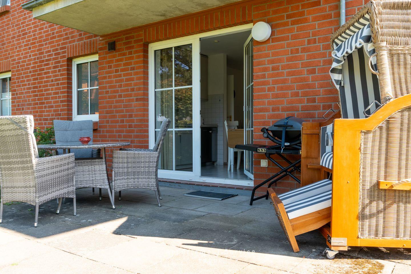 Die offene Küchenzeile ist ein kleines Highlight: Praktisch, modern und mit allem ausgestattet, was du brauchst. Ob ein schnelles Frühstück oder ein ausgedehntes Abendessen – hier macht Kochen Spaß. Der Essplatz direkt daneben lädt zu entspannten Mahlzeiten ein, vielleicht mit einem Glas Wein und Blick auf die Terrasse. Apropos Terrasse: Sie ist das Herzstück dieser Wohnung. Mach es dir im Strandkorb bequem, atme die frische Meeresluft ein und lass einfach die Seele baumeln. Hier kannst du die Sonne genießen oder den Tag ganz entspannt ausklingen lassen – mehr Urlaubsgefühl geht nicht.