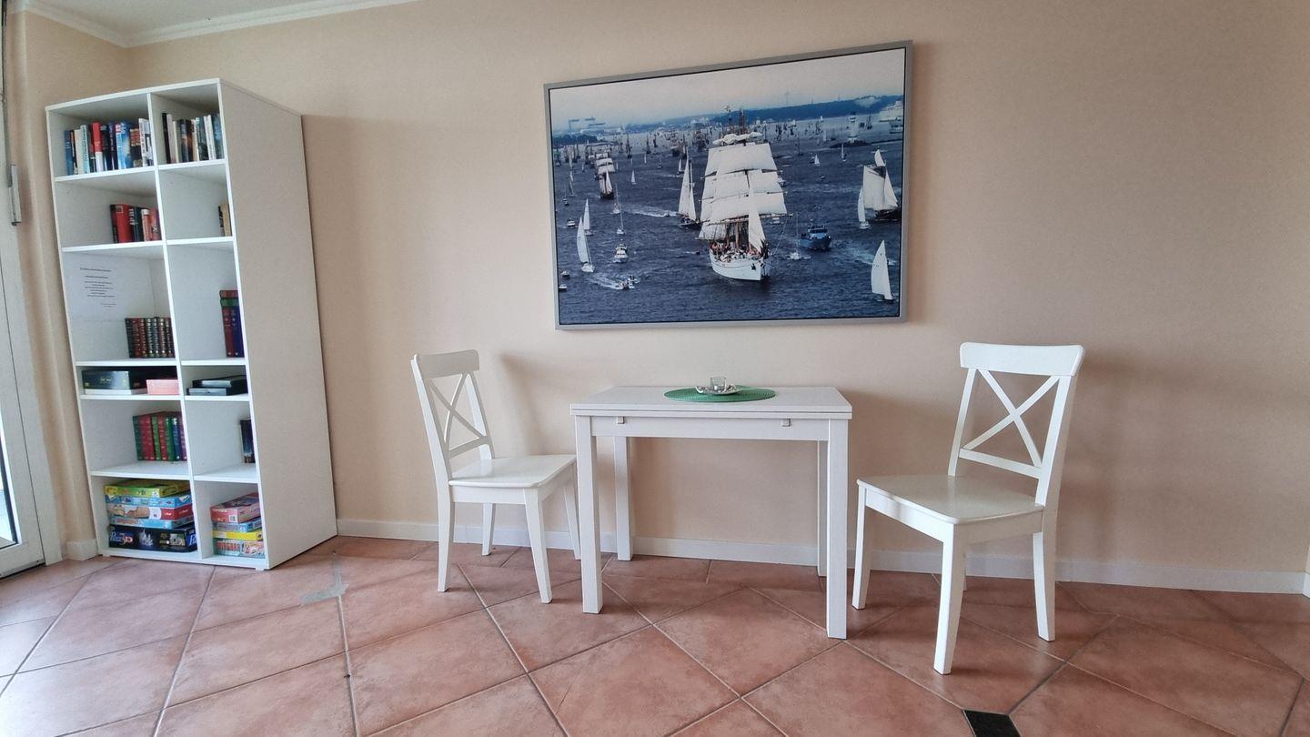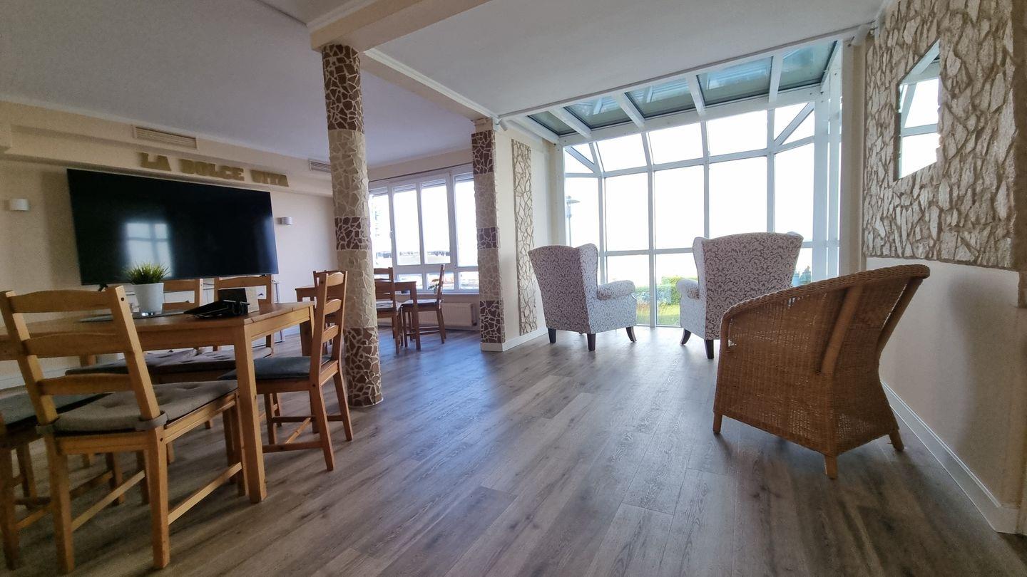 Ein besonderes Extra ist der gemeinschaftliche Aufenthaltsraum im Haus. Hier laden gemütliche Sitzgruppen und Ohrensessel zum Verweilen ein. Große Fenster bieten einen schönen Blick auf die Promenade, den Strand und die Förde. Ob du ein Buch liest, Gesellschaftsspiele nutzt oder einen Film auf dem Flatscreen-TV schaust – dieser Raum bietet dir zusätzliche Entspannung mit maritimer Kulisse.