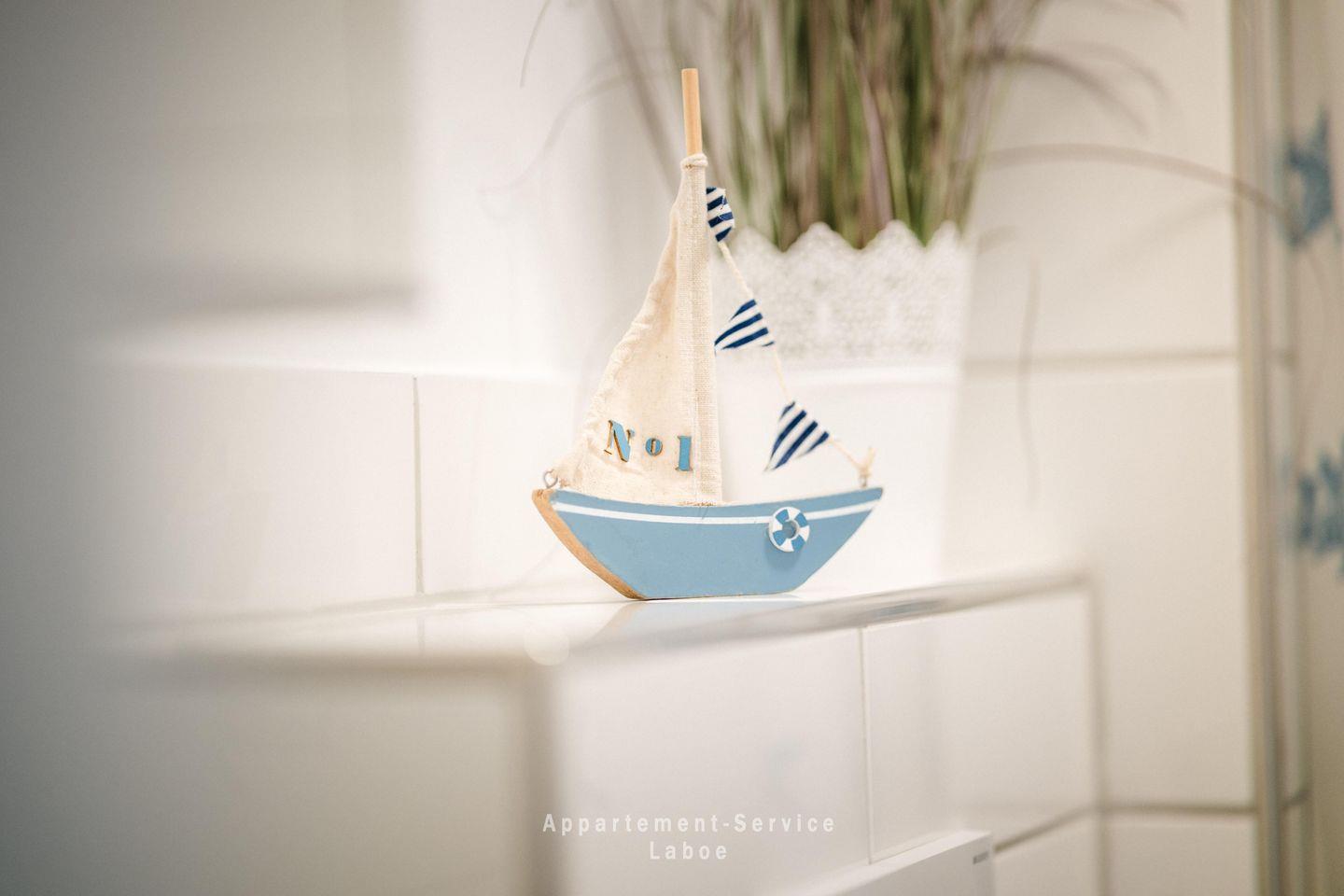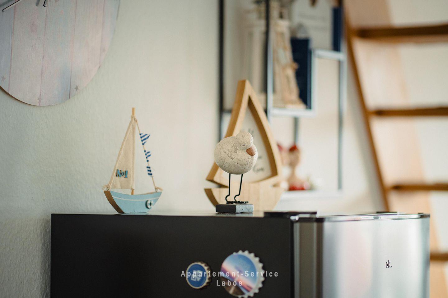 FeWo Kapitänshaus W16: 3-Zimmer-Wohnung, 50 m², im 2. Obergeschoss, für bis zu 4 Personen. Wohnbereich mit Sofa, TV, HiFi-Anlage, WLAN und Zugang zum Balkon. Offene Küche mit Ceranfeld, Backofen, Mikrowelle und Essplatz. Zwei Schlafzimmer: eines mit Doppelbett, eines mit zwei Einzelbetten. frisch renoviertes (2026) Badezimmer mit Dusche (rutschhemmende Duschwanne) und WC. Balkon. Tiefgaragenstellplatz (Durchfahrtshöhe max. 1,90 m). Fahrradabstellplatz und Waschraum mit Waschmaschine und Trockner (Münzeinwurf) im Haus. Zentrale Lage im Ortskern von Laboe, ca. 120 m zum Strand, fußläufig zum Hafen und Kurpark.