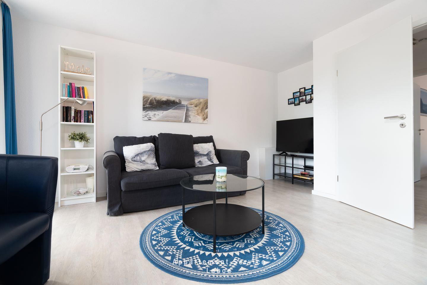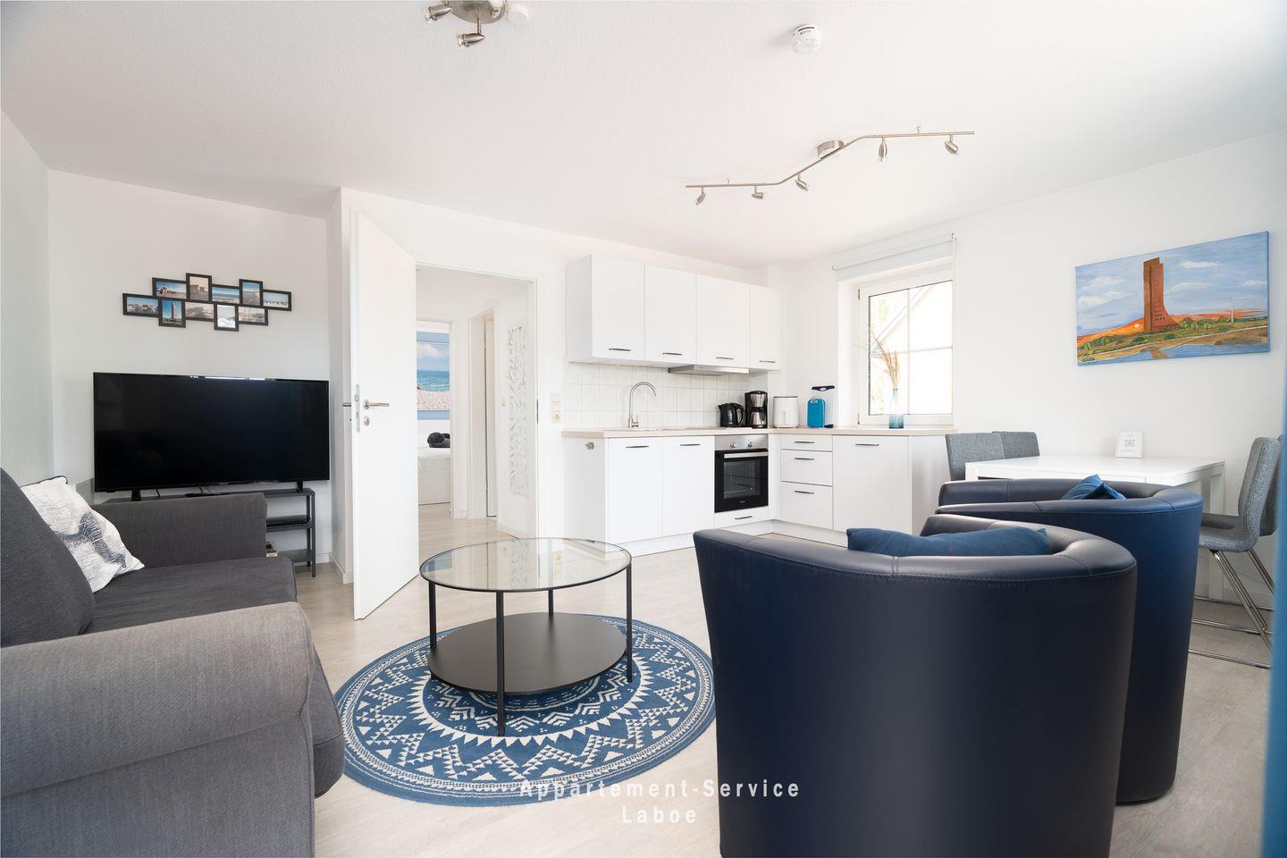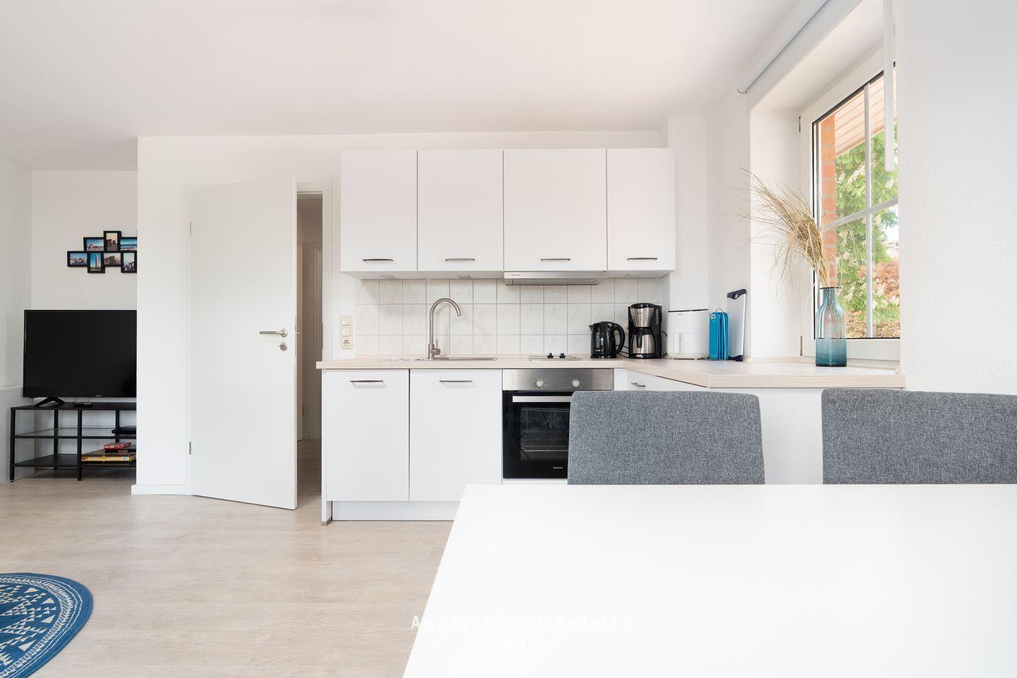 Die Wohnung ist freundlich und funktional eingerichtet – mit Platz für bis zu vier Personen. Der kleine Eingangsbereich führt direkt in das Wohn-Esszimmer mit Küchenzeile, Esstisch und Zugang zum Balkon. Die Küchenzeile bietet alles, was du für den Urlaub brauchst – inklusive Kühlschrank, Kochfeld, Mikrowelle und Kaffeemaschine. Die Schlafcouch im Wohnzimmer lässt sich mit wenigen Handgriffen zur gemütlichen Übernachtungsmöglichkeit für zwei weitere Gäste umfunktionieren.