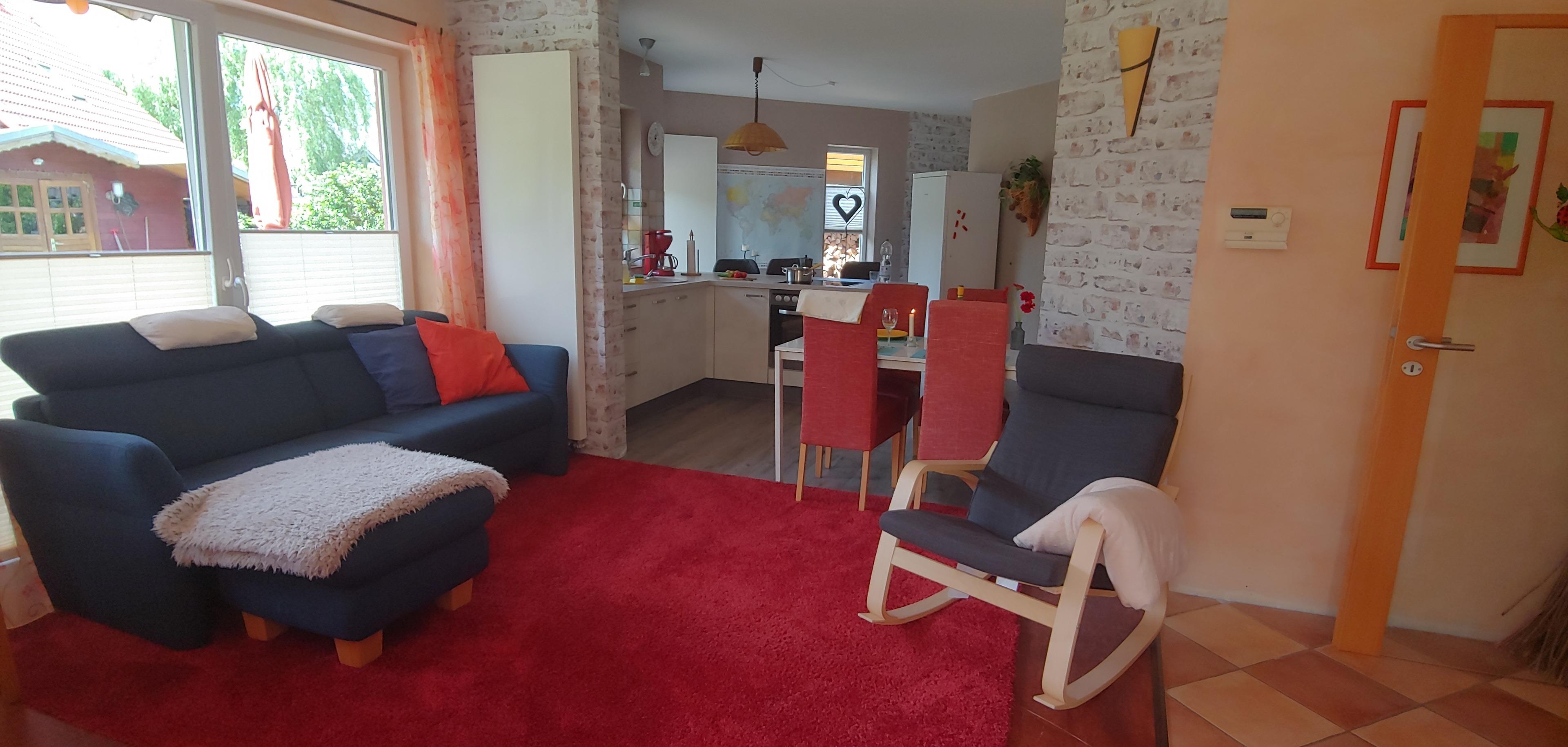 - Küchen-Ess-Wohnbereich mit Holzboden, hinterm Paravant steht ein Französisches Bett 1.40x2,00 m