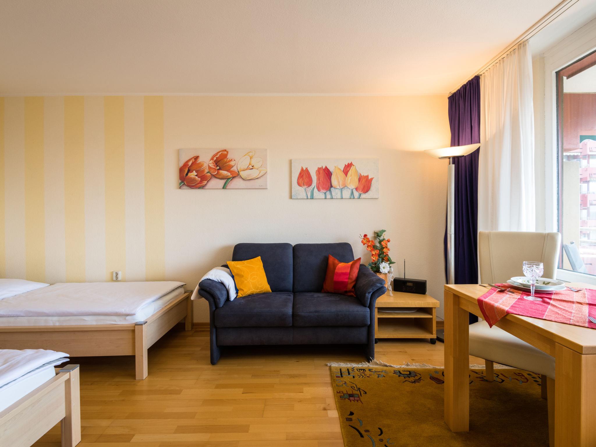 "Sonnenblume (B615)", 1-room apartment 33 m2 on 6th floor, south facing position. Beautiful furnishings: living/sleeping room with 2 beds (100 cm, length 200 cm), satellite TV (flat screen). Exit to the balcony. Kitchenette in the entrance (2 ceramic glass hob hotplates, toaster, kettle, electric coffee machine). Shower/WC. Balcony furniture. Beautiful view of the countryside. Facilities: Internet (WiFi, free). Please note: non-smokers only. Smoke alarm.