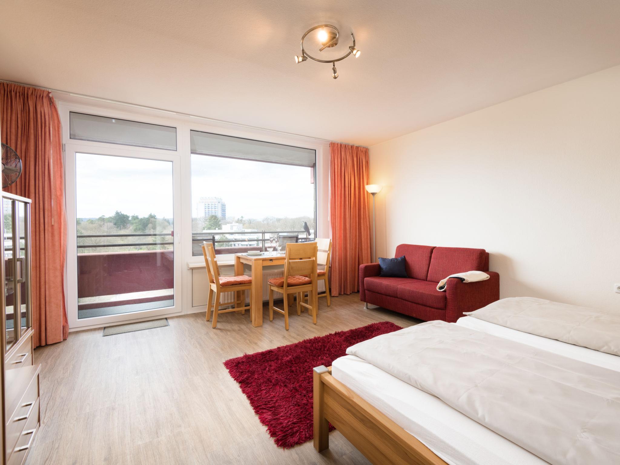 "Eifelblick (B906)", 1-room apartment 33 m2 on 9th floor, west facing position. Beautiful and modern furnishings: living/sleeping room with 1 double bed (2 x 100 cm, length 200 cm), satellite TV (flat screen). Exit to the balcony. Kitchenette in the entrance (2 ceramic glass hob hotplates, toaster, kettle, electric coffee machine). Shower/WC. Balcony furniture. Very beautiful view of the countryside. Facilities: Internet (WiFi, free). Please note: non-smokers only. Smoke alarm. Bookings accepted for holiday purposes only.