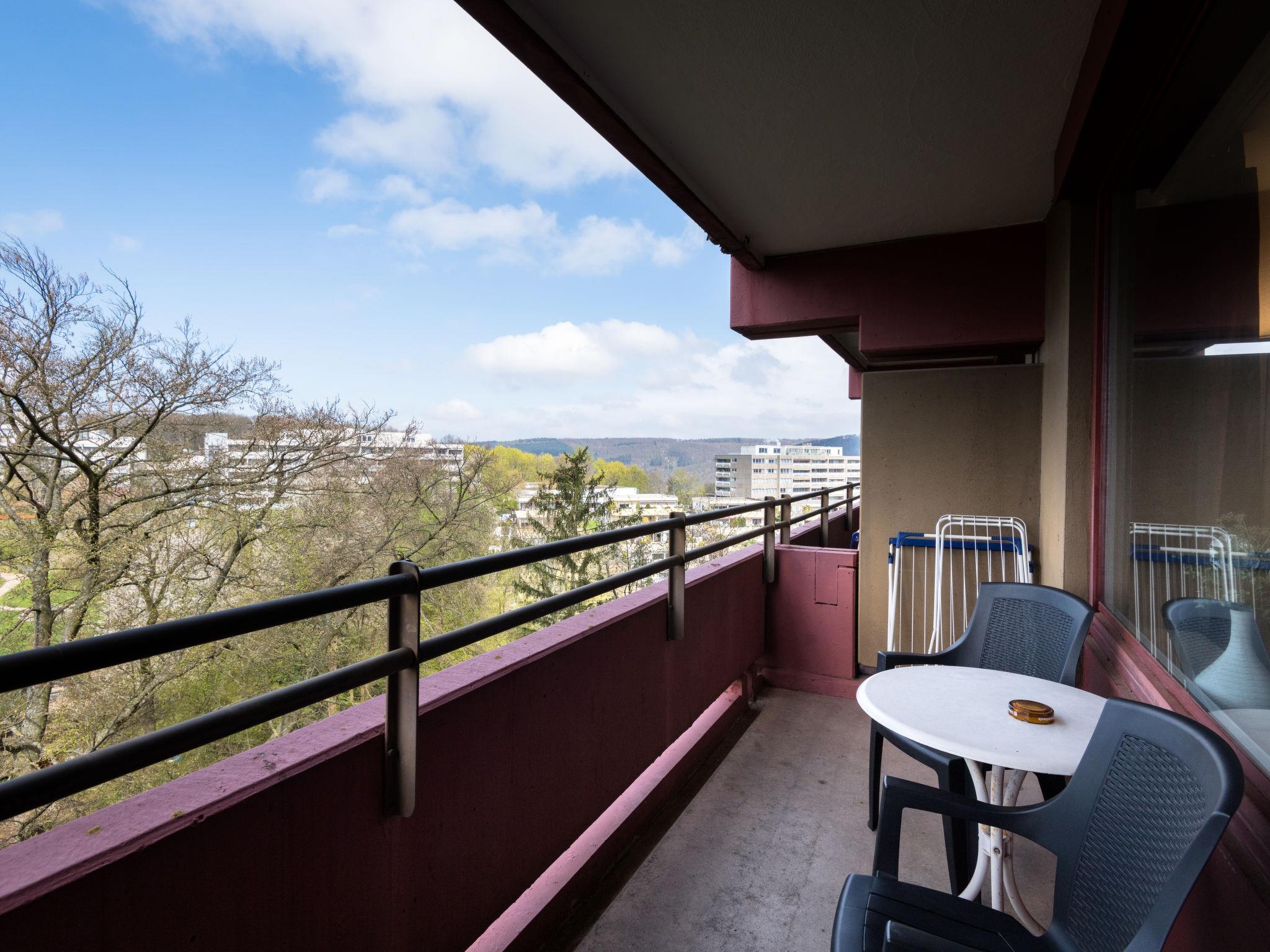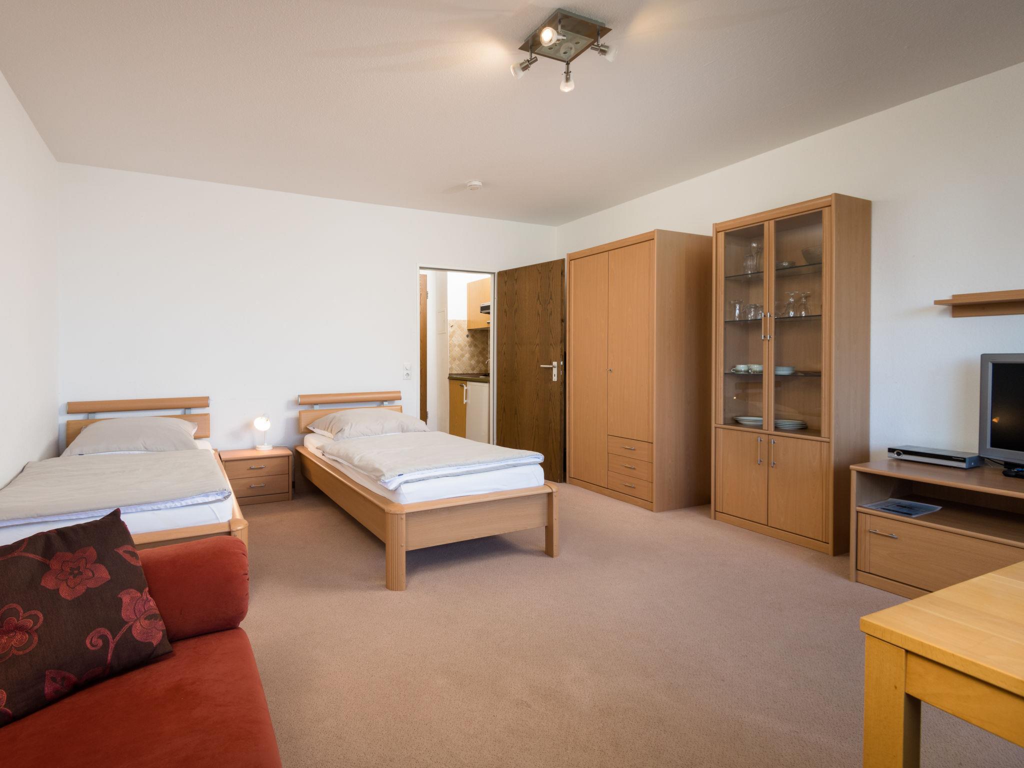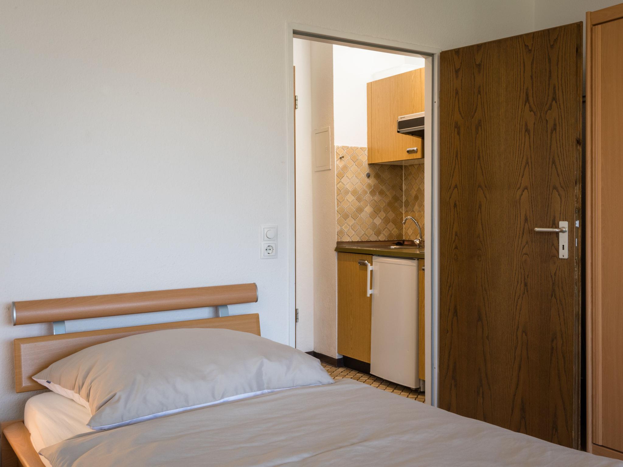 "Baumblick (B610)", 1-room apartment 33 m2 on 6th floor, west facing position. Living/sleeping room with 2 beds (100 cm, length 200 cm), satellite TV. Exit to the balcony. Kitchenette in the entrance (2 hot plates, toaster, kettle, electric coffee machine). Bath/shower/WC. Balcony furniture. Facilities: Internet (WiFi, free). Please note: non-smokers only. Maximum 1 pet/ dog allowed. Smoke alarm.