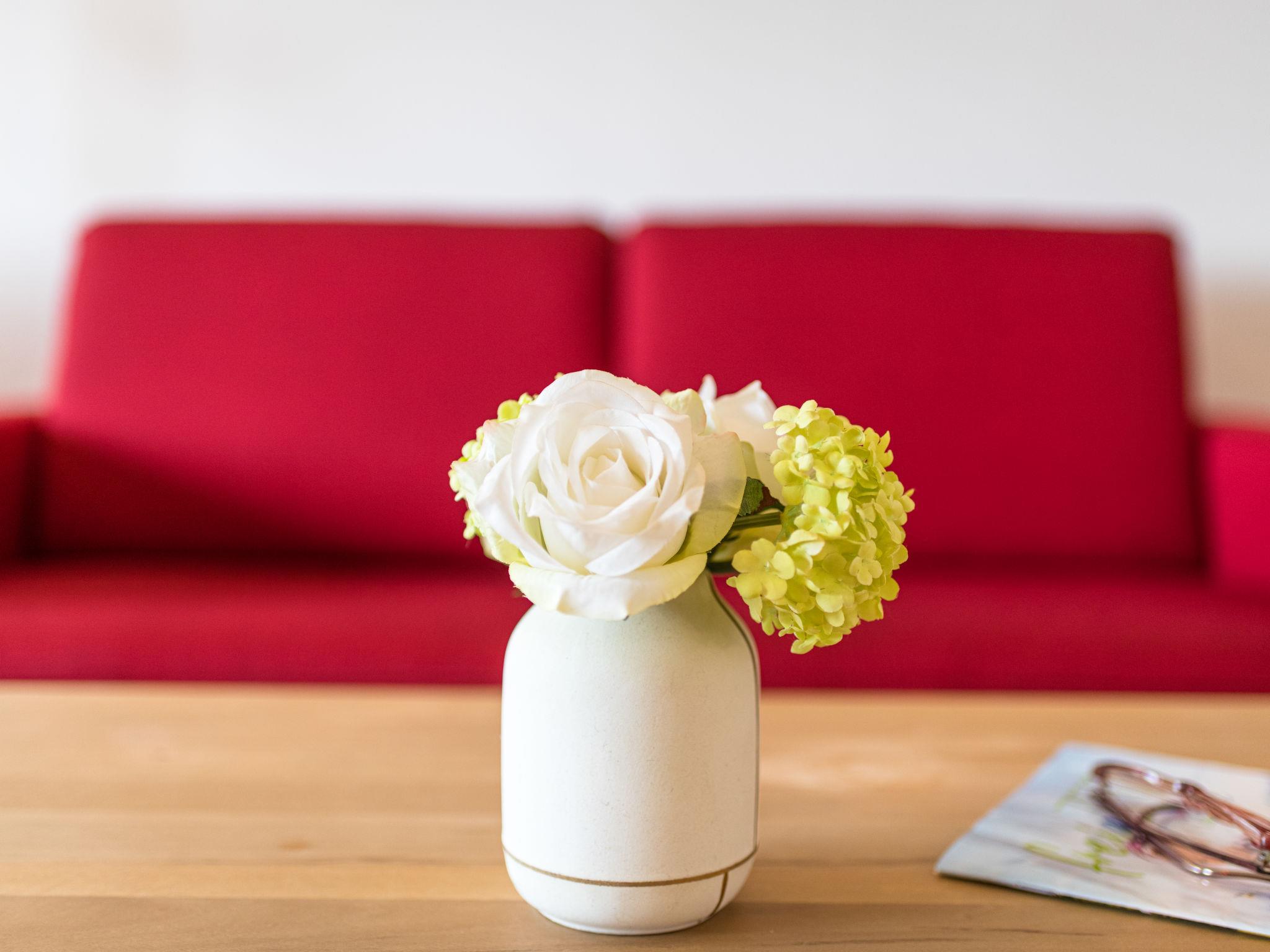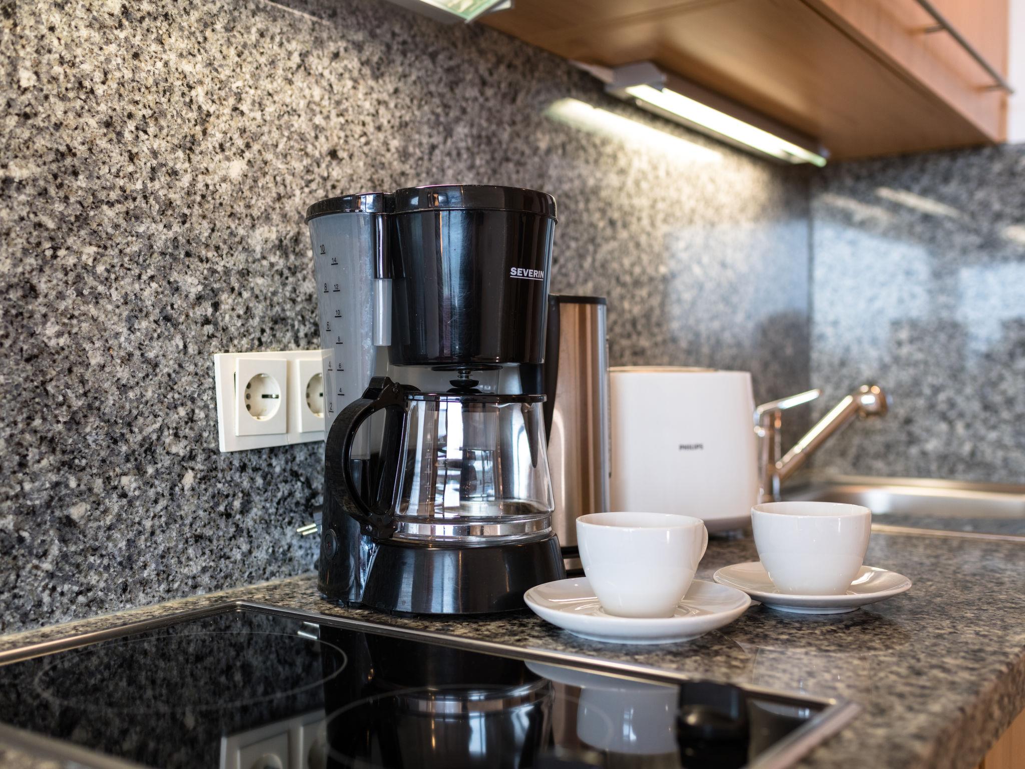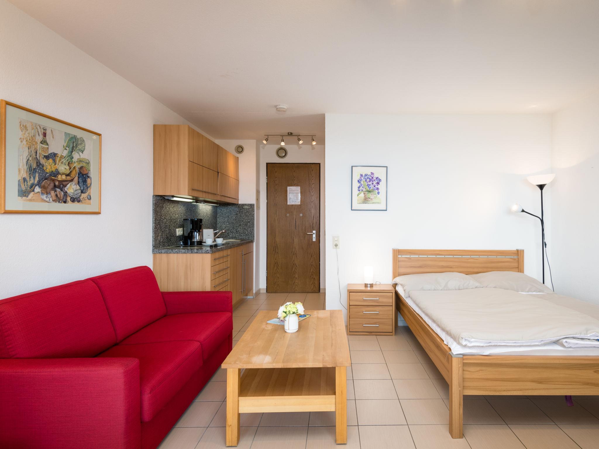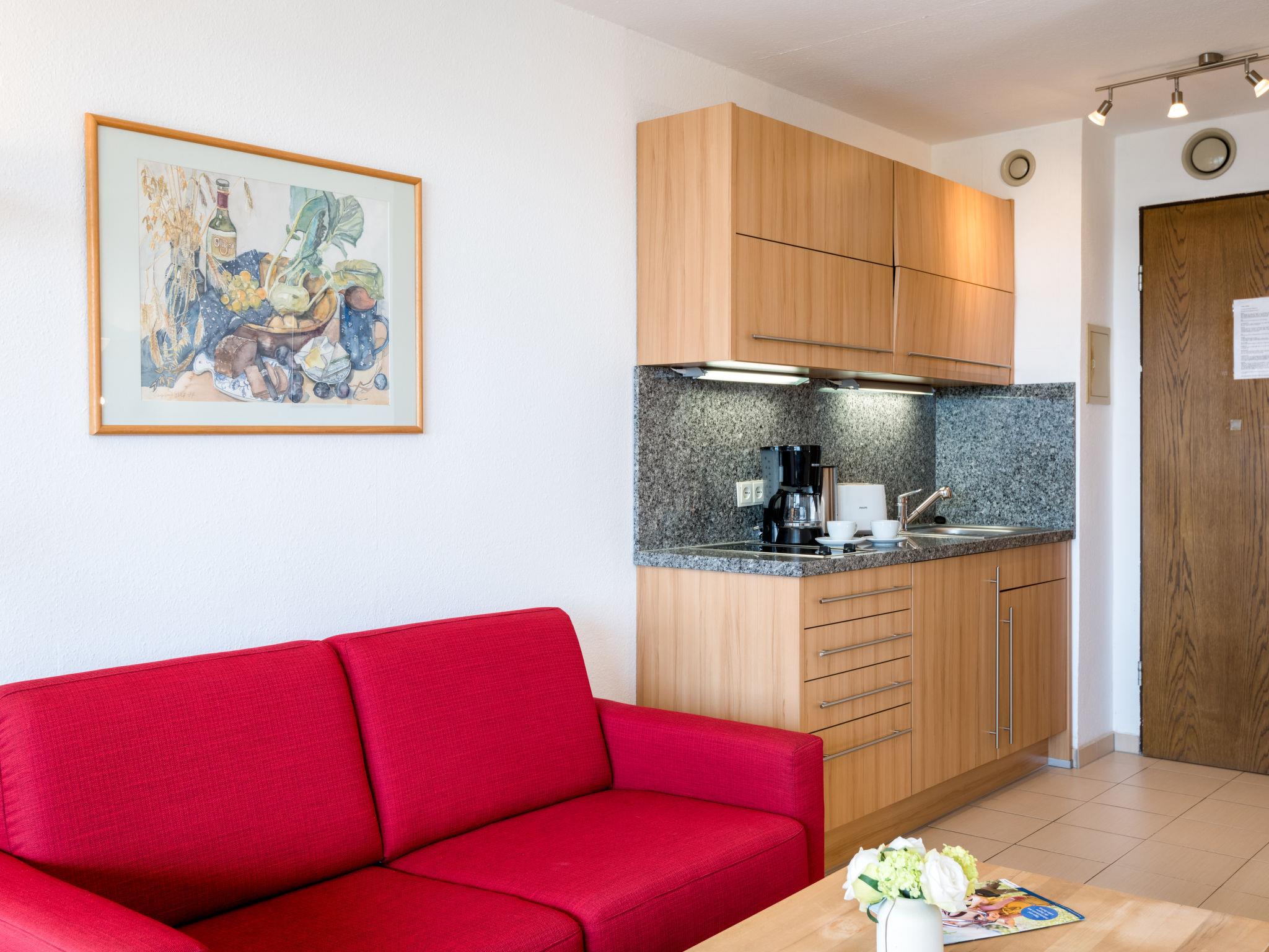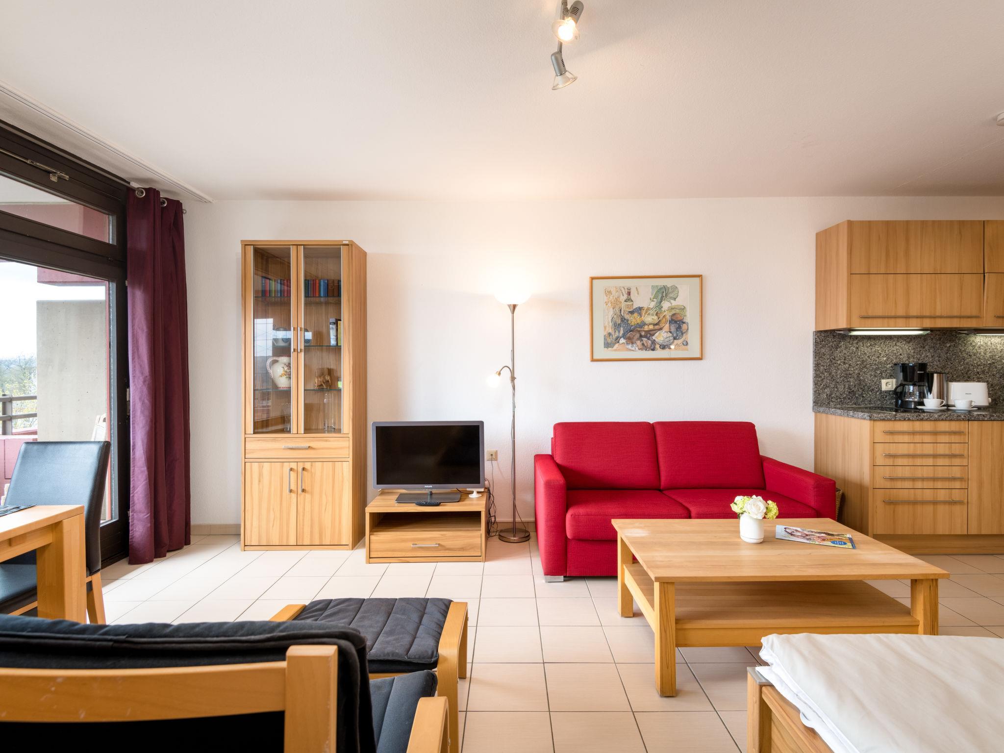 "Amsel (A410)", 1-room apartment 33 m2 on 4th floor, south facing position. Living/sleeping room with 1 french bed (140 cm, length 200 cm), satellite TV (flat screen). Exit to the balcony. Kitchenette in the entrance (2 ceramic glass hob hotplates, toaster, kettle, electric coffee machine). Shower/WC. Balcony furniture. Beautiful view of the countryside. Facilities: Internet (WiFi, free). Please note: non-smokers only. Maximum 1 pet/ dog allowed. Smoke alarm.