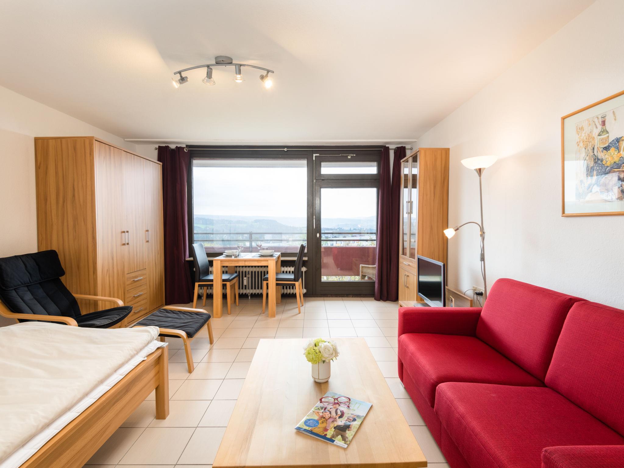 Lahnstein 12 km from Koblenz: Apartment block "Ferienpark Rhein-Lahn". In the district of Lahnstein auf der Höhe 4 km from the centre of Lahnstein, 12 km from the centre of Koblenz, 4 km from the river. For shared use: indoor pool (11 x 6 m, depth 120 cm) with internal staircase. Shower/WC in the pool area. In the complex: reception, WiFi, table tennis, lift, central heating system, washing machine, tumble dryer (for shared use, extra). Parking at the house. E-charging station. Grocery 200 m, supermarket 4.5 km, restaurant 800 m, bakery 4.5 km, bicycle rental 4.5 km, 45 minute walk to the centre, bus stop "Kurklinik" 200 m, railway station "Koblenz (HBF)" 12 km, park "Kurpark" 200 m, outdoor swimming pool 1.5 km, indoor swimming pool 5 km, thermal baths "Emser Therme" 10 km. Golf course (18 hole) 16 km, tennis 500 m, minigolf 6 km, walking paths from the house 100 m, cycle lane 4.5 km, children's playground 100 m. Nearby attractions: Burg Lahneck 3 km, Marksburg 7 km, Deutsches Eck Koblenz / Seilbahn 10 km, Schloss Stolzenfels 13 km. Hiking paths: Lahn-Höhenweg 100 m, Rheinsteig (11) 100 m, Jakobswege Rhein-Lahn. Please note: car recommended. Lahn River 4 km. Boat trips (KD) on the Rhine 4.5 km. Moselle River 10 km. A small kiosk with a small animal enclosure is 300 m away. The Rhein-Lahn holiday park is located 200 m above the town of Lahnstein, in the heart of the 530 km² Nassau Nature Park. It consists of two interconnected apartment buildings and its own Interhome service office. Smoking is permitted on the balconies of the apartments. An 11 kW electric charging station is located in the parking lot. Usage and billing are handled through the Interhome service office.