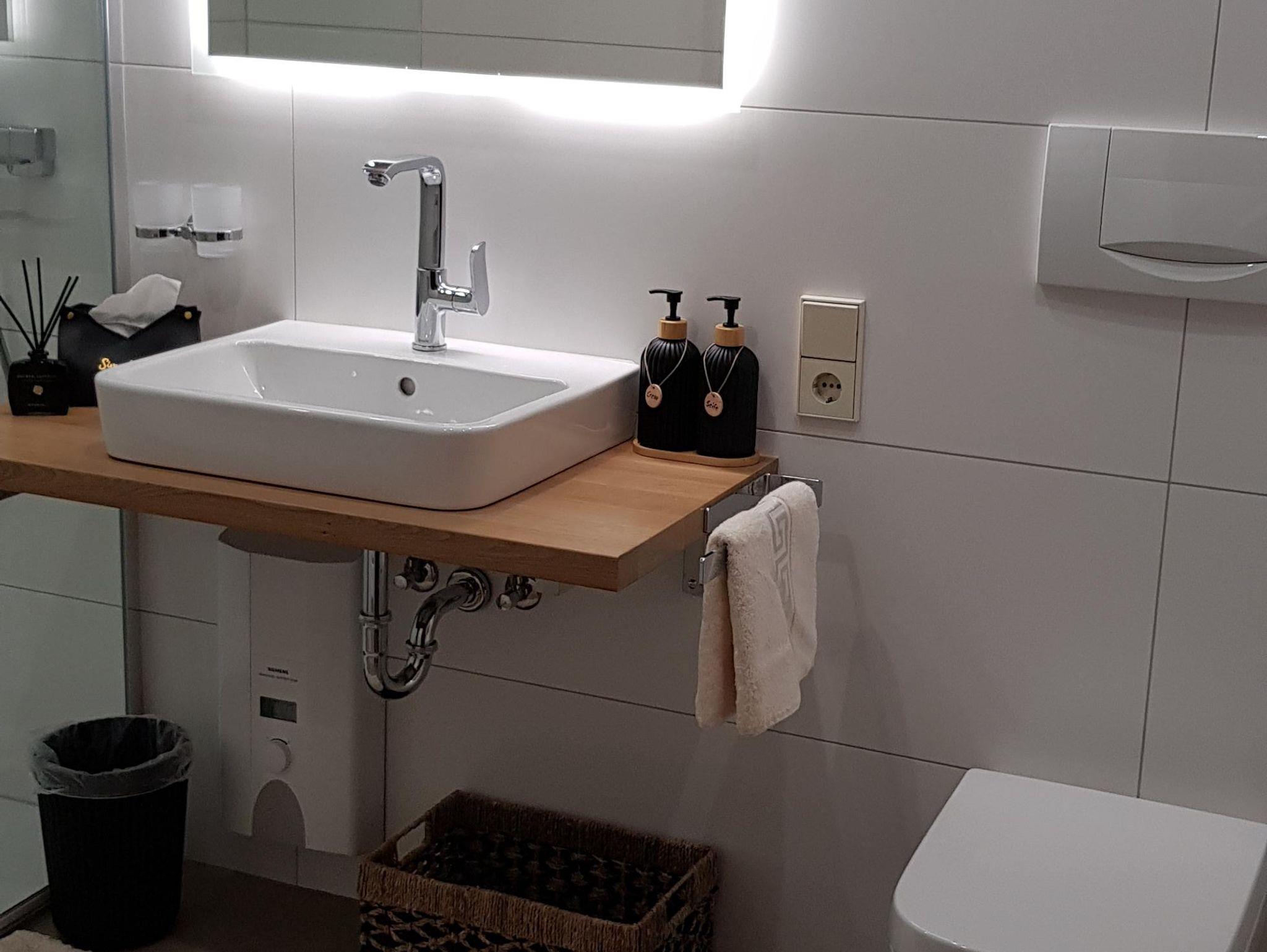 Kabel -TV, Küche mit Esstheke, Bad mit Dusche, Fön und WC.
