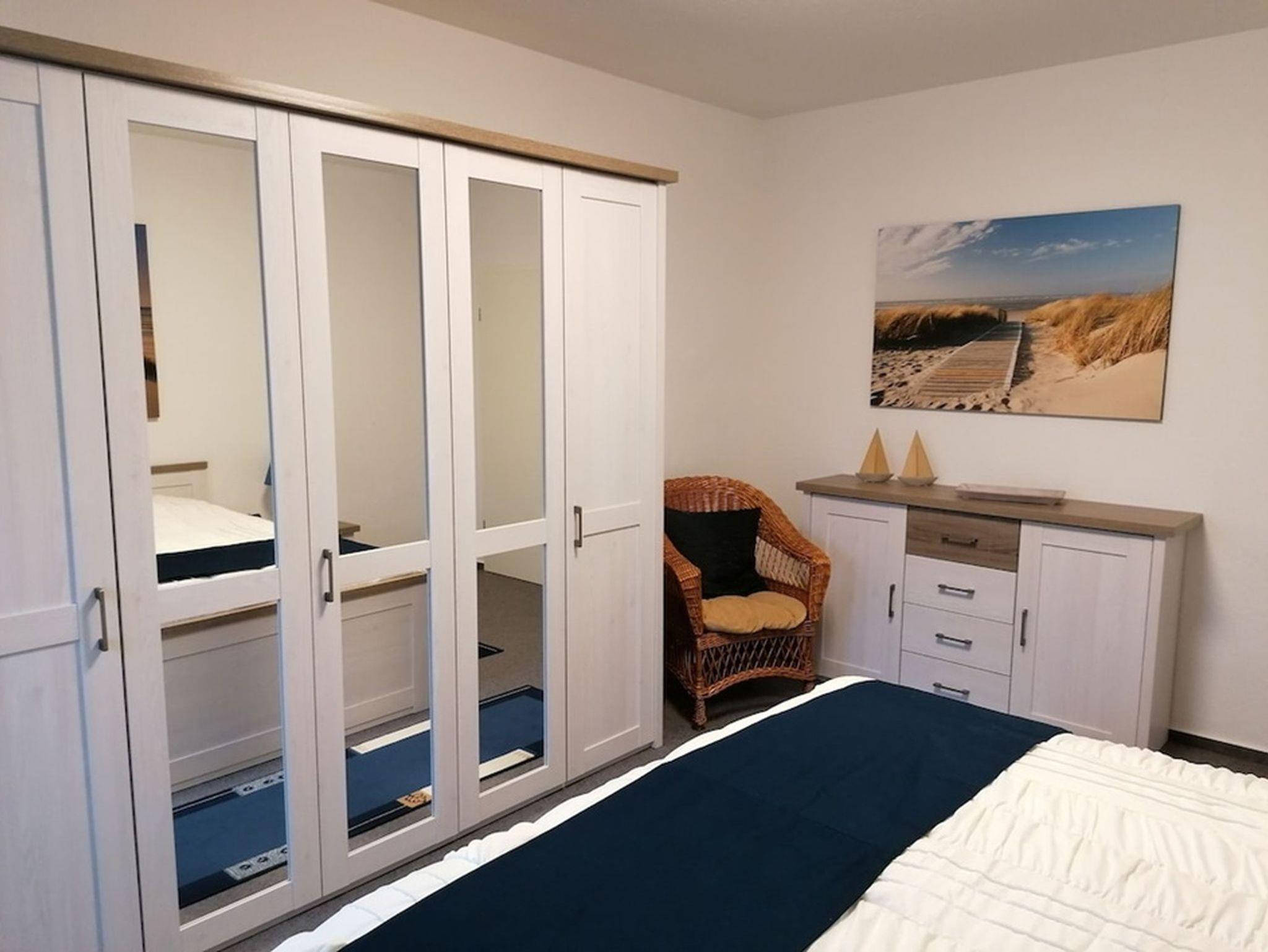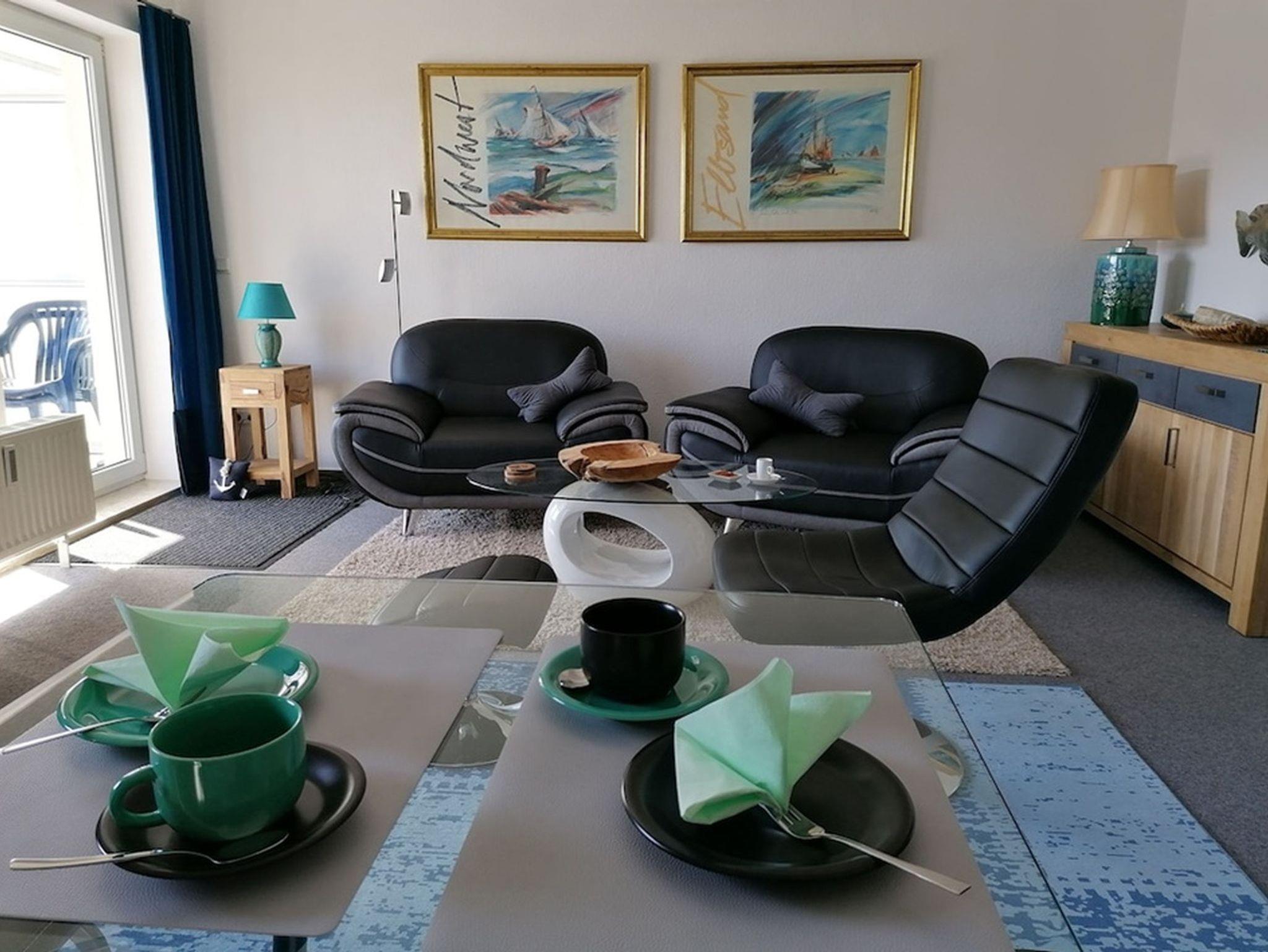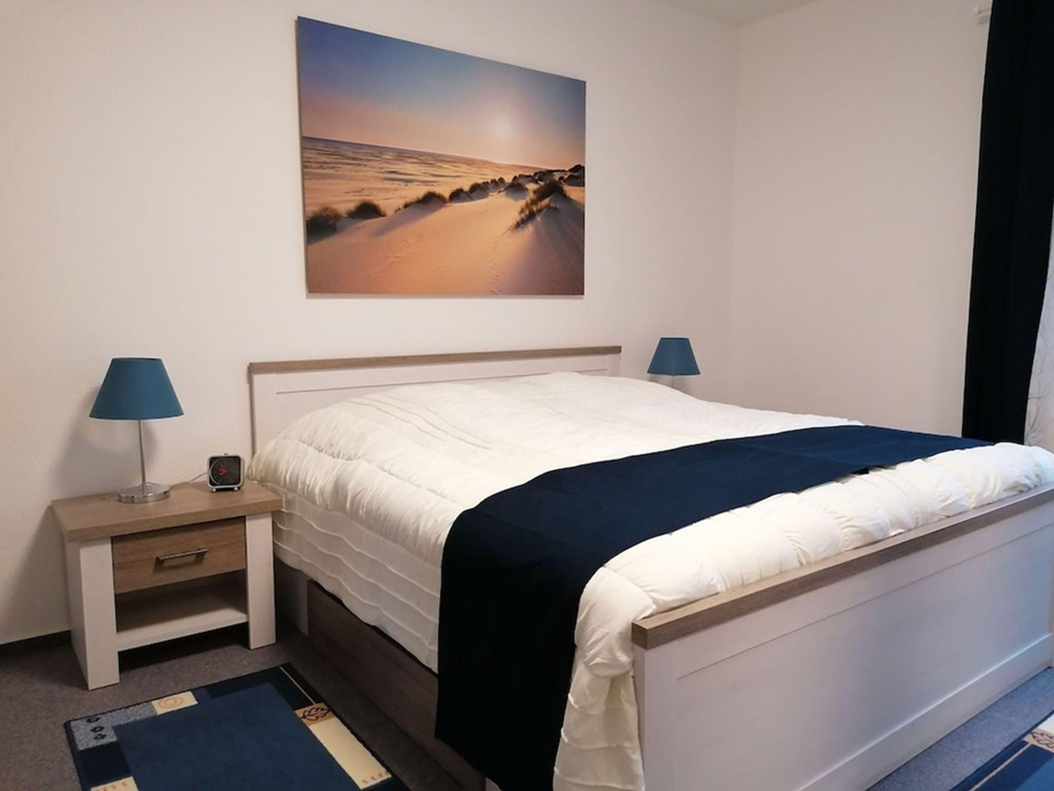 Über das Wohnzimmer gelangt man auf den überdachten, mit Gartenmöbel und Sonnenschirm ausgestatteten, Südbalkon. Das Schlafzimmer ist mit einem Doppelbett, großem Schrank, Sideboard und Sessel eingerichtet.