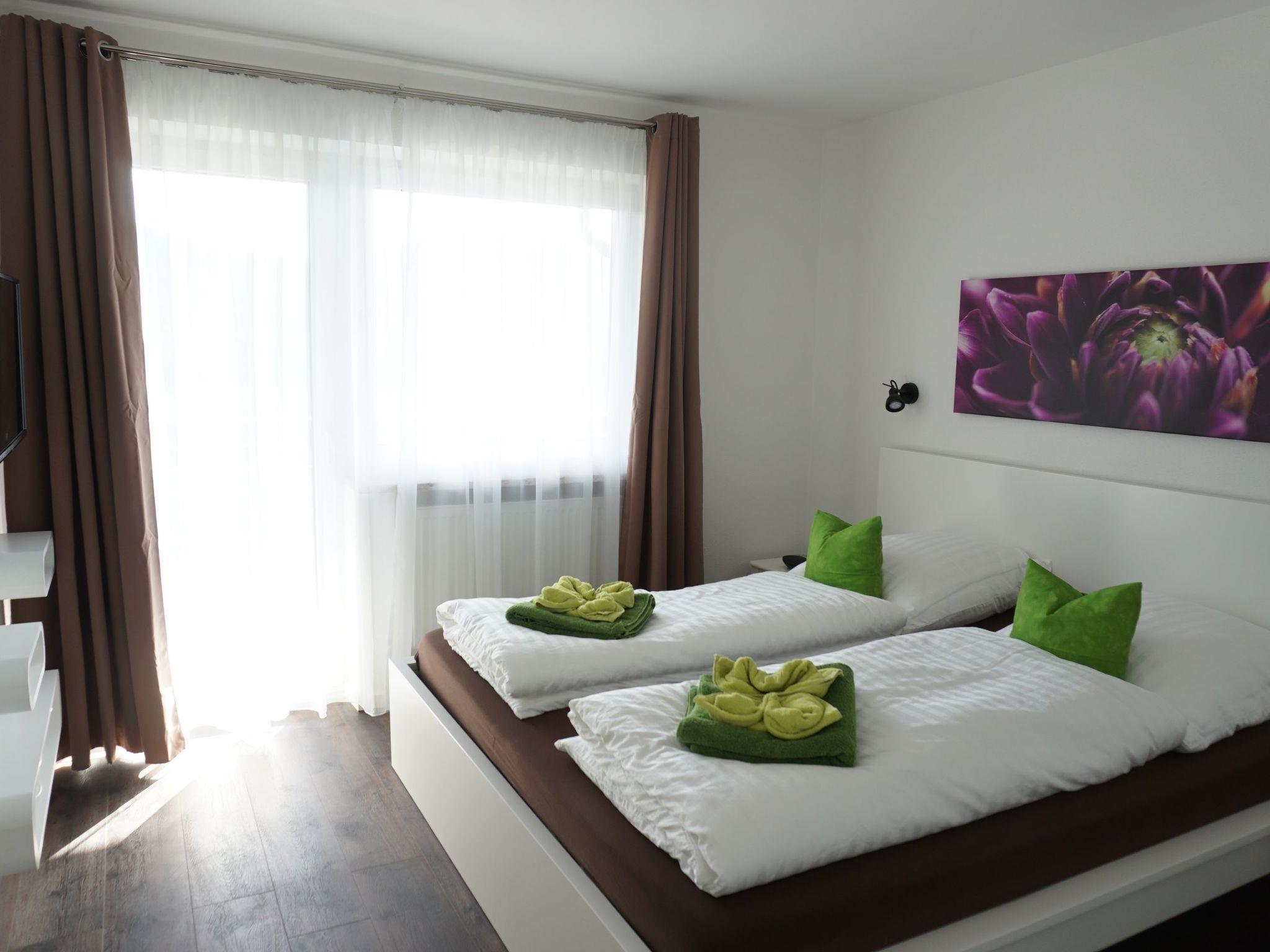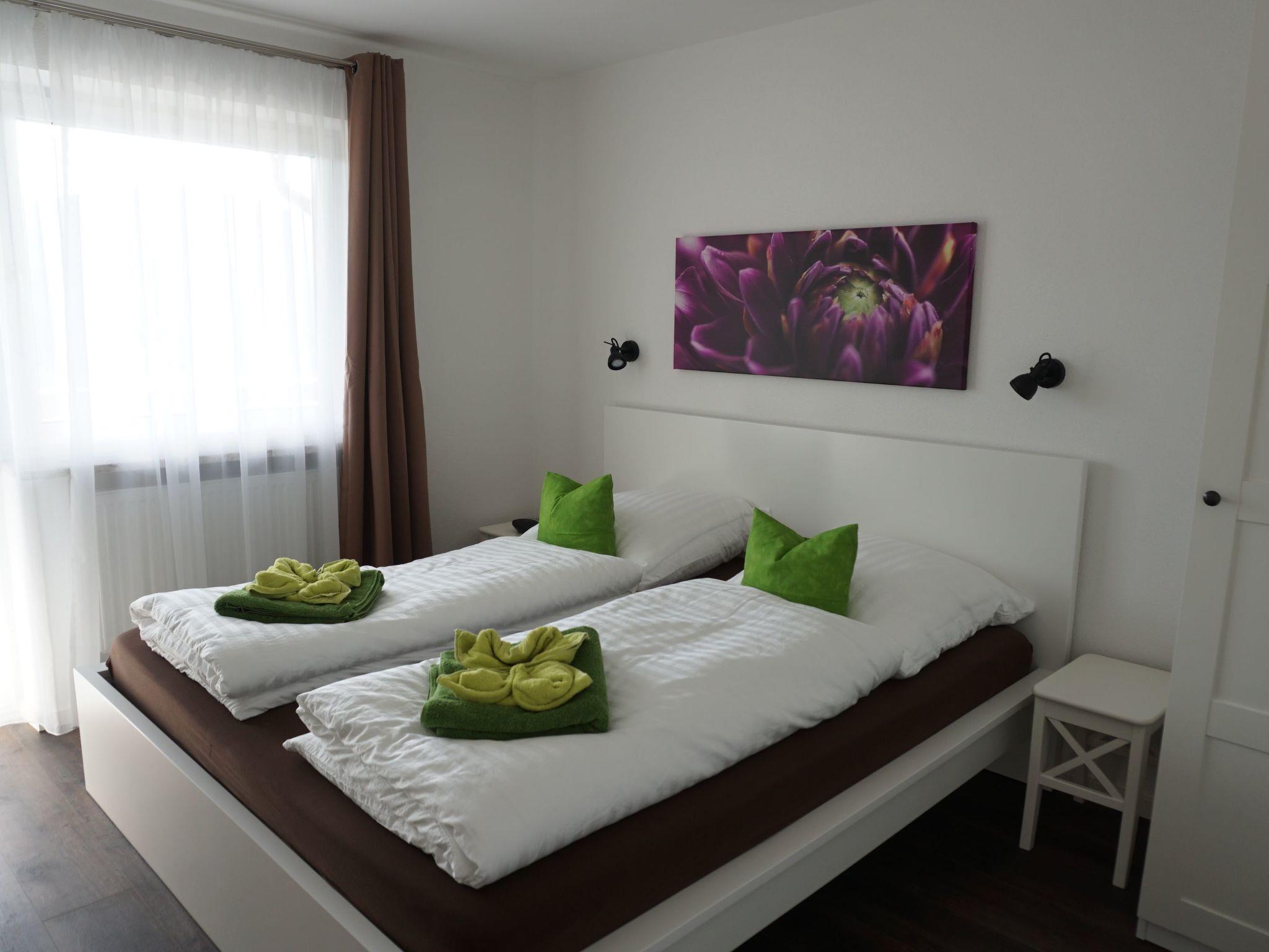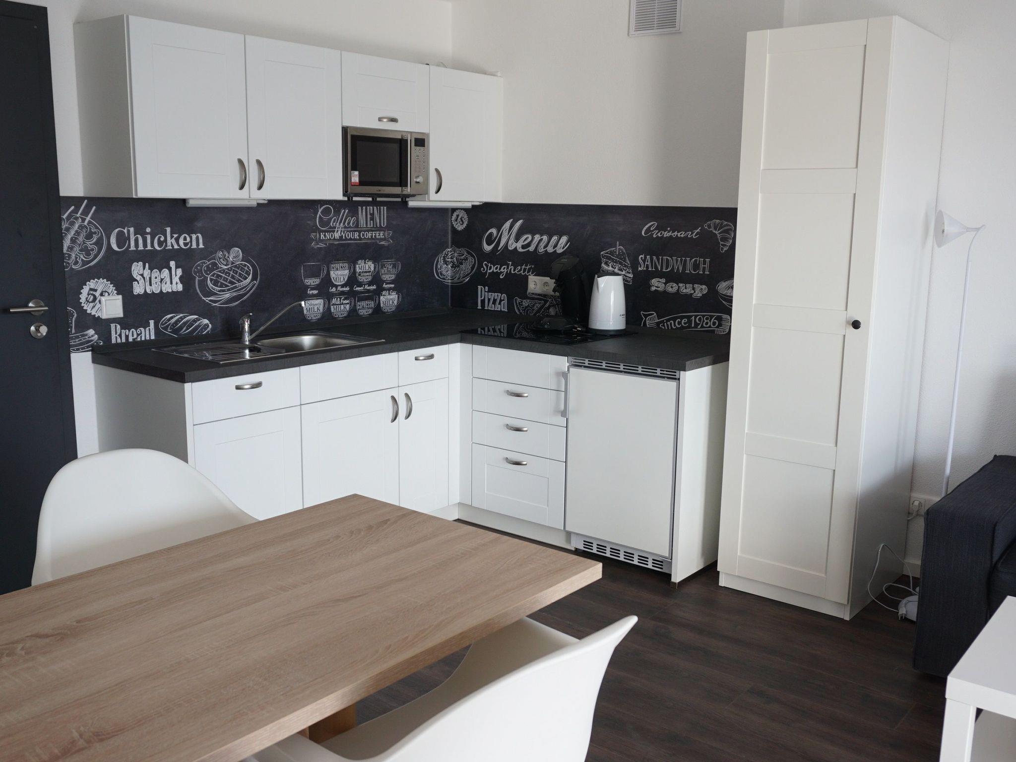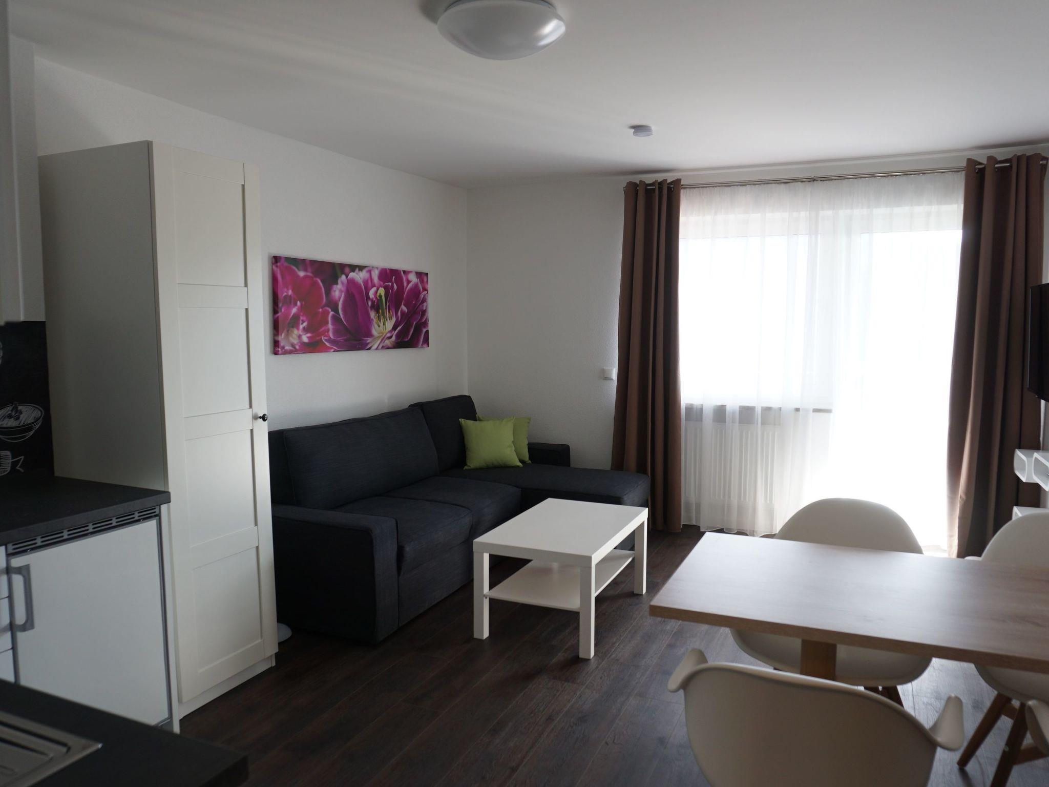 The 2-room flats are furnished with a cosy sofa with a sofa bed and a coffee table. The sofa is extendable and can be used as an additional sleeping area with a sleeping area of 140x200. The large dining table for 4 people is located opposite the corner kitchen and invites you to feast together. The bedroom has a large double bed (180x200) without a "visitor's crack". The shower room is directly accessible from the bedroom.