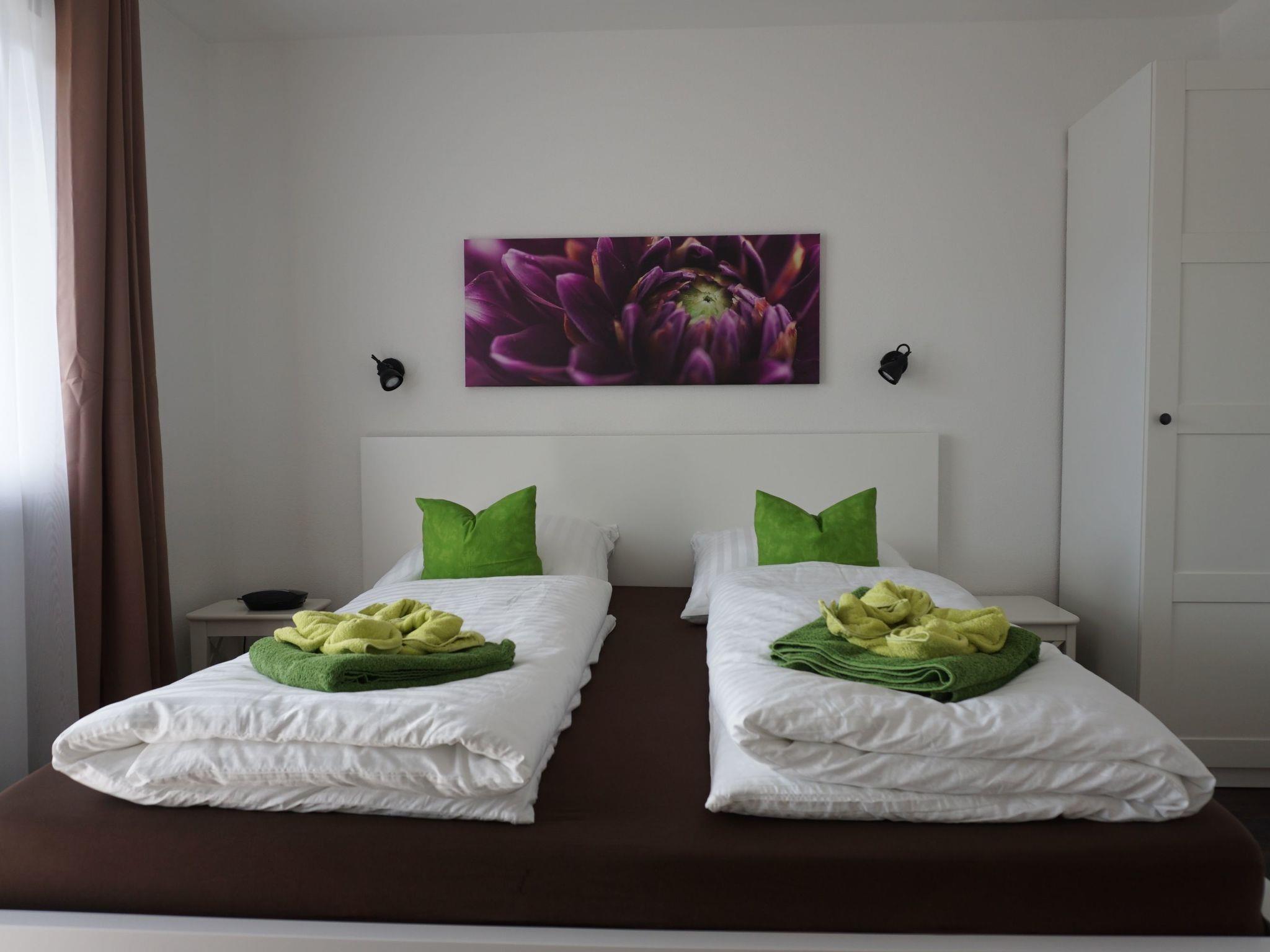 The 2-room family flat is furnished with a cosy sofa with récamiere and a coffee table. The sofa is extendable and can be used as an additional sleeping area with a sleeping area of 140x200. The large dining table for 4-5 people is located opposite the corner kitchen and invites you to feast together. In the bedroom there is a large double bed (180x200) without a "visitor's crack" and a queen-size bed (140x200), so that 4 people can sleep comfortably in the bedroom. The spacious shower room is directly accessible from both the bedroom and the living room.