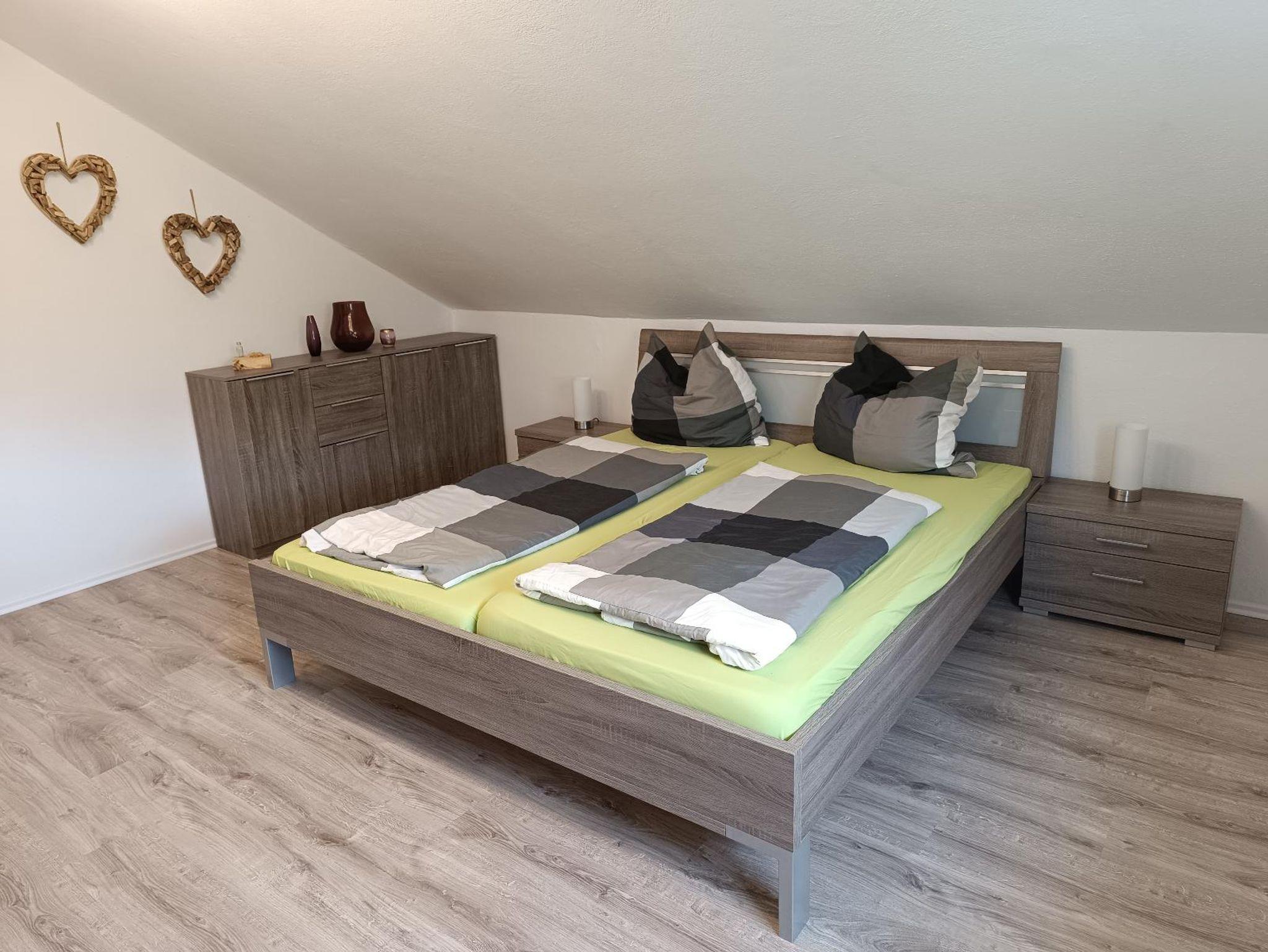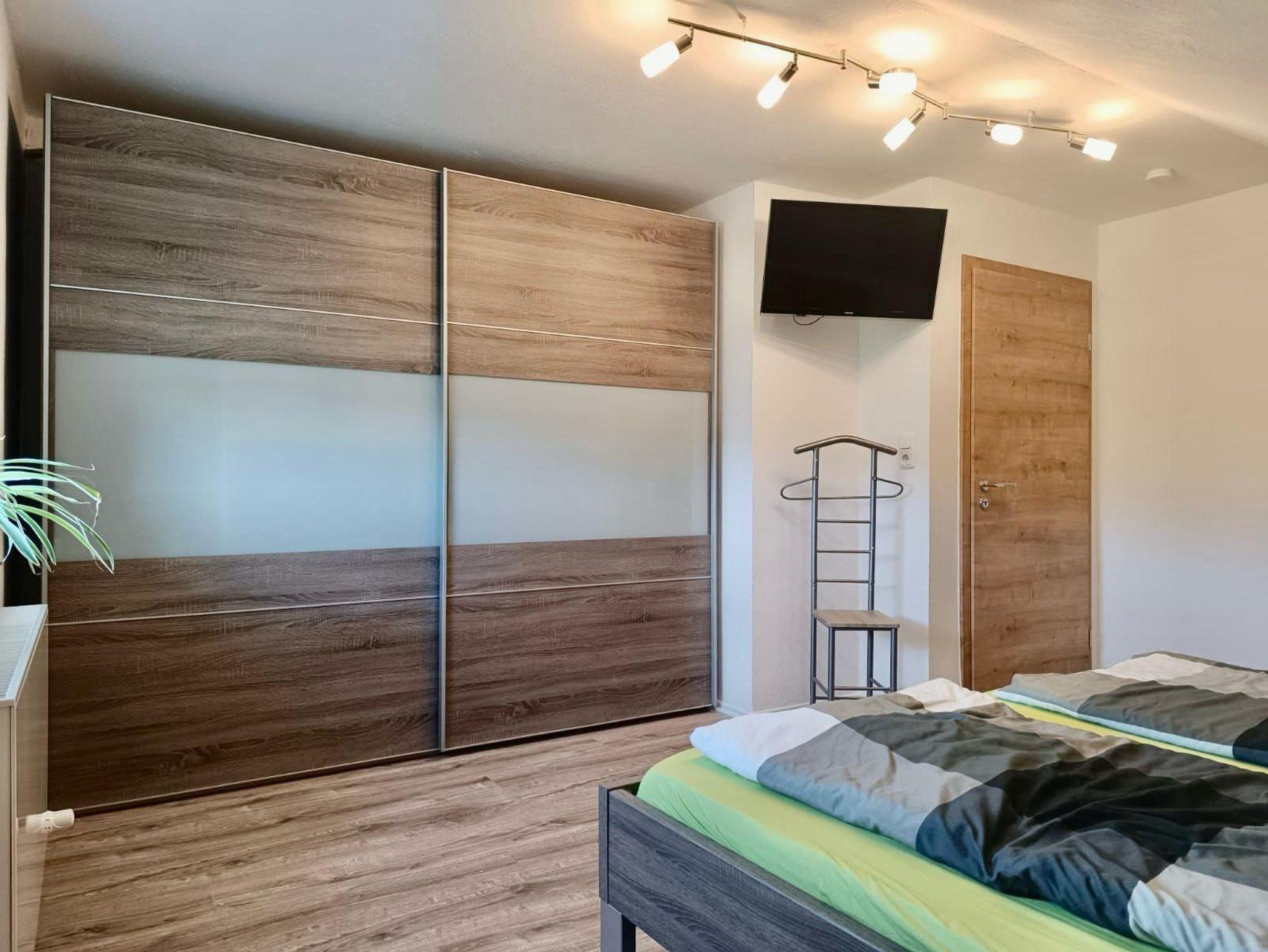 Die Wohnung verfügt über 2 getrennte Schlafzimmer, eins davon mit großem Doppelbett (180x200 cm) und Flachbild-TV, das andere mit französischen Bett (140x200 cm) sowie jeweils einem großen Kleiderschrank.