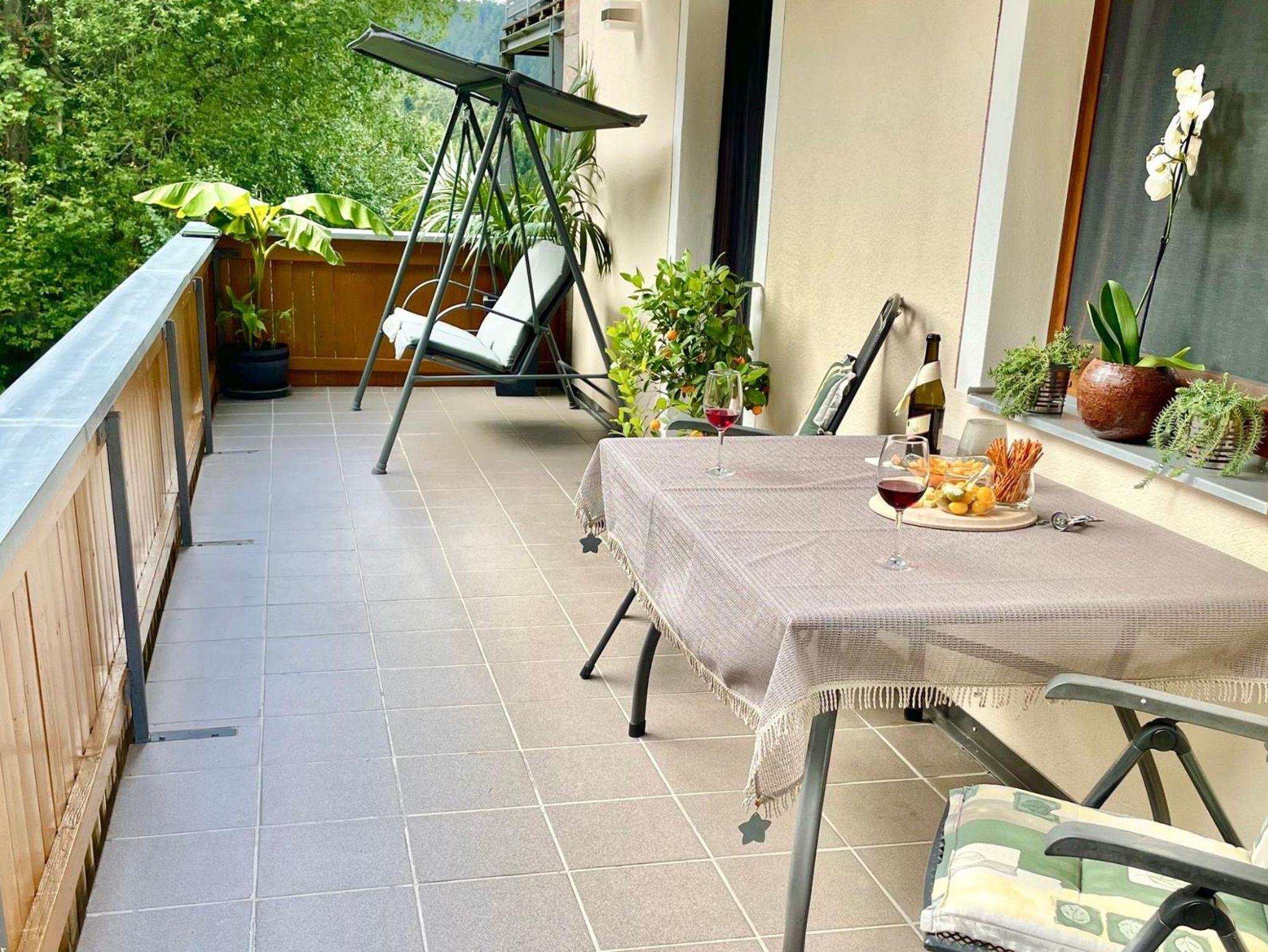 Das helle Wohnzimmer mit großem gemütlichen Sofa, Flachbild-TV und Zugang zum großen Balkon lädt zum Verweilen ein. Im Winter bietet der Kachelofen eine wohlige Wärme.