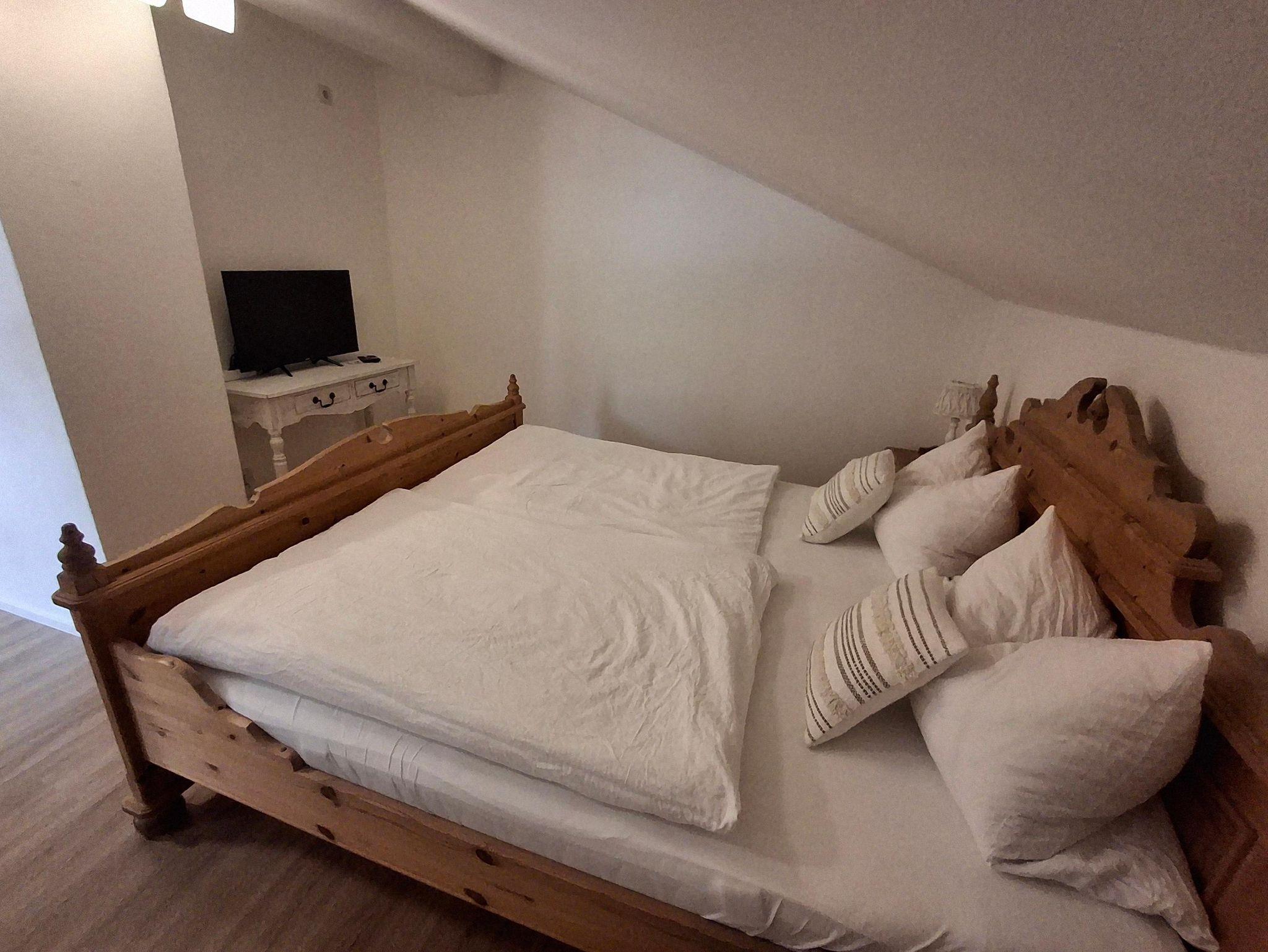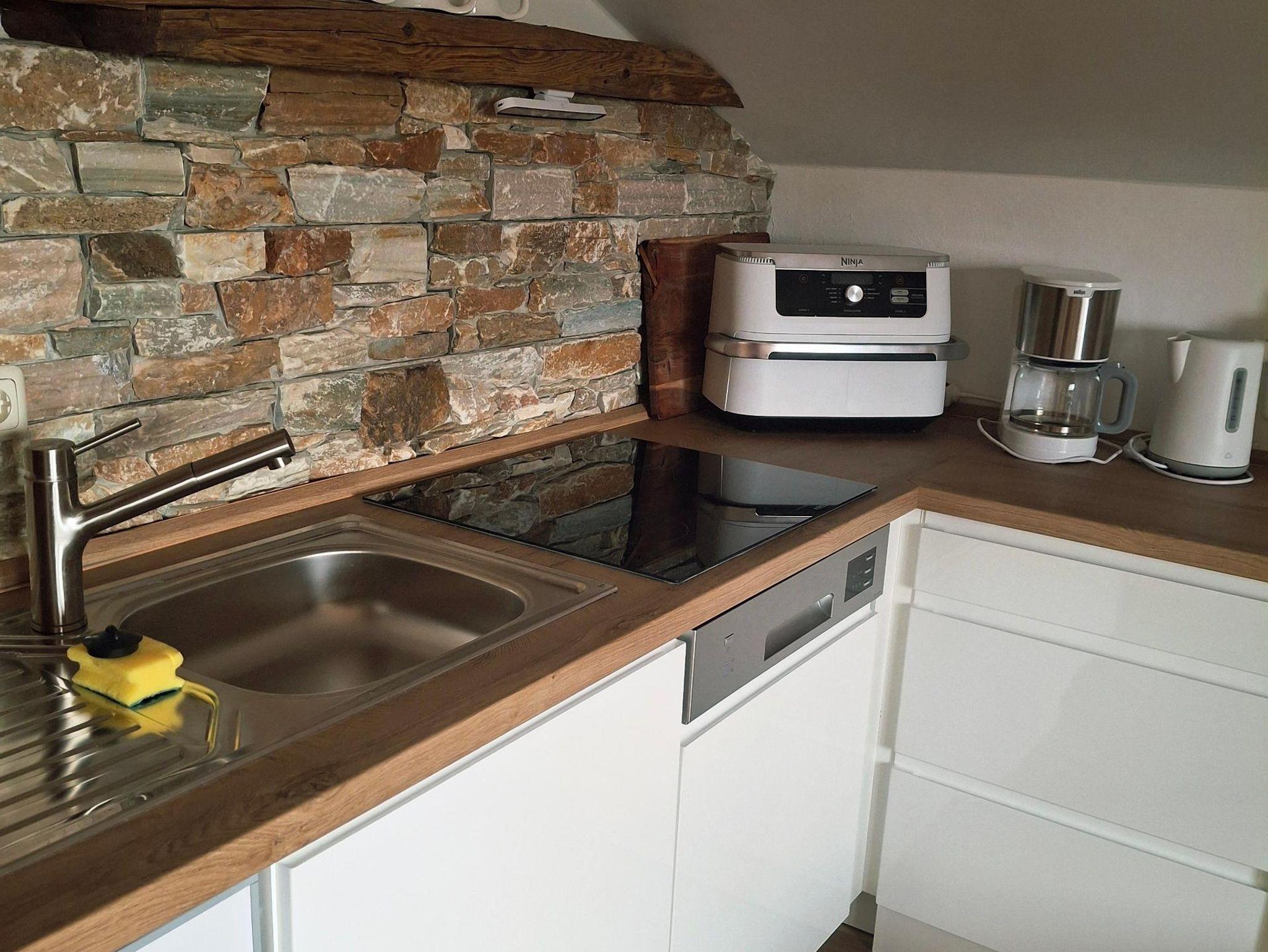 Die ländlich eingerichtete Wohnung hat einen TV im Schlafzimmer und einen TV im Wohnzimmer und eine voll ausgestattete Küche mit Kühlschrank und Kaffeemaschine uns Spülmaschine, sowie ein eigenes Badezimmer mit Dusche und Haartrockner.
