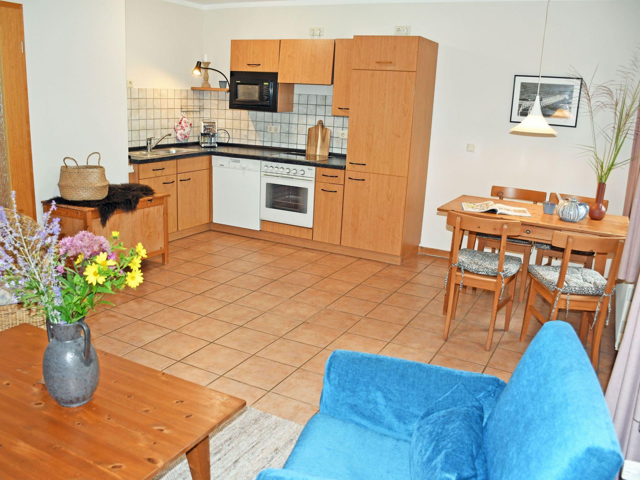Die offene Küche ist komplett eingerichtet mit Mikrowelle, Geschirrspüler, Toaster, Wasserkocher, Kaffeemaschine sowie einem Herd. Ihre Terrasse zum Garten können Sie vom Zugang / Wohnzimmer betreten. Grillen ist auf dem Grundstück nicht gestattet.