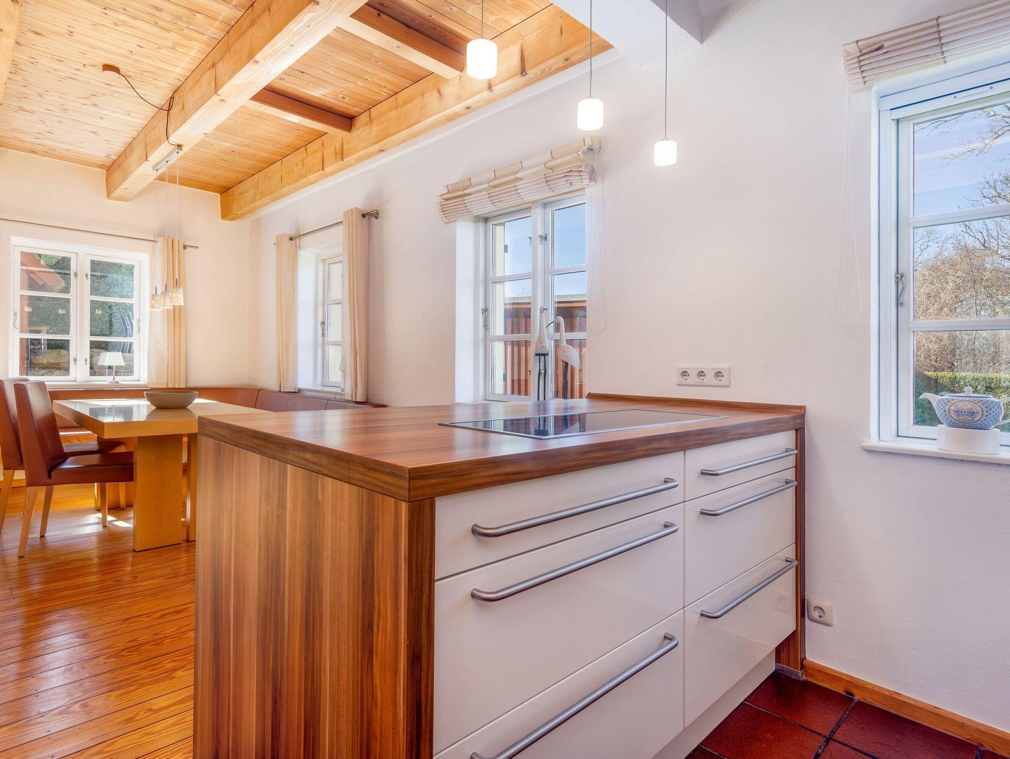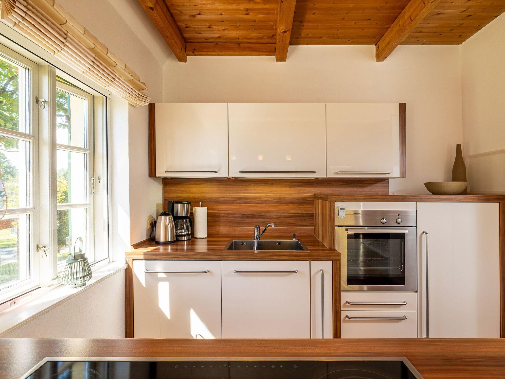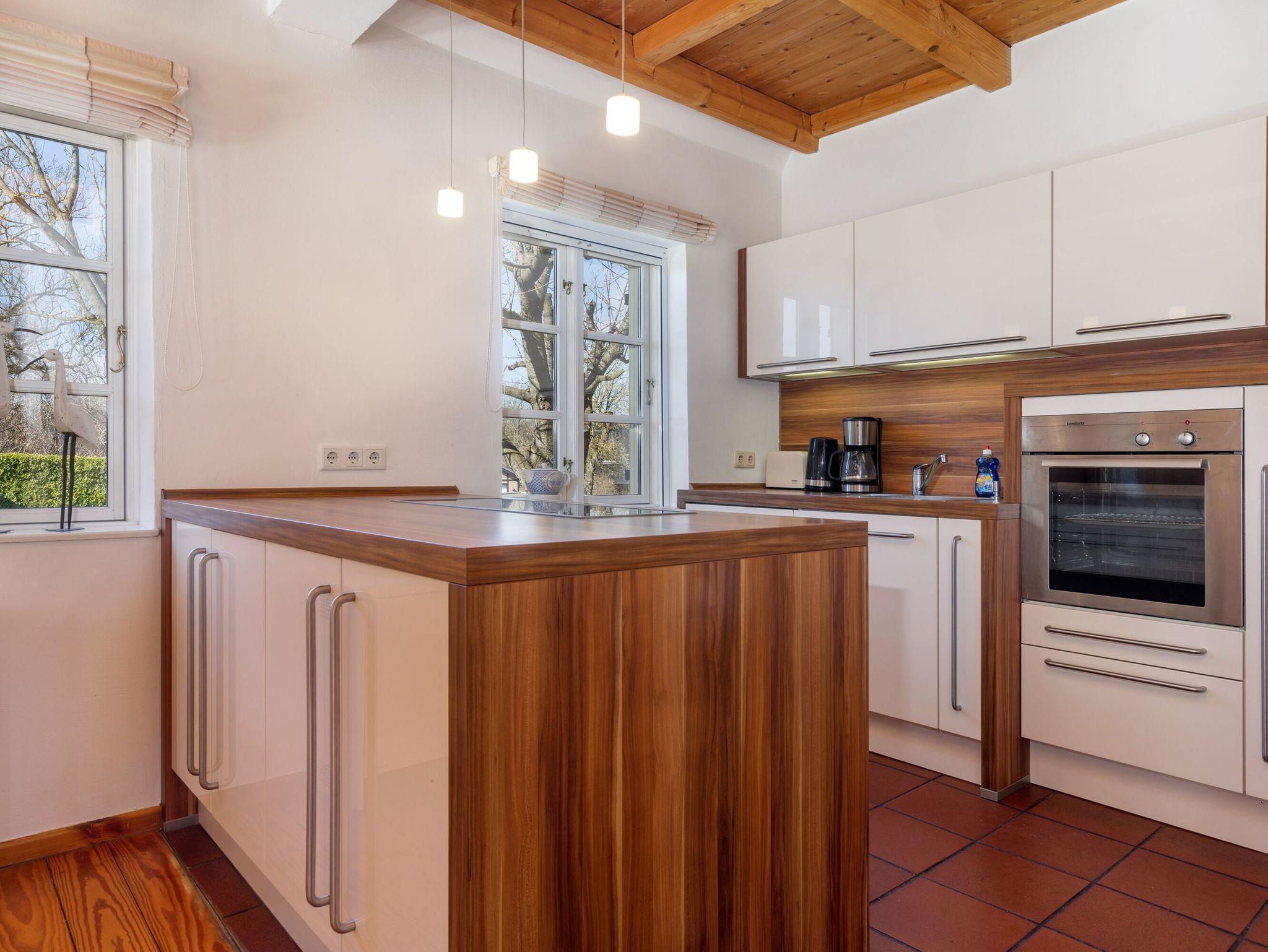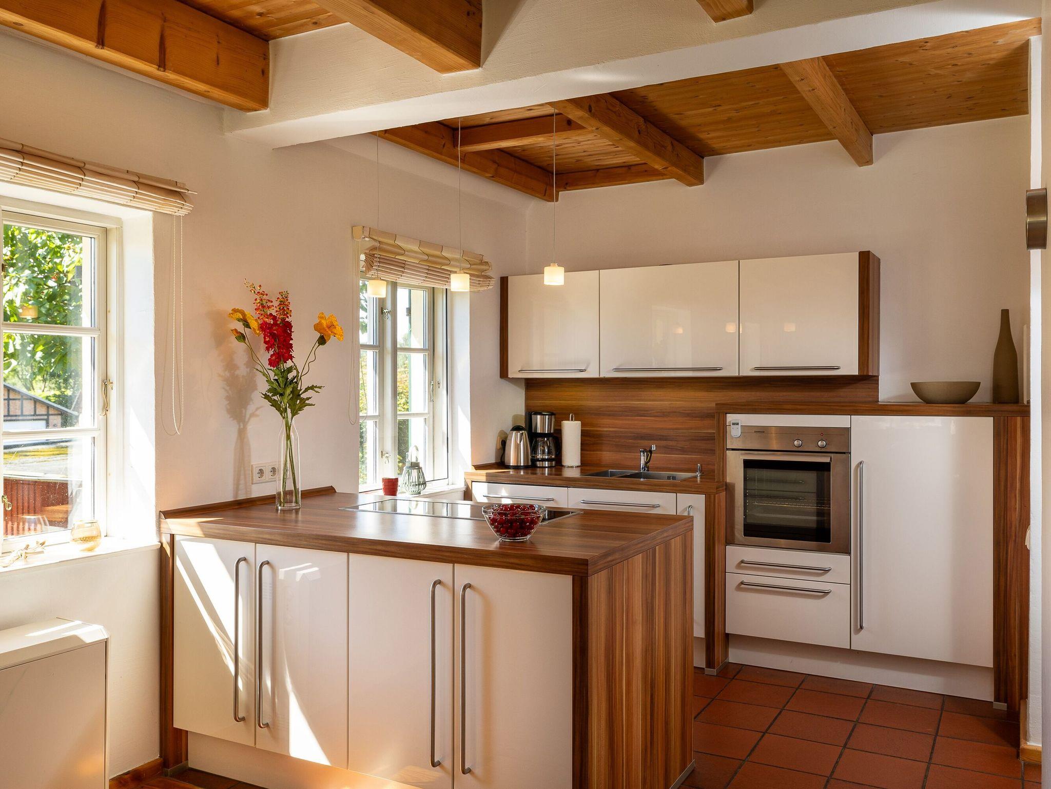 Die offene Küche lässt das Herz aller Hobbyköche höher schlagen. Sie sieht nicht nur chic aus, sondern ist mit Ceranherd, Mikrowelle, Backofen, Kühlschrank mit Gefrierfach, Geschirrspüler, Kaffeemaschine, Wasserkocher und Toaster sowie allem nötigen Besteck und Geschirr allerbestens ausgestattet. Speisen können Sie wahlweise am großen Esstisch im Wohnzimmer oder bei passendem Wetter auch auf der überdachten Frühstücksterrasse, wo Sie die Morgensonne zu Gast haben.