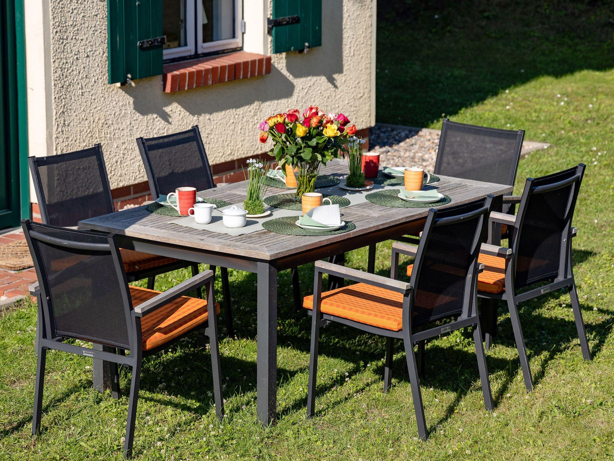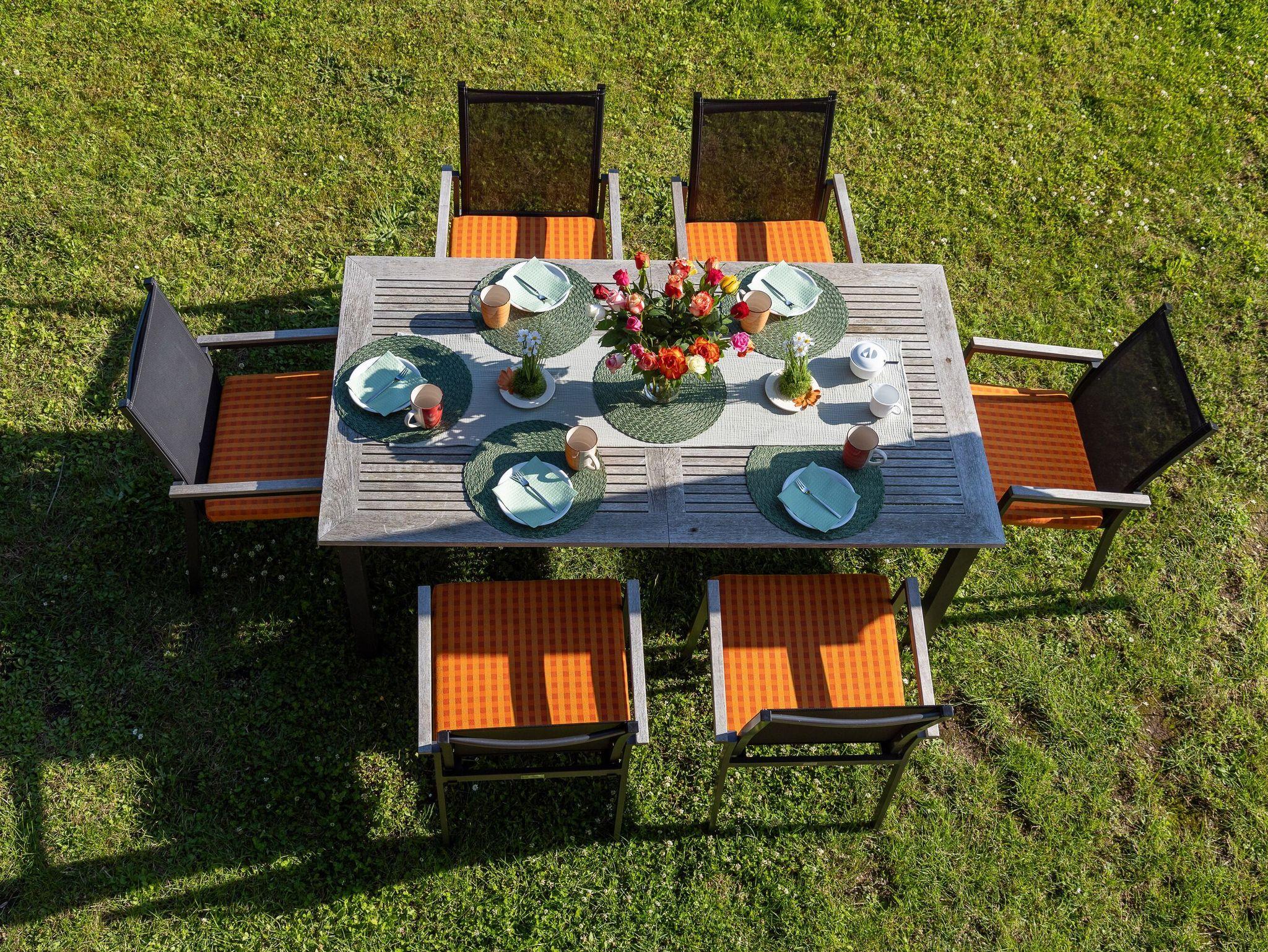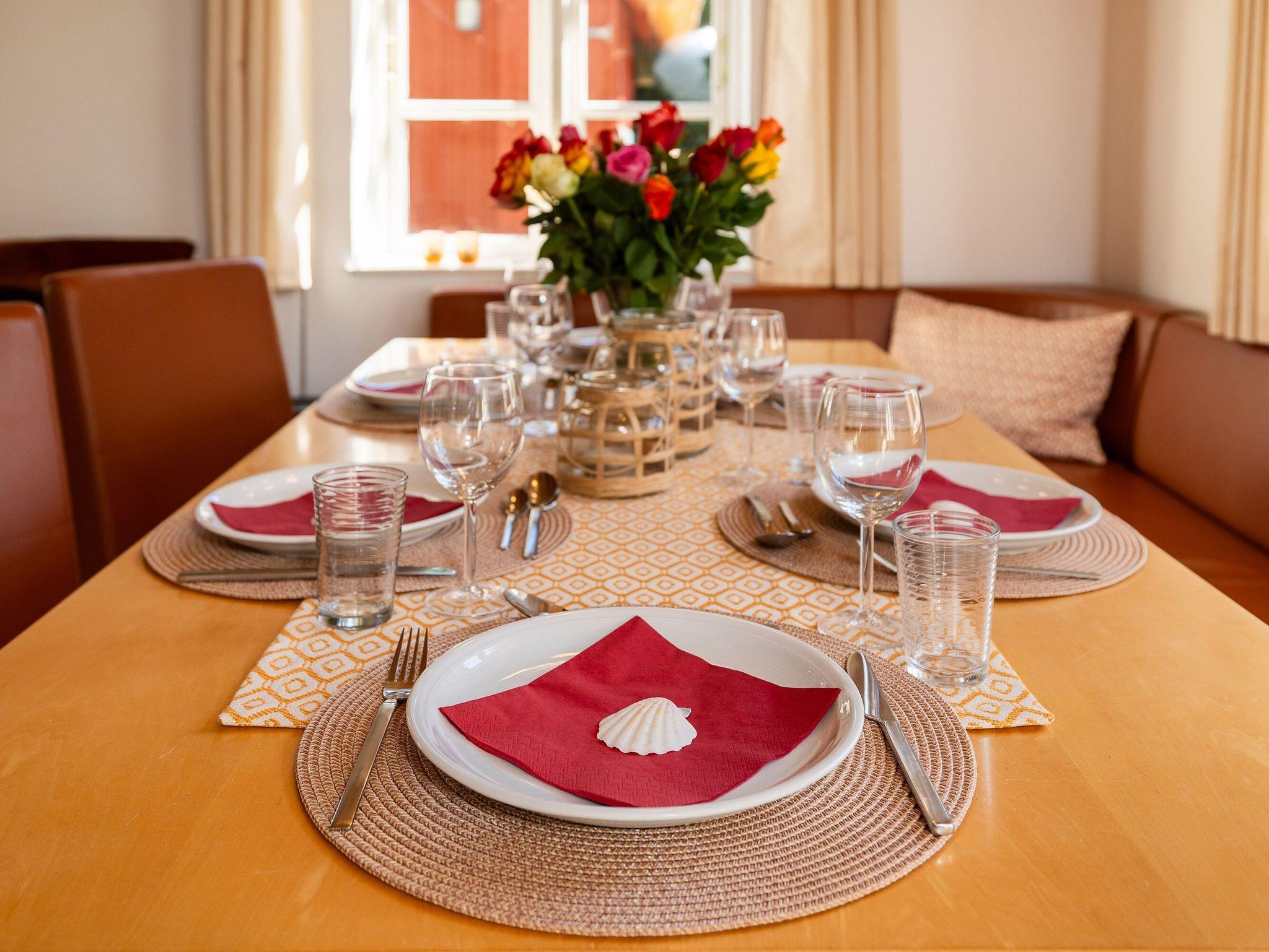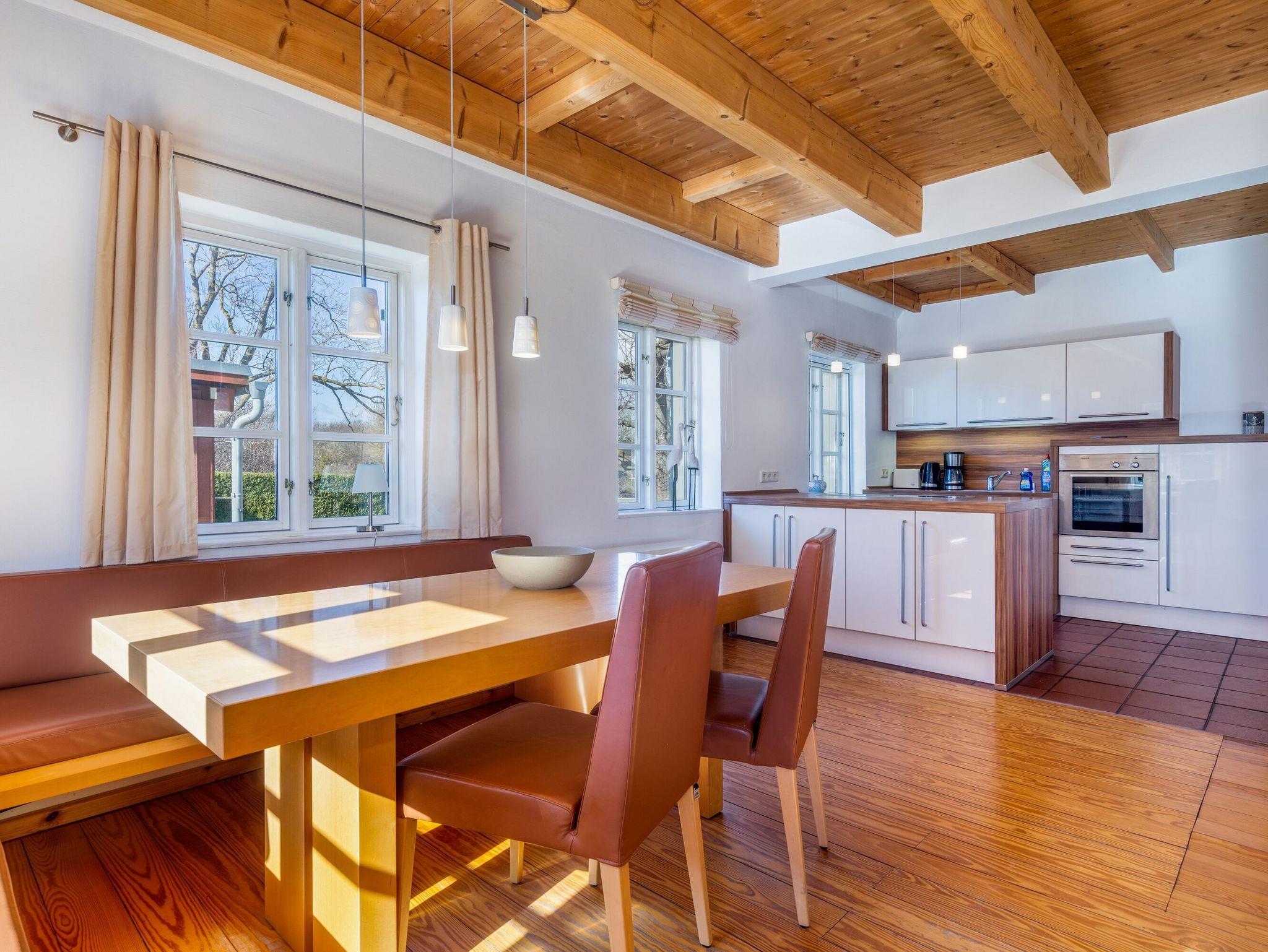 Die offene Küche lässt das Herz aller Hobbyköche höher schlagen. Sie sieht nicht nur chic aus, sondern ist mit Ceranherd, Mikrowelle, Backofen, Kühlschrank mit Gefrierfach, Geschirrspüler, Kaffeemaschine, Wasserkocher und Toaster sowie allem nötigen Besteck und Geschirr allerbestens ausgestattet. Speisen können Sie wahlweise am großen Esstisch im Wohnzimmer oder bei passendem Wetter auch auf der überdachten Frühstücksterrasse, wo Sie die Morgensonne zu Gast haben.