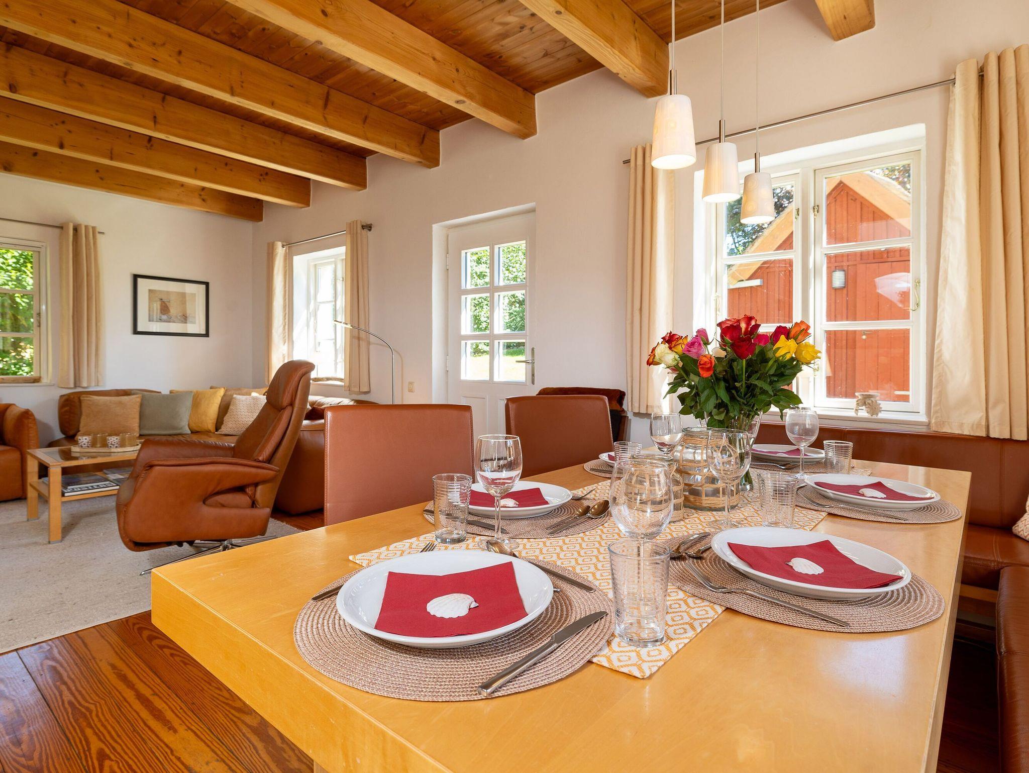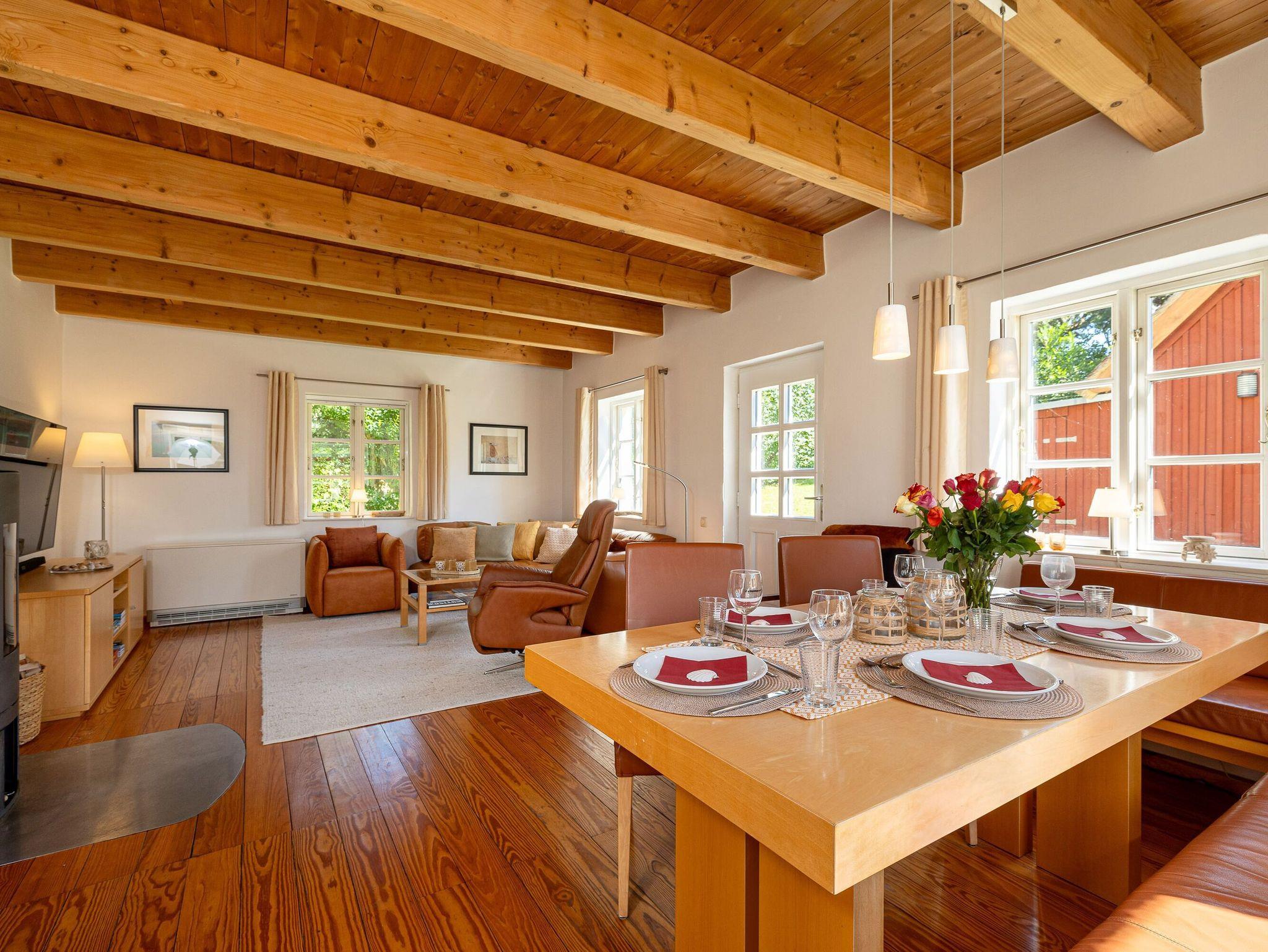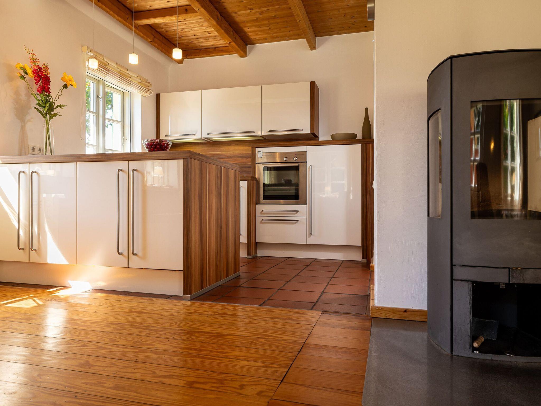 Im Erdgeschoss mit seiner urgemütlichen offenen Holzbalkendecke dominiert das großzügige Wohn- und Esszimmer. Es ist ausgestattet mit bequemen Sitzmöbeln inklusive einem Relaxsessel, einem großformatigen Smart-TV, einem DAB-Radio mit Bluetooth und einer kleinen Auswahl von Urlaubslektüre und Spielen. Natürlich gibt es auch kostenfreies W-LAN. Der Kaminofen sorgt für Romantik und gemütliche Wärme. Feuerholz dafür ist ausreichend vorhanden und inklusive.