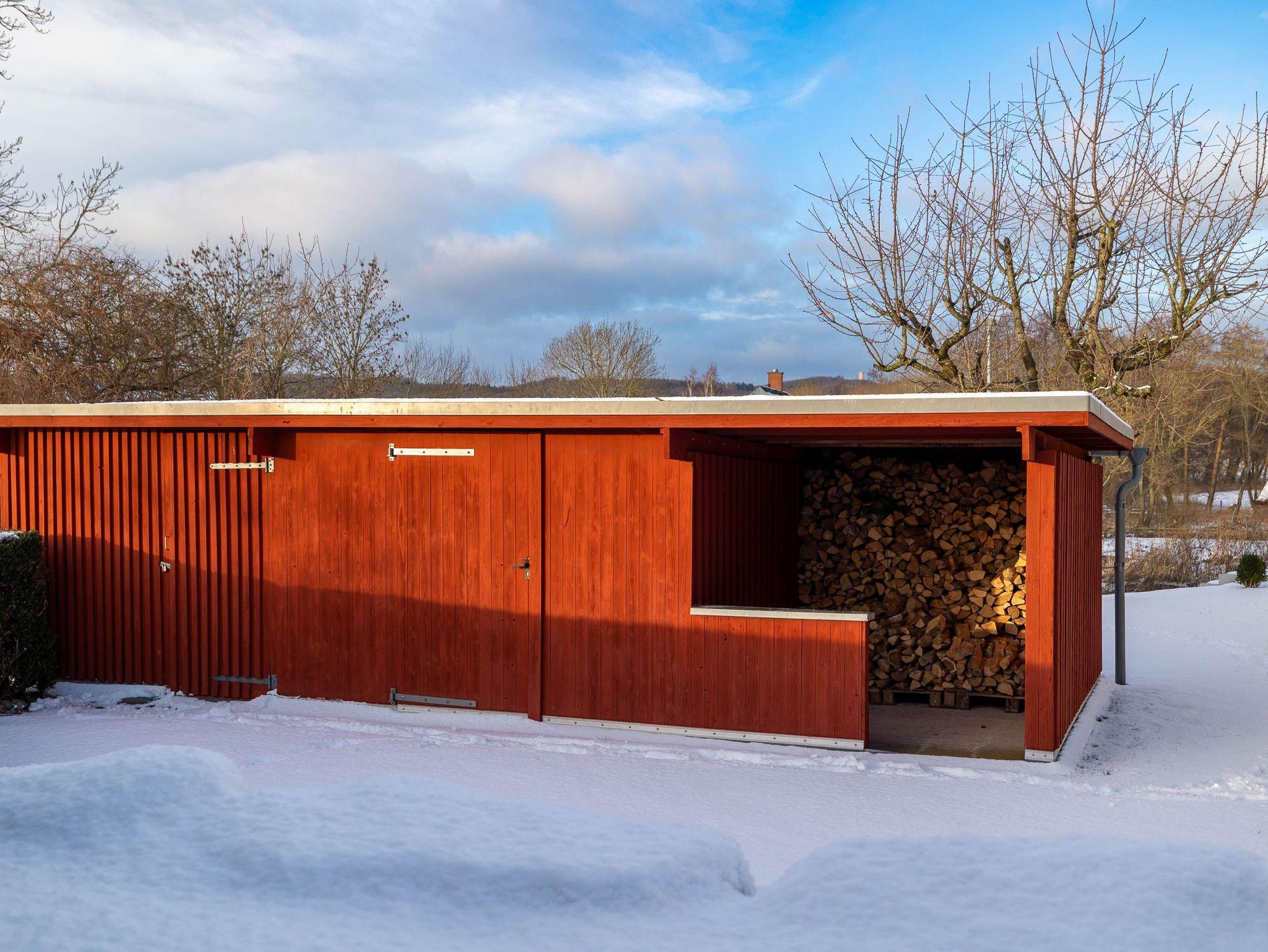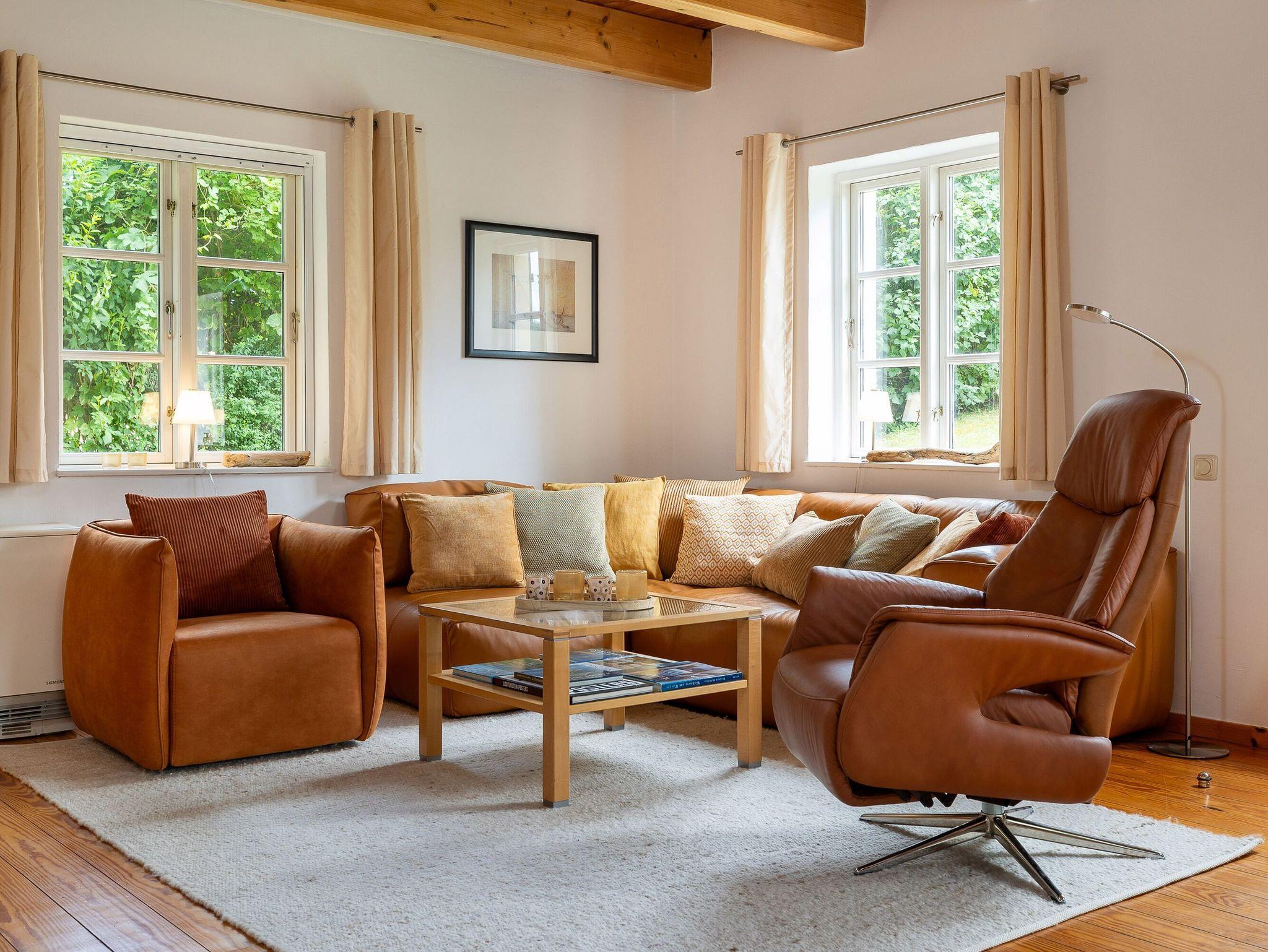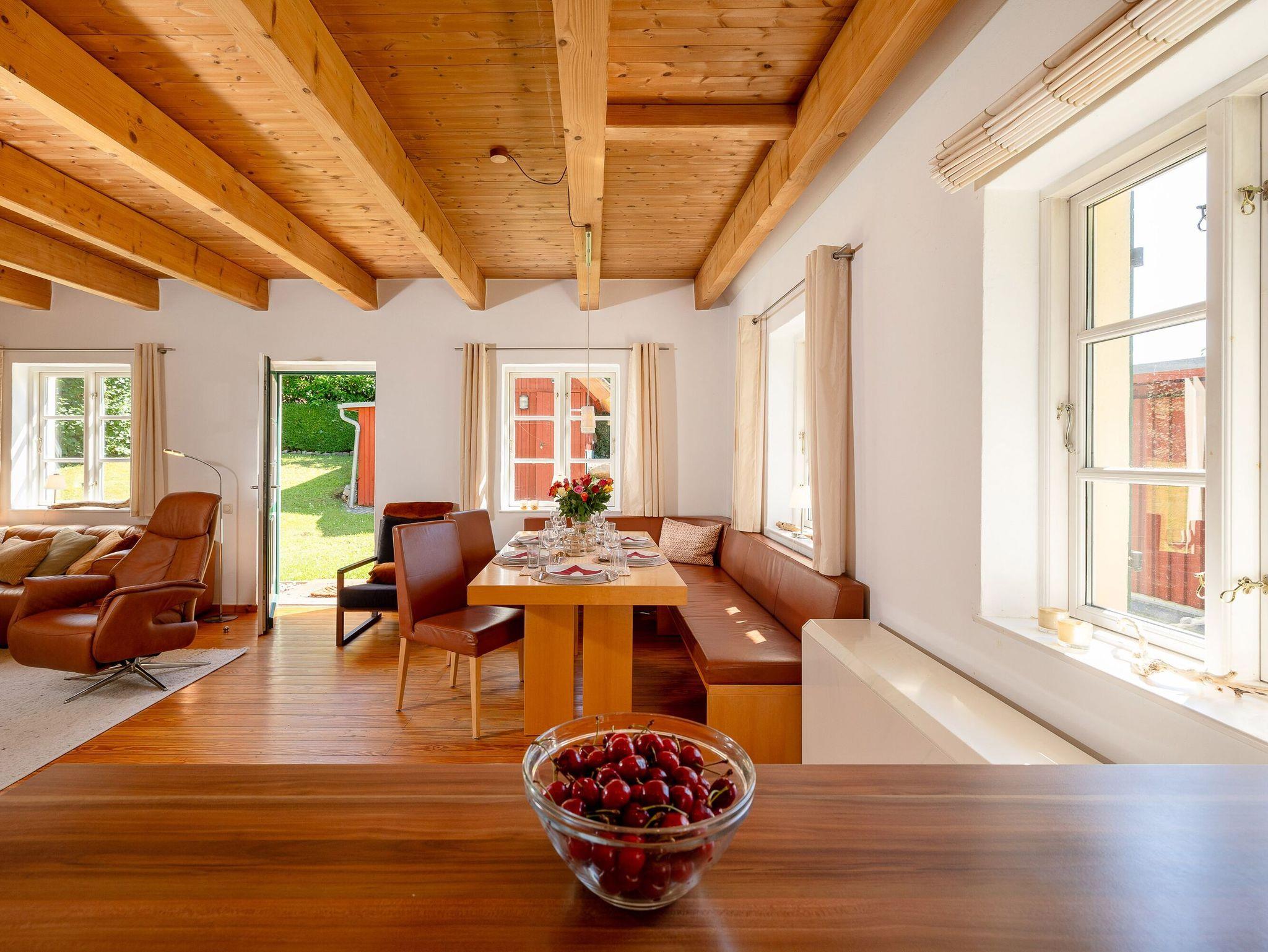Im Erdgeschoss mit seiner urgemütlichen offenen Holzbalkendecke dominiert das großzügige Wohn- und Esszimmer. Es ist ausgestattet mit bequemen Sitzmöbeln inklusive einem Relaxsessel, einem großformatigen Smart-TV, einem DAB-Radio mit Bluetooth und einer kleinen Auswahl von Urlaubslektüre und Spielen. Natürlich gibt es auch kostenfreies W-LAN. Der Kaminofen sorgt für Romantik und gemütliche Wärme. Feuerholz dafür ist ausreichend vorhanden und inklusive.
