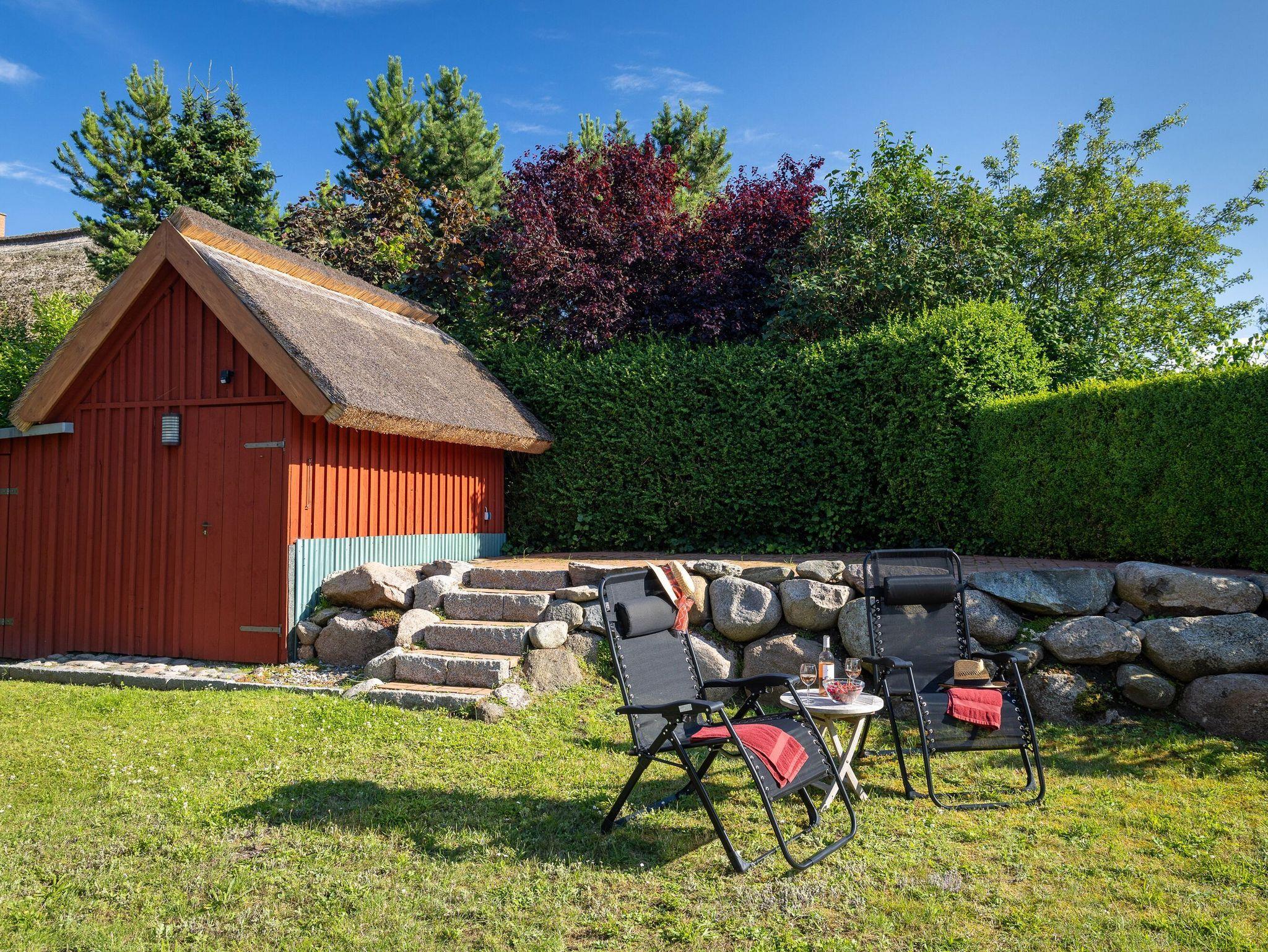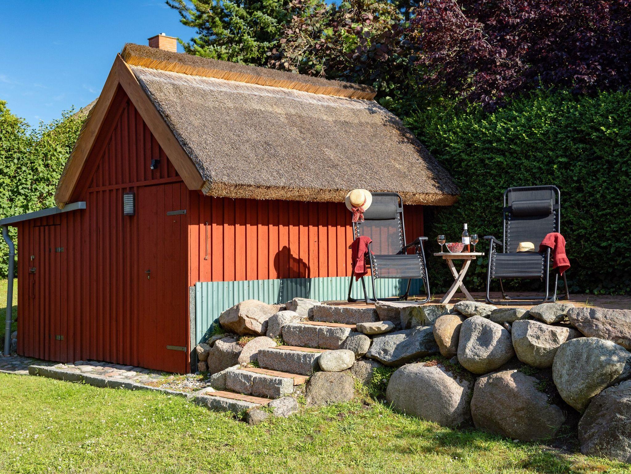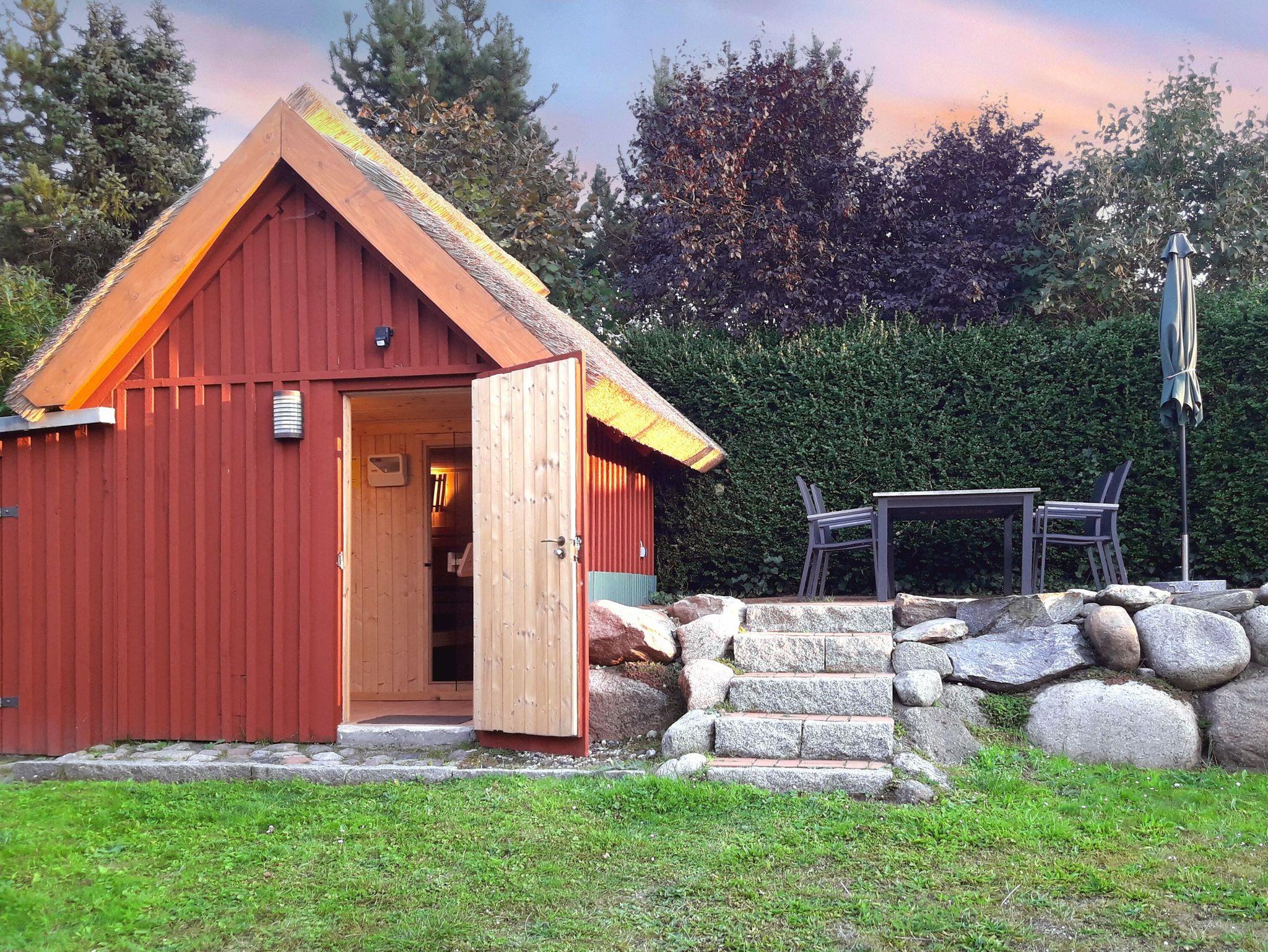 Auf dem gepflegten Gartengrundstück gibt es ein kostenfrei nutzbares Saunahäuschen und eine weitere, etwas erhöht liegende Terrasse. Von hier aus genießen Sie einen wunderbaren Blick in die umgebende Landschaft und bis hinüber zum Jagdschloss Granitz.