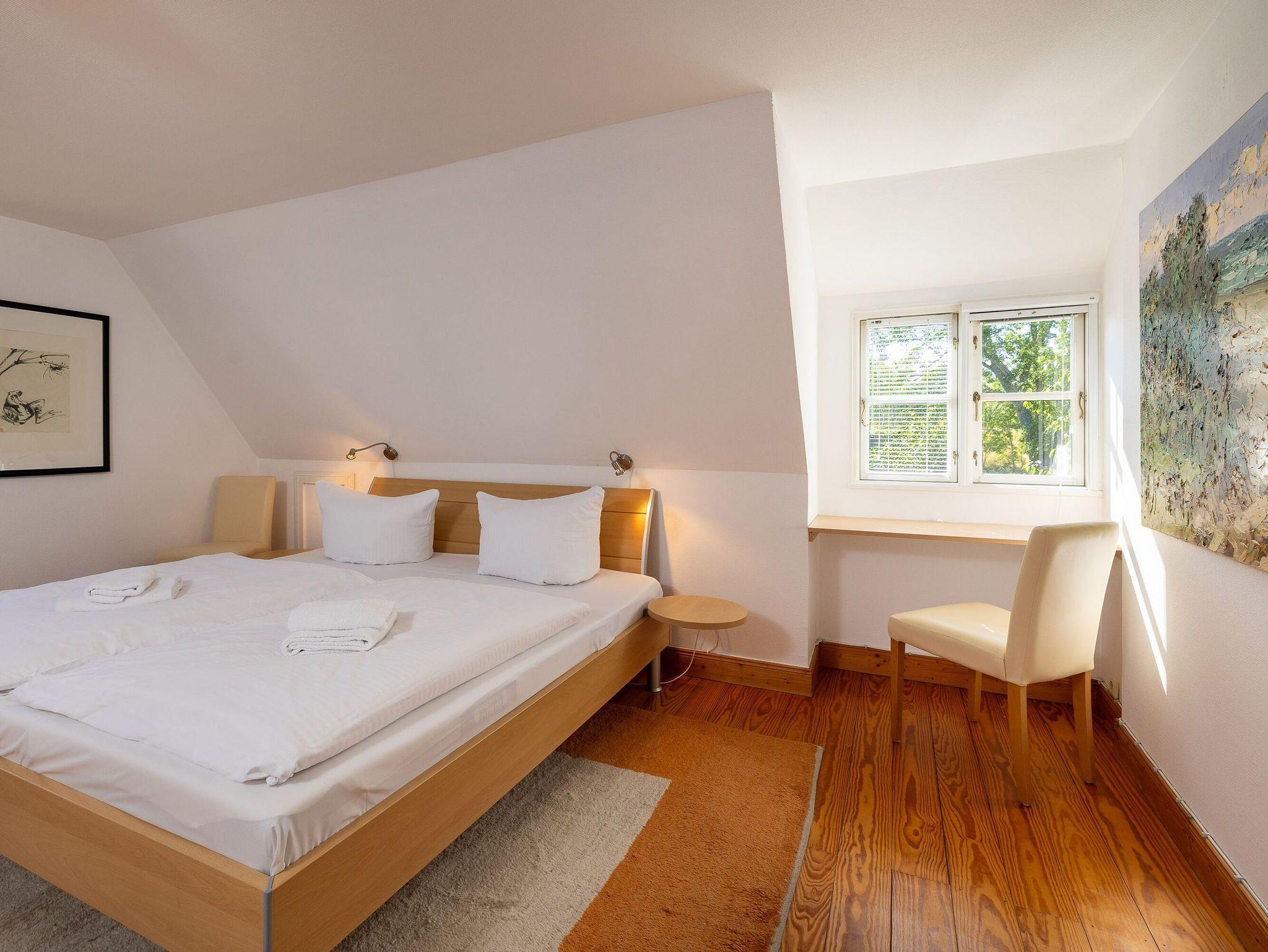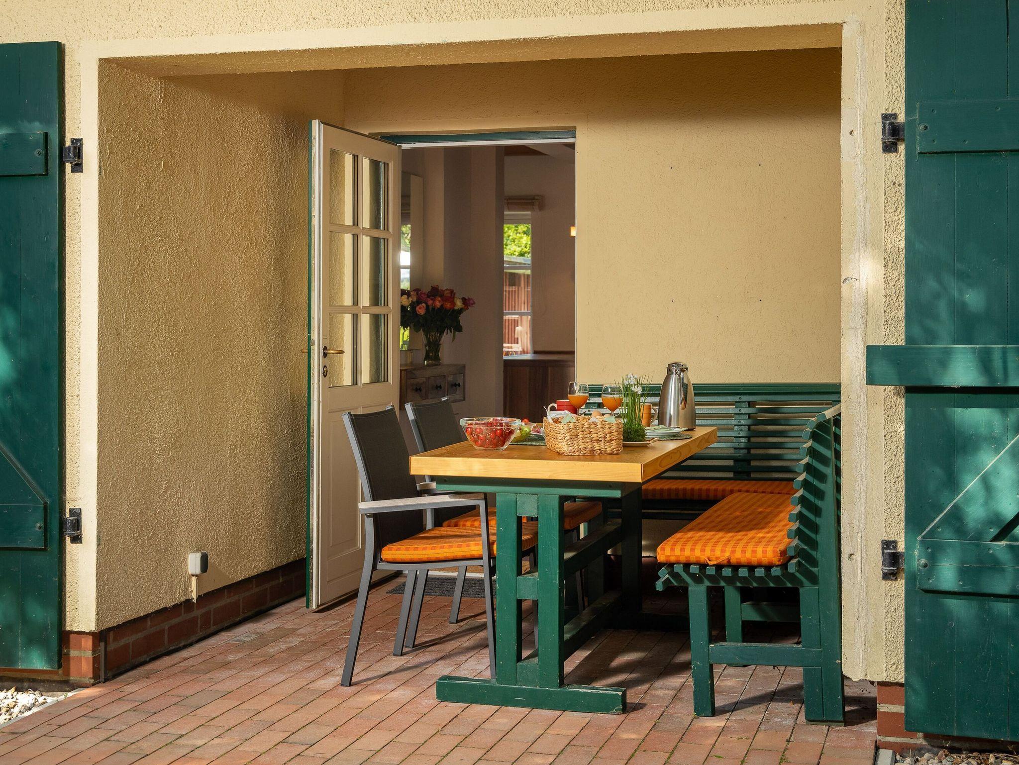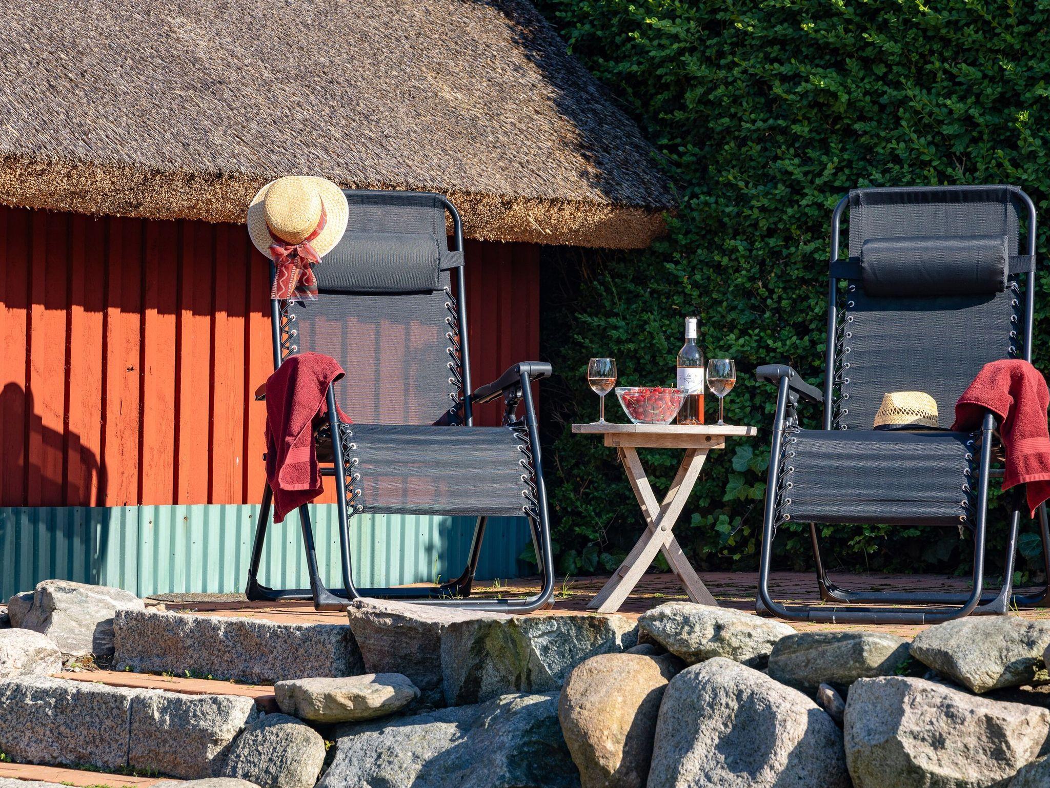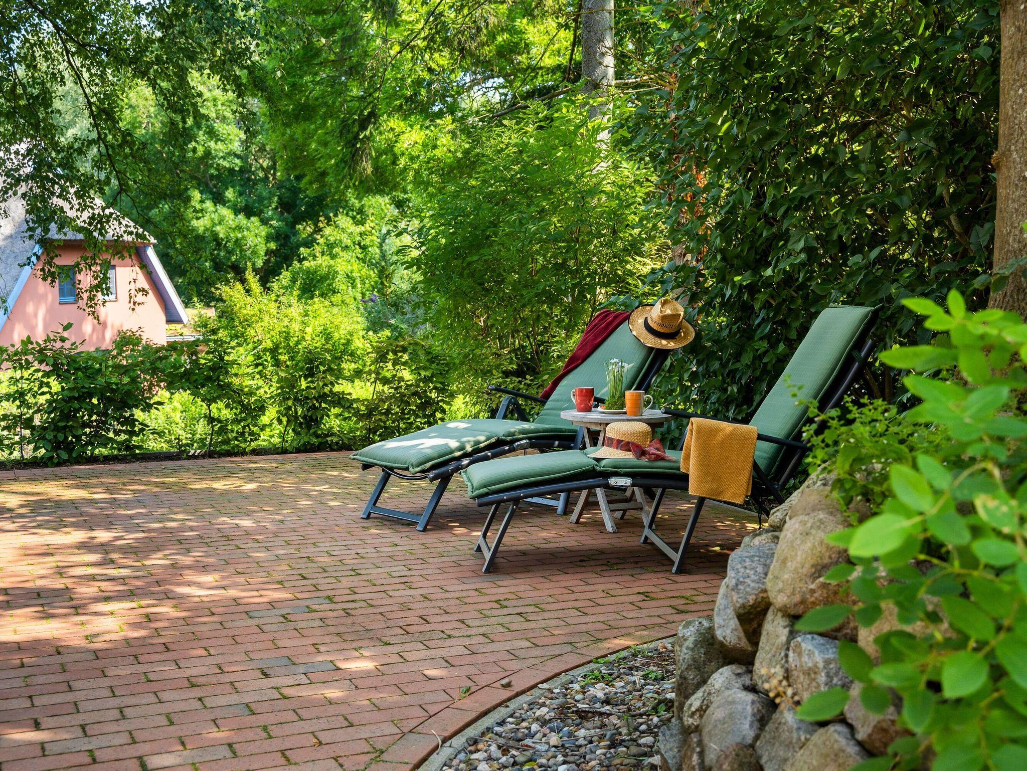 Auf dem gepflegten Gartengrundstück gibt es ein kostenfrei nutzbares Saunahäuschen und eine weitere, etwas erhöht liegende Terrasse. Von hier aus genießen Sie einen wunderbaren Blick in die umgebende Landschaft und bis hinüber zum Jagdschloss Granitz.